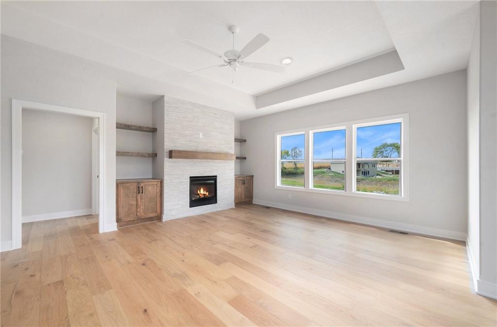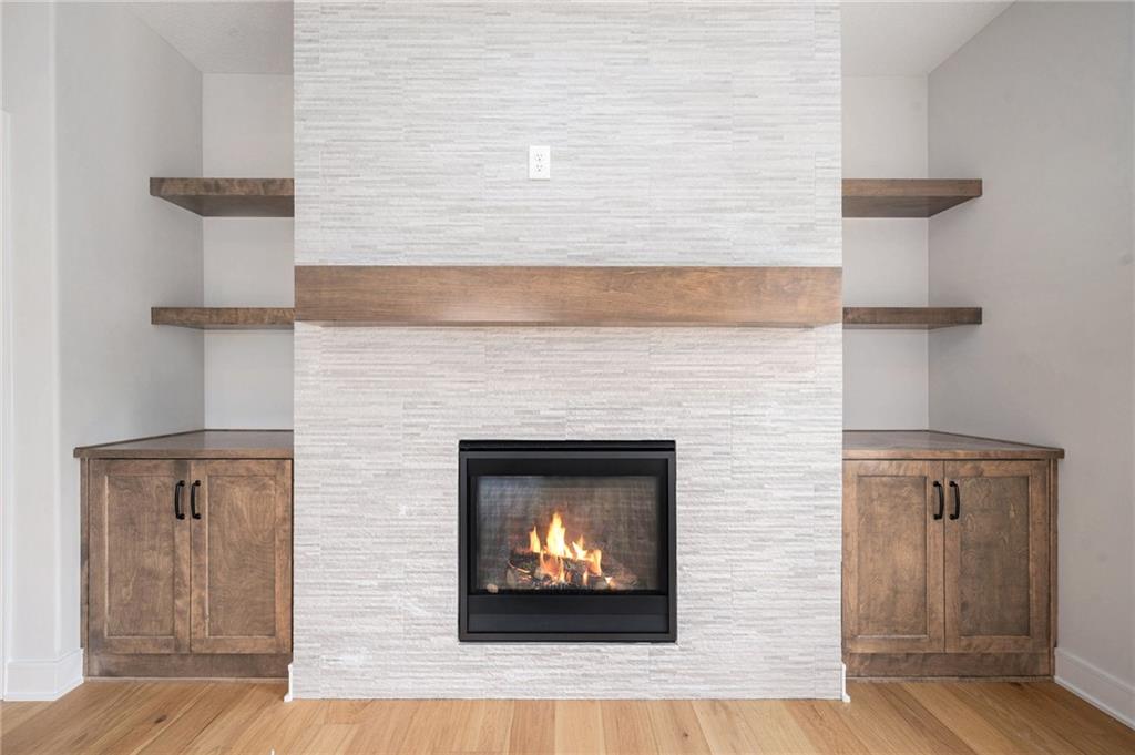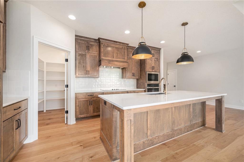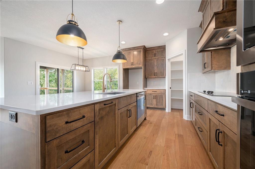 Step inside and be greeted by a custom entryway that sets the tone for the quality and craftsmanship throughout. Down the hall, the open-concept living, kitchen, and dining space is sure to wow you! Light wood floors expand across the main level, highlighting a custom fireplace with decorative shelving and cabinetry. The designer kitchen features a stunning elongated island with seating for casual meals, a walk-in pantry large enough to impress any chef, and a dining area with access to the covered deck—perfect for seamless indoor-outdoor living.
