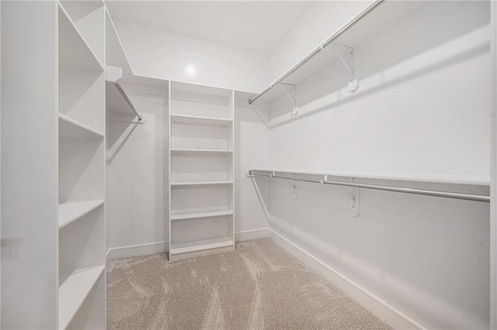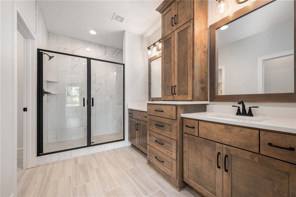 The primary suite offers a private retreat with an exceptional ensuite showcasing dual sink vanities with center storage, a custom walk-in shower, and a massive walk-in closet. Two secondary bedrooms, a full bath, and the laundry room complete the front wing of the home.