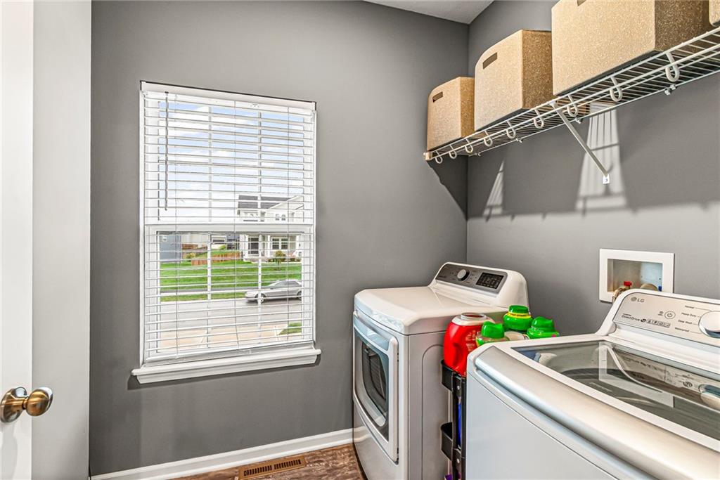 Step inside this nearly new Liberty home where thoughtful design and everyday comfort come together. The main level greets you with a spacious, light-filled living room anchored by a cozy gas fireplace and plush carpet that invites you to kick off your shoes and stay awhile. Just beyond, warm hardwood floors carry through the kitchen and dining area—an open, seamless space perfect for gatherings. The kitchen shines with quartz countertops, stainless steel appliances, ample cabinetry, and a pantry, while the conveniently located laundry room just off the kitchen keeps everything practical and within reach.