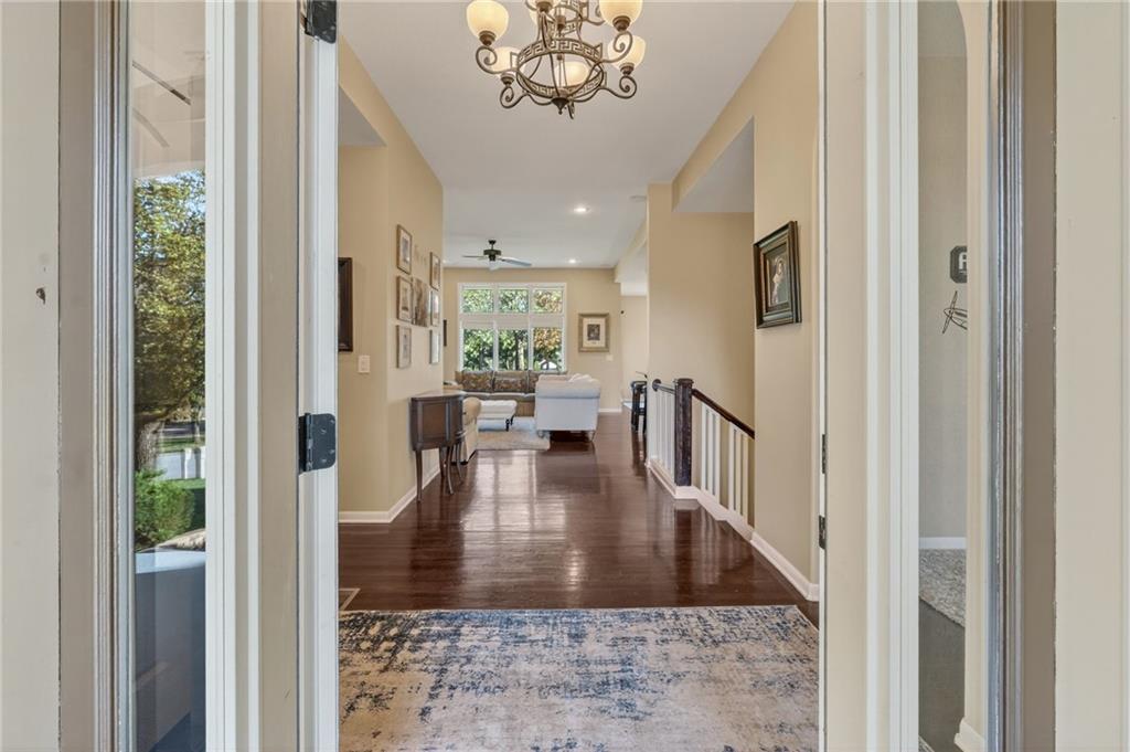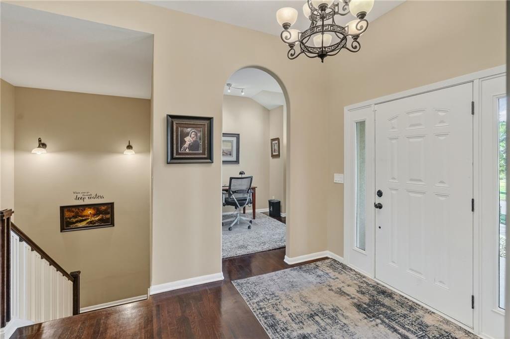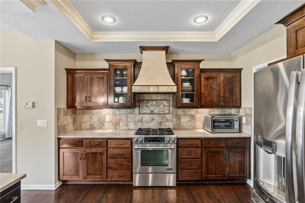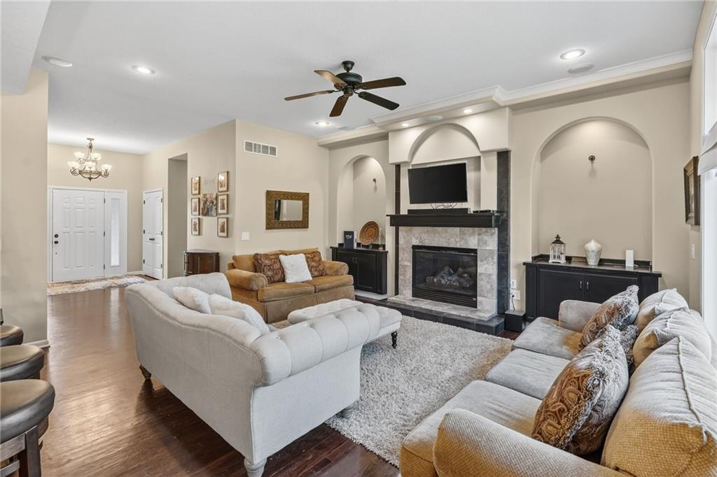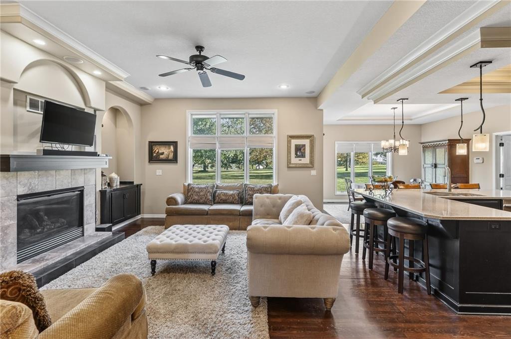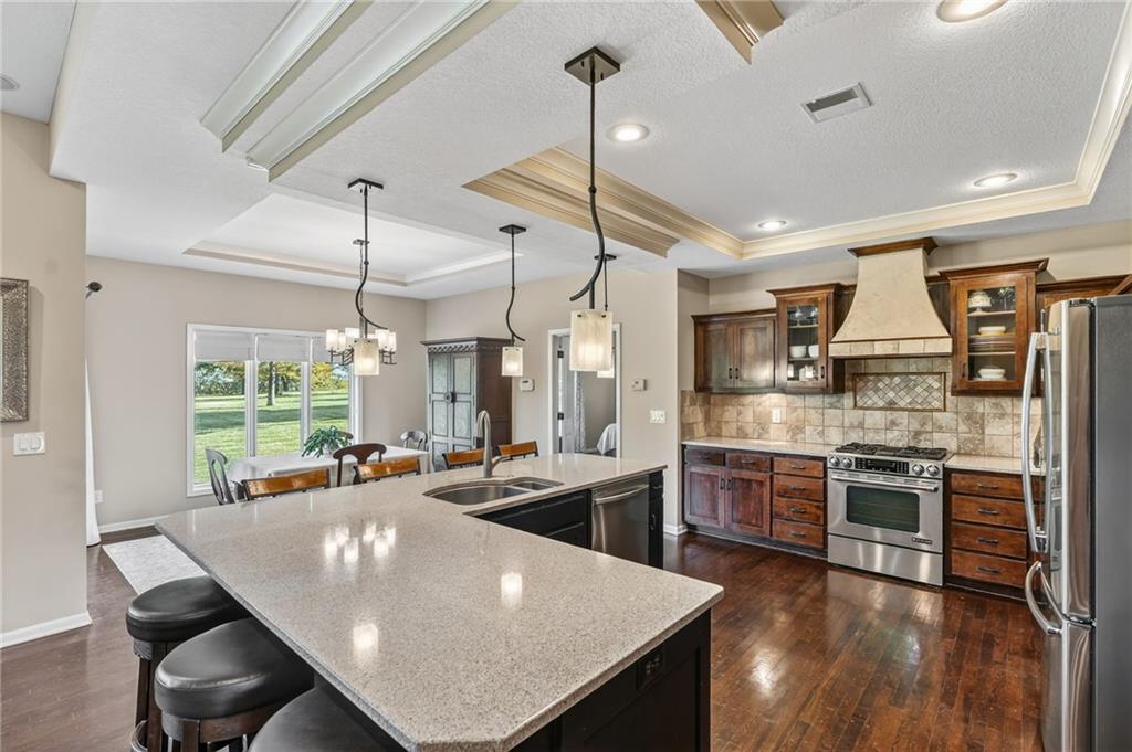 Step inside to an expansive open floor plan where sunlight dances across hardwoods and architectural details—arched entries, trayed ceilings, and a custom fireplace that anchors the heart of the home. The chef’s kitchen is nothing short of spectacular: a massive island with seating for seven or more, top-of-the-line gas range and hood, abundant custom cabinetry, and endless counter space that invites gathering, creating, and connection.