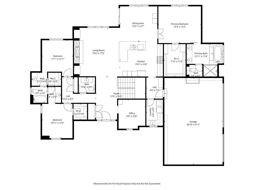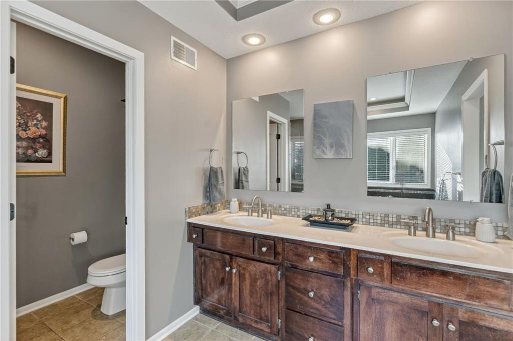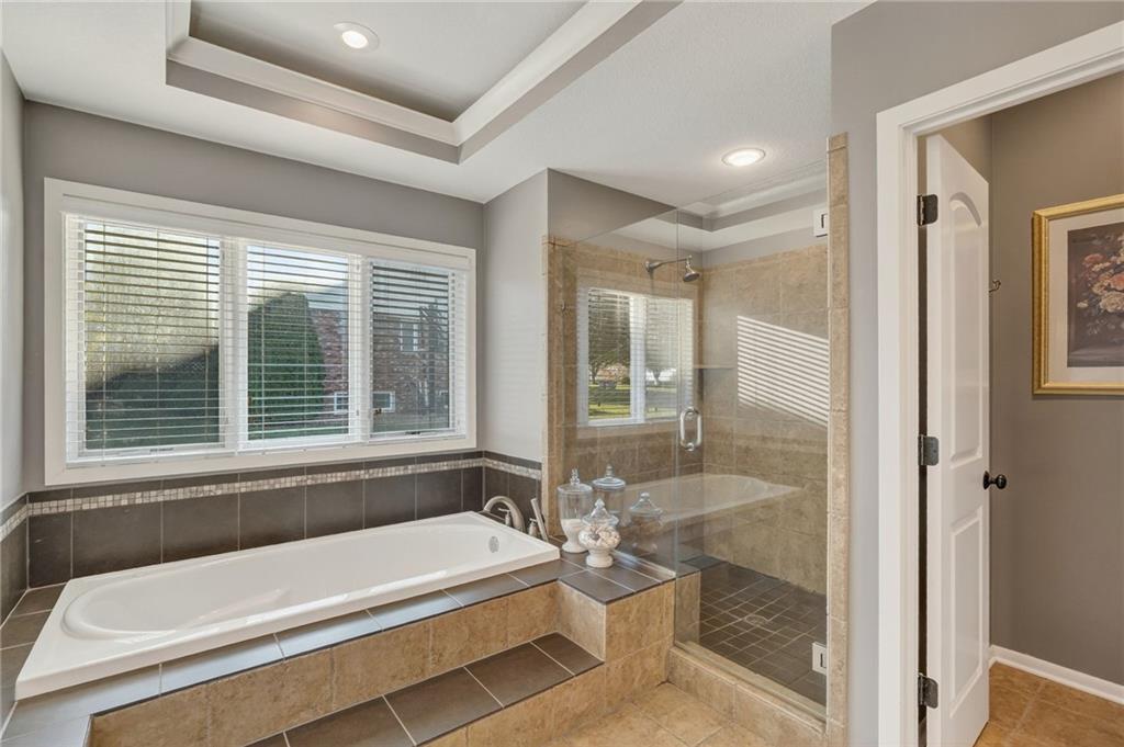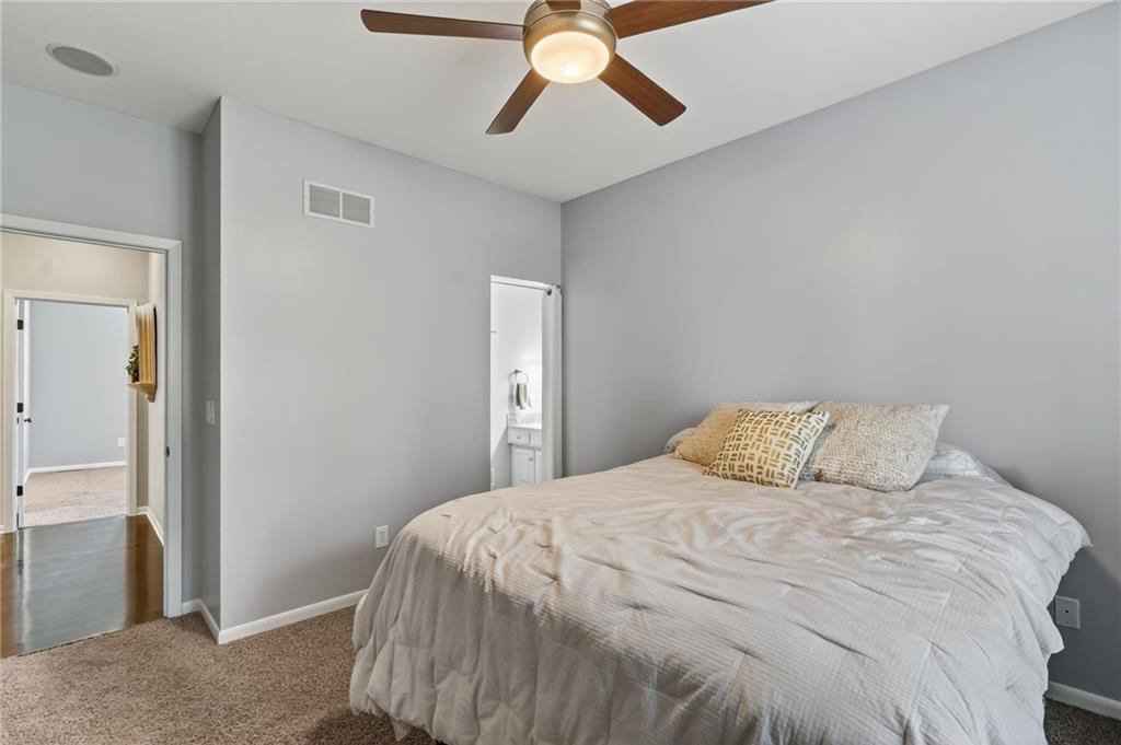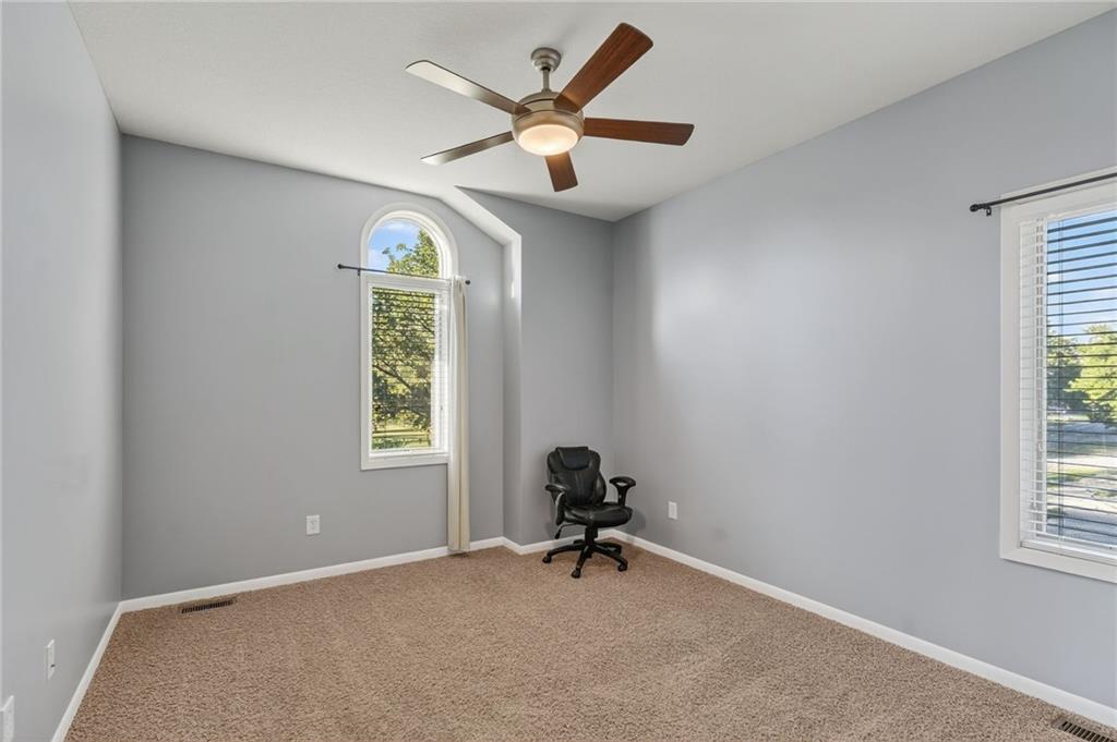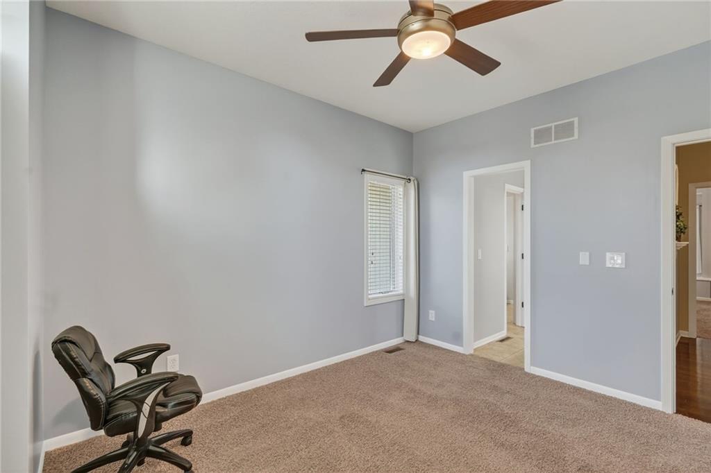 On the main level, discover three spacious bedrooms, a dedicated office, and the convenience of main-floor laundry. The primary suite feels like a private retreat—complete with a spa-inspired bath featuring a sliding barn door, jetted tub, dual shower heads, double sinks, and an enviable walk-in closet. Two additional bedrooms share a beautifully appointed Jack-and-Jill bath, each with its own walk-in closet.