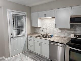• Equipment Dishwasher, Disposal, Dryer, Microwave, Refrigerator, Electric Range, Stainless Steel Appliance(s), Washer