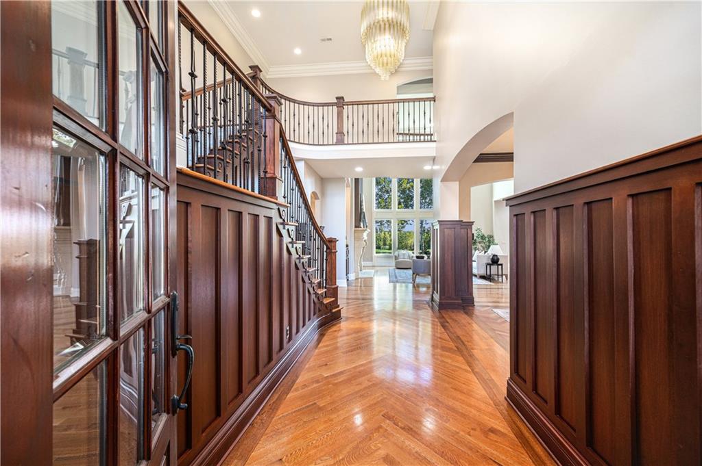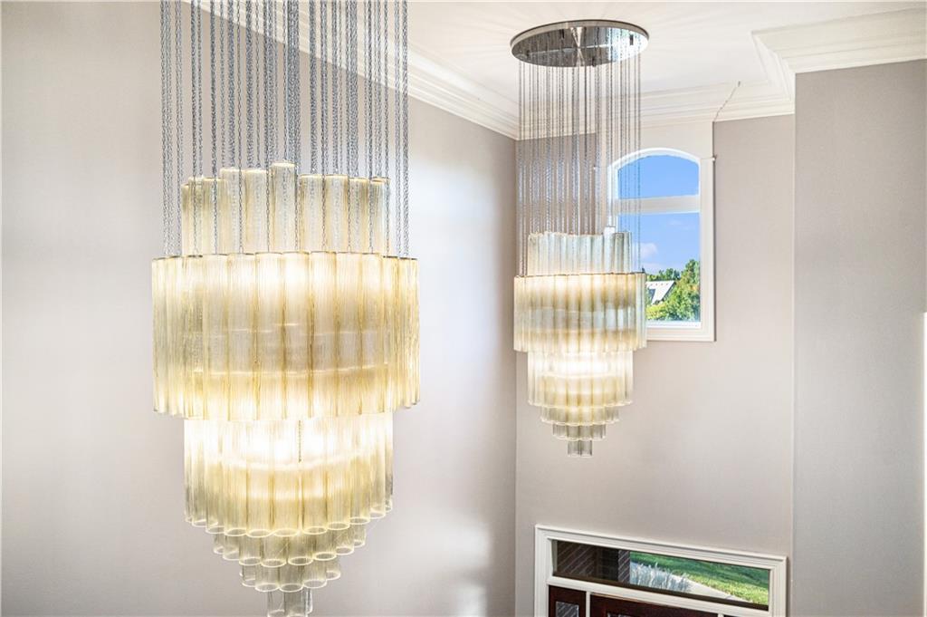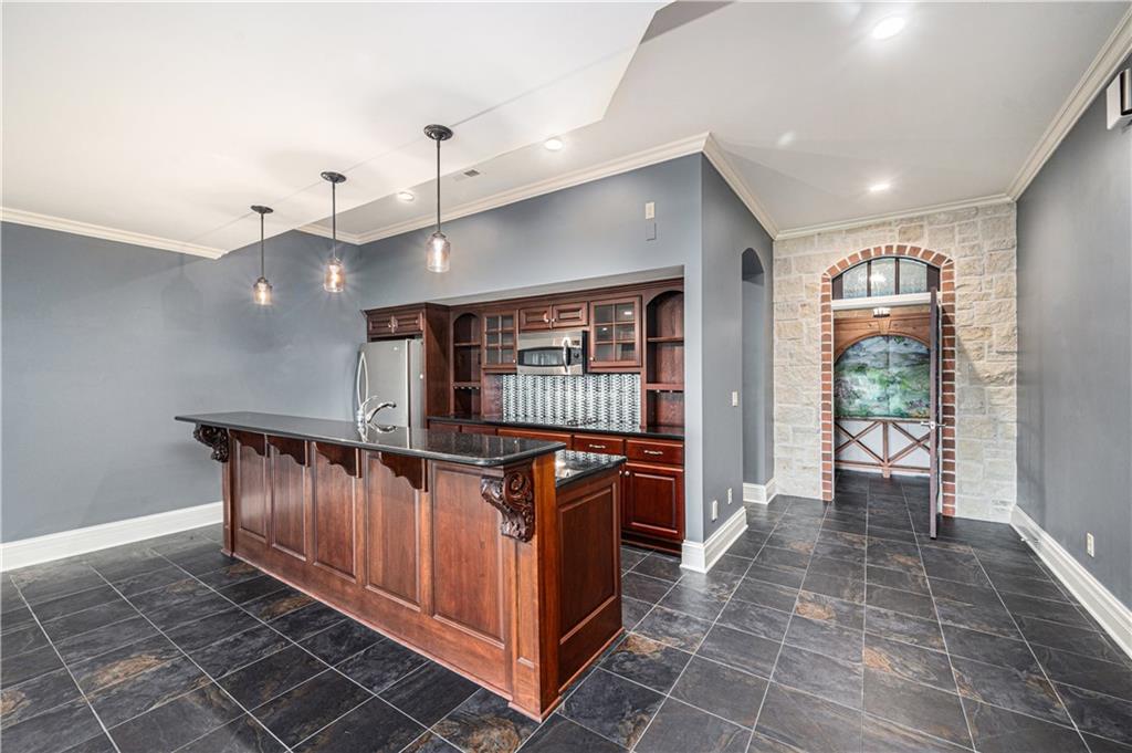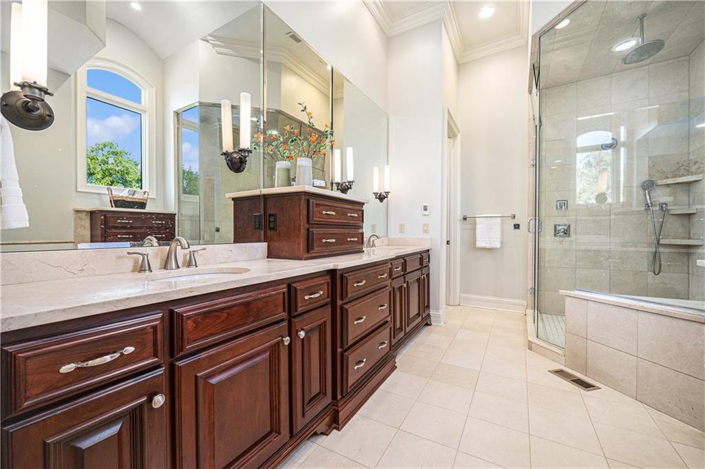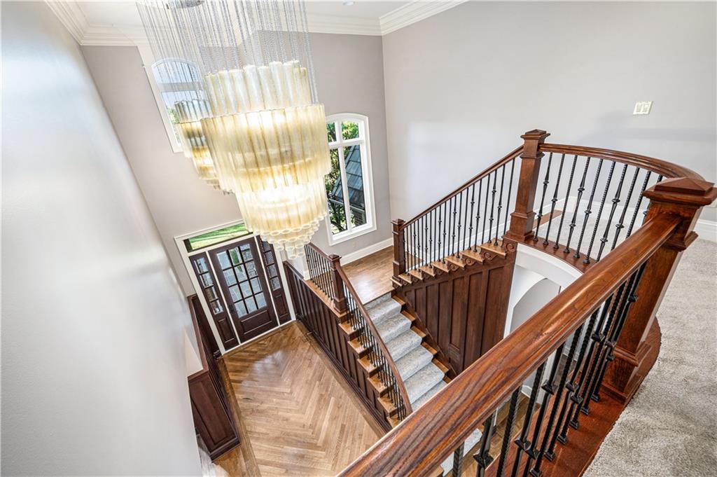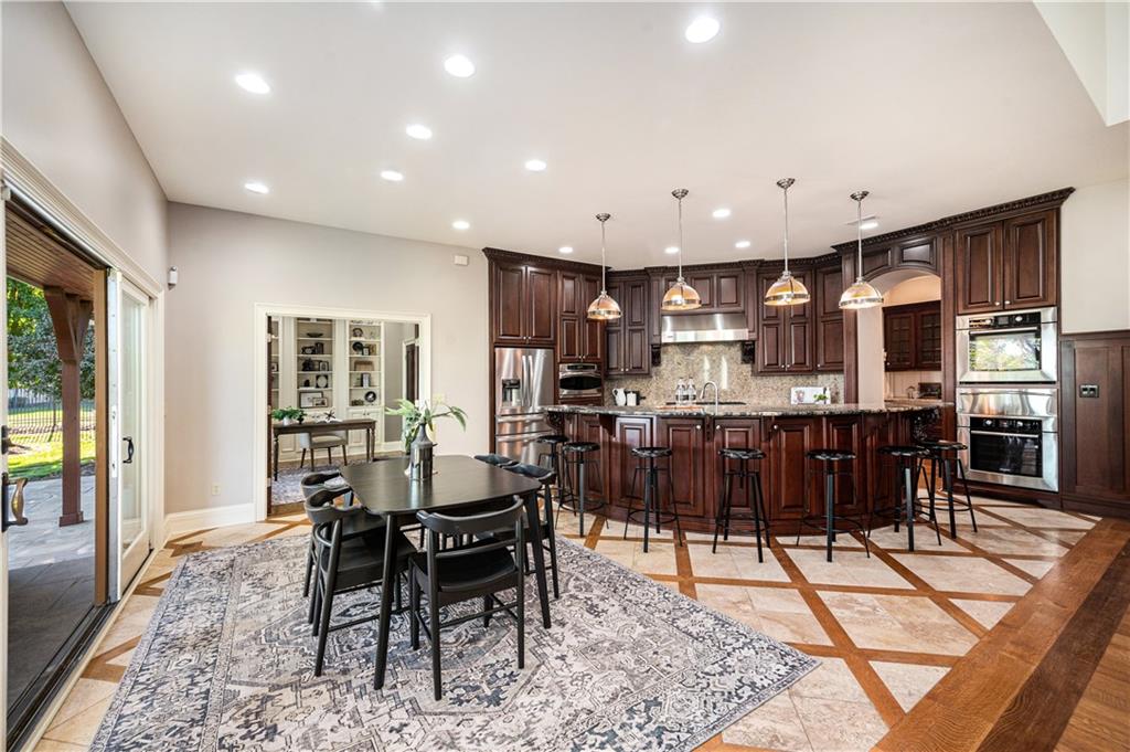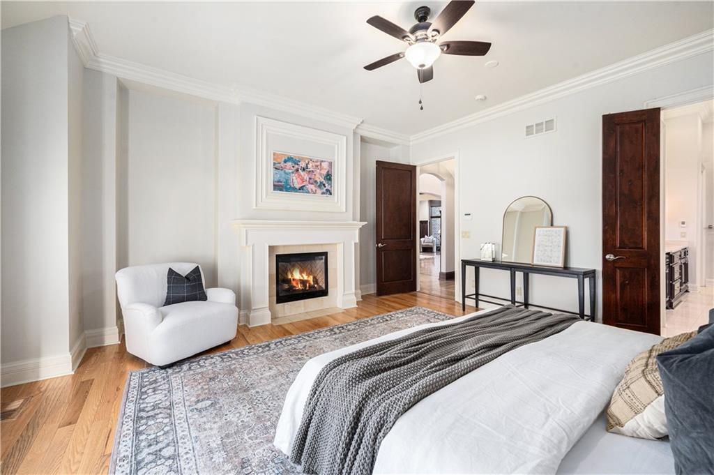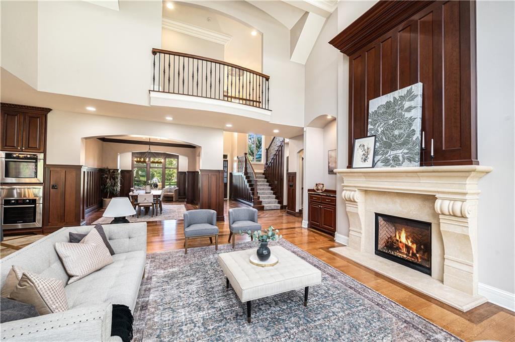 As you step through the soaring entry, you’ll be greeted by an open floor plan, designer chandeliers, exquisitely detailed trim, beautiful hardwoods, and crown molding. The gourmet kitchen is a chef’s dream, featuring exotic granite counters, soft-close cabinets and drawers, two new Bosch dishwashers, a Therador 6-burner gas range with griddle, Viking hood, Bosch double oven and warming drawer, a new refrigerator, beverage refrigerator, and a walk-in pantry. Slide open the glass doors to your outdoor oasis — a covered porch with a gas fireplace, expansive patio, and space to grill and relax. The main floor primary suite is a true retreat, complete with its own fireplace, frame TV, heated tile floors, a jetted tub, walk-in shower with glass surround, and walk-in closet. On the mail level there is also a study with a full bath, along with laundry area.