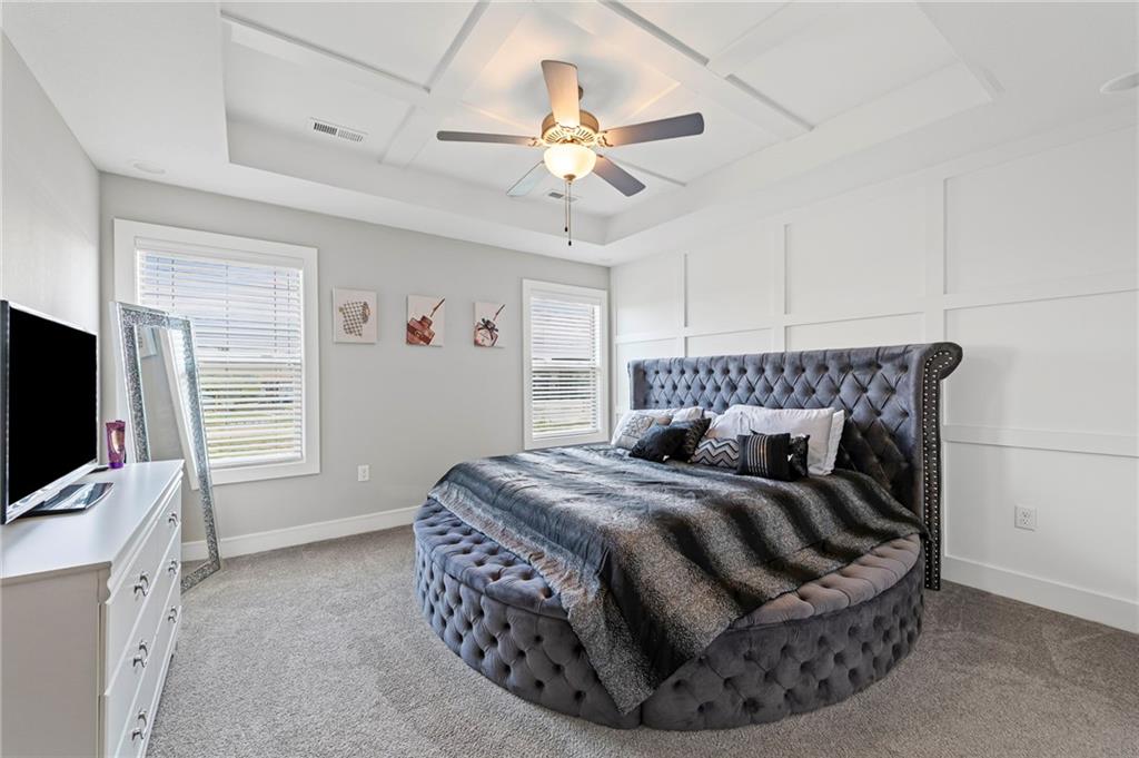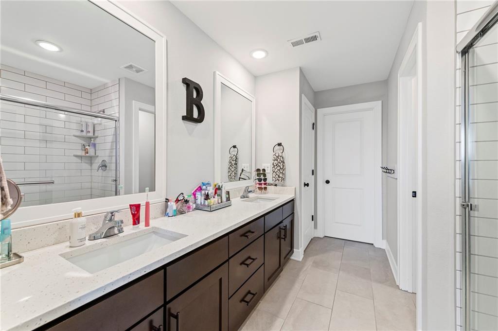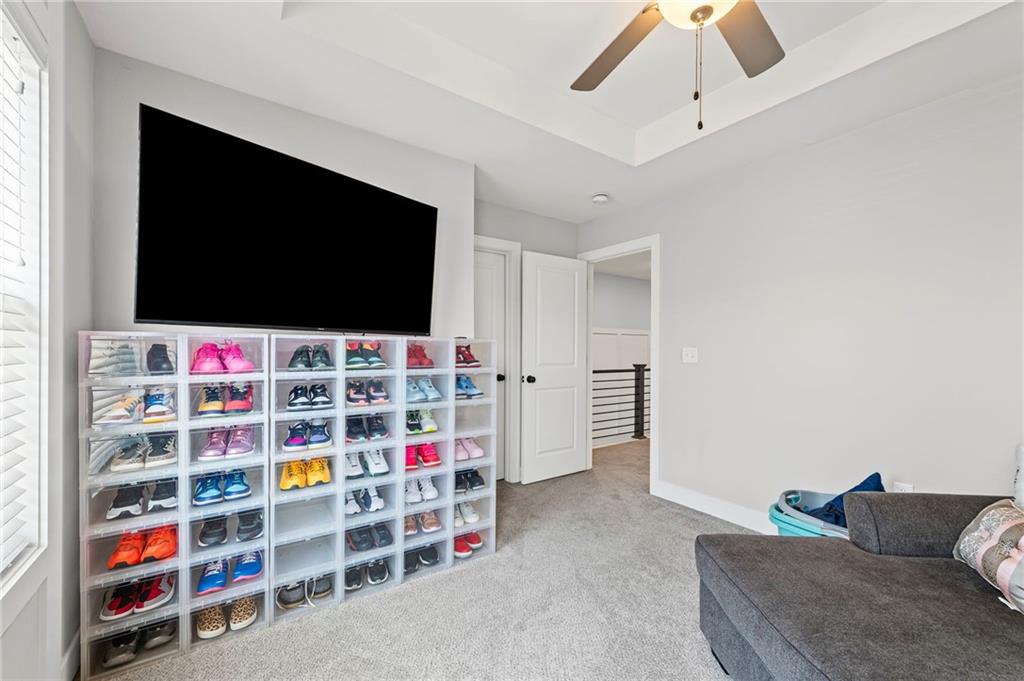 The private primary suite, complete distinguished millwork, a walk-in closet with professional organization, and an en suite bathroom with a walk-in shower. In addition to the private primary suite there are two additional bedrooms with large organized closets, a full bathroom with a tub/shower combo. A conveniently located laundry room is directly accessible to all the bedrooms.