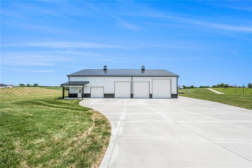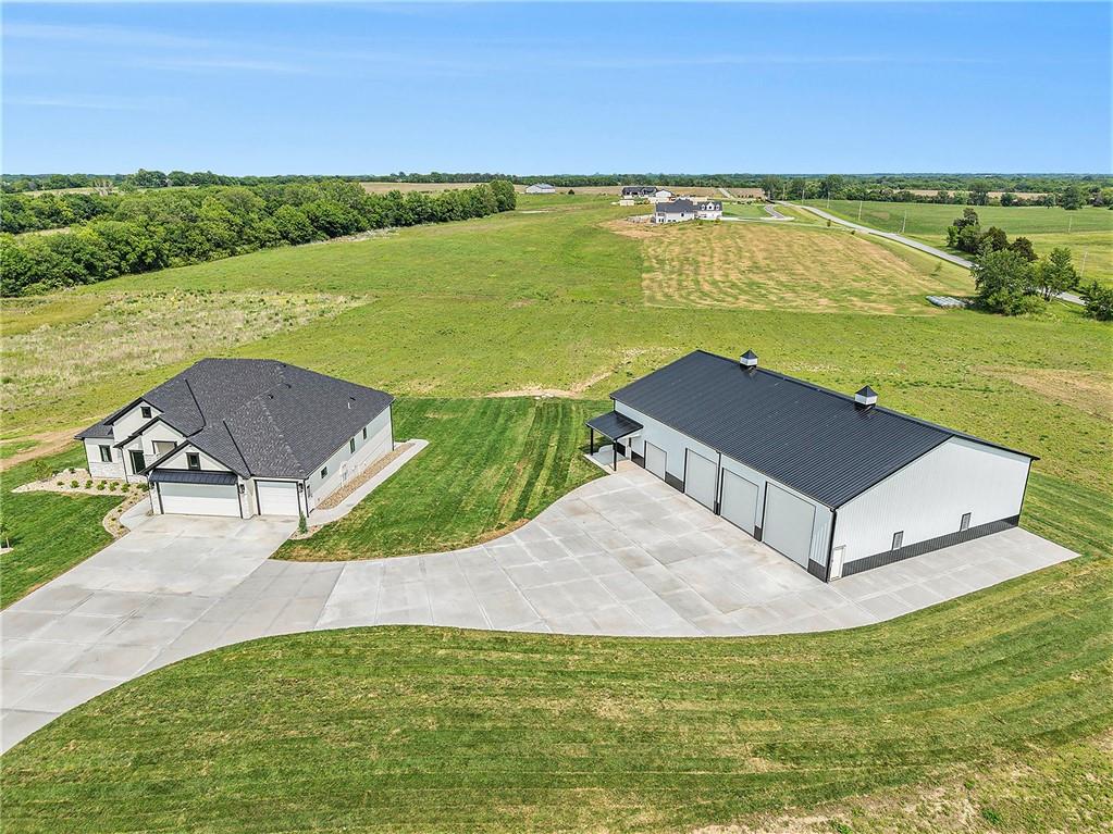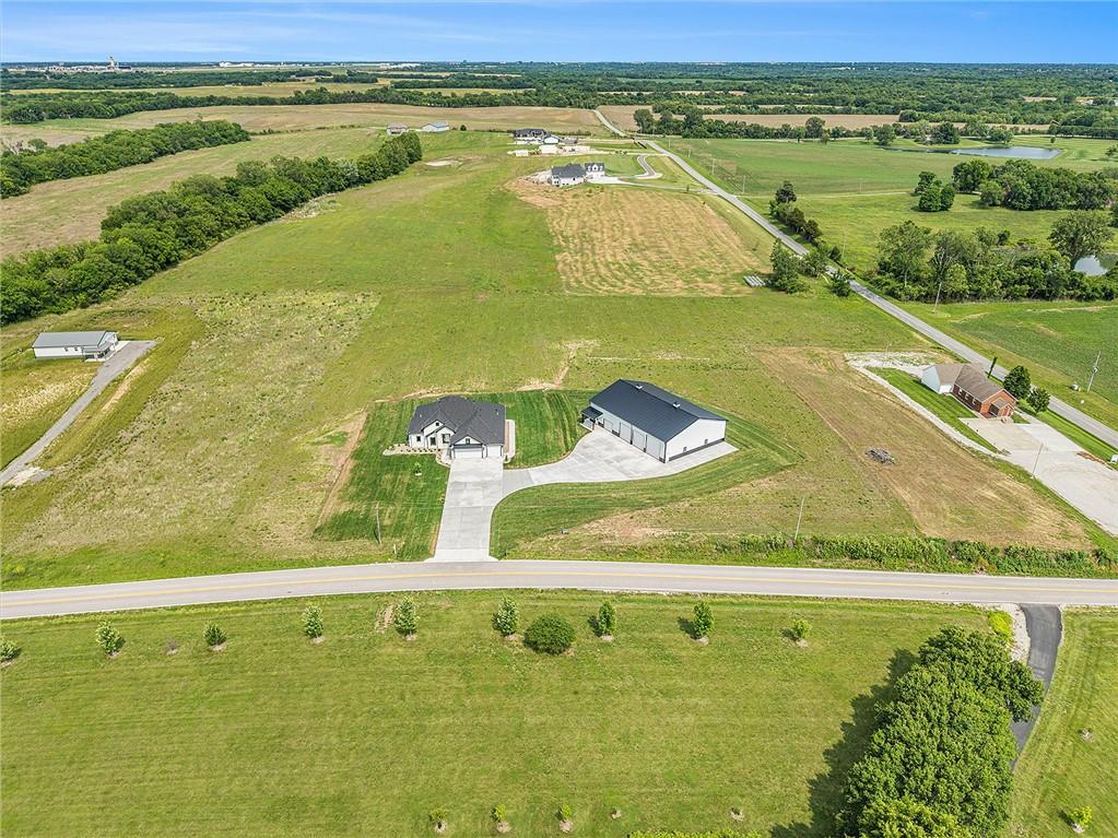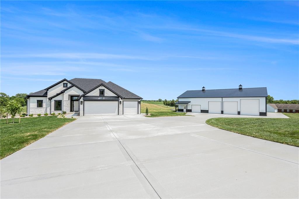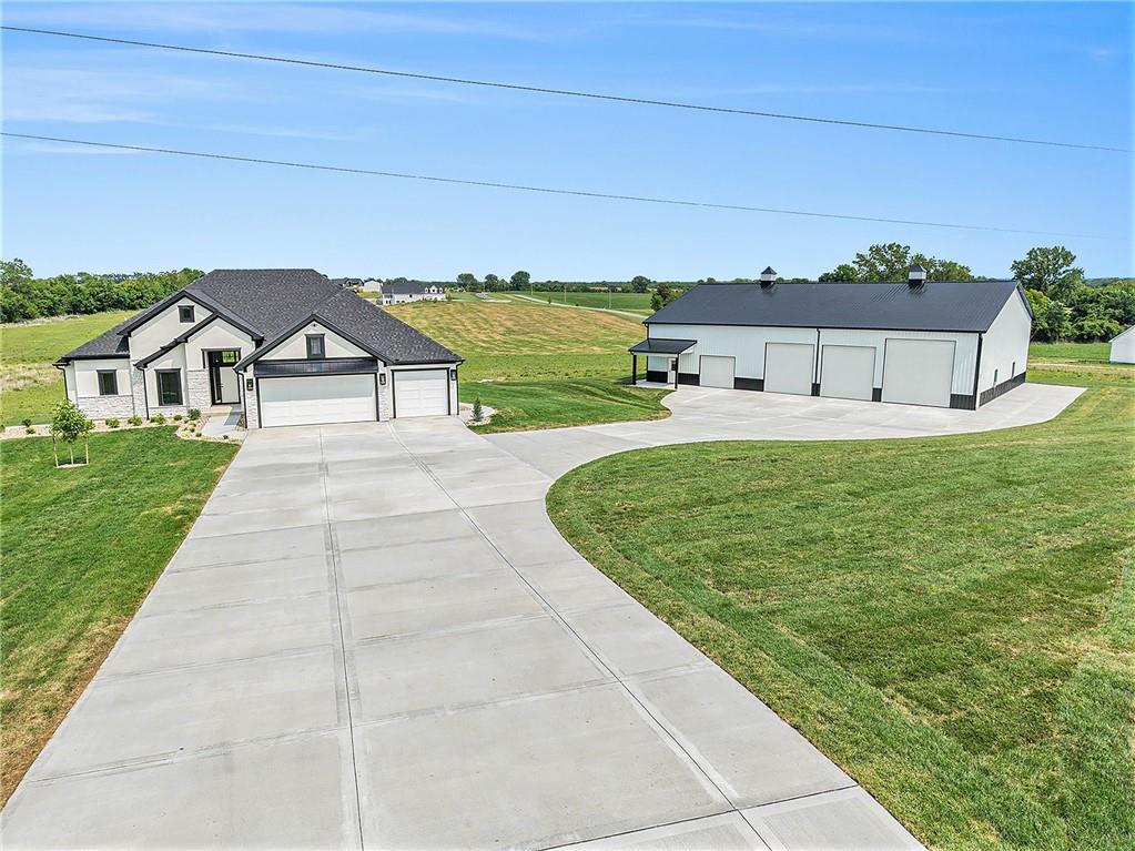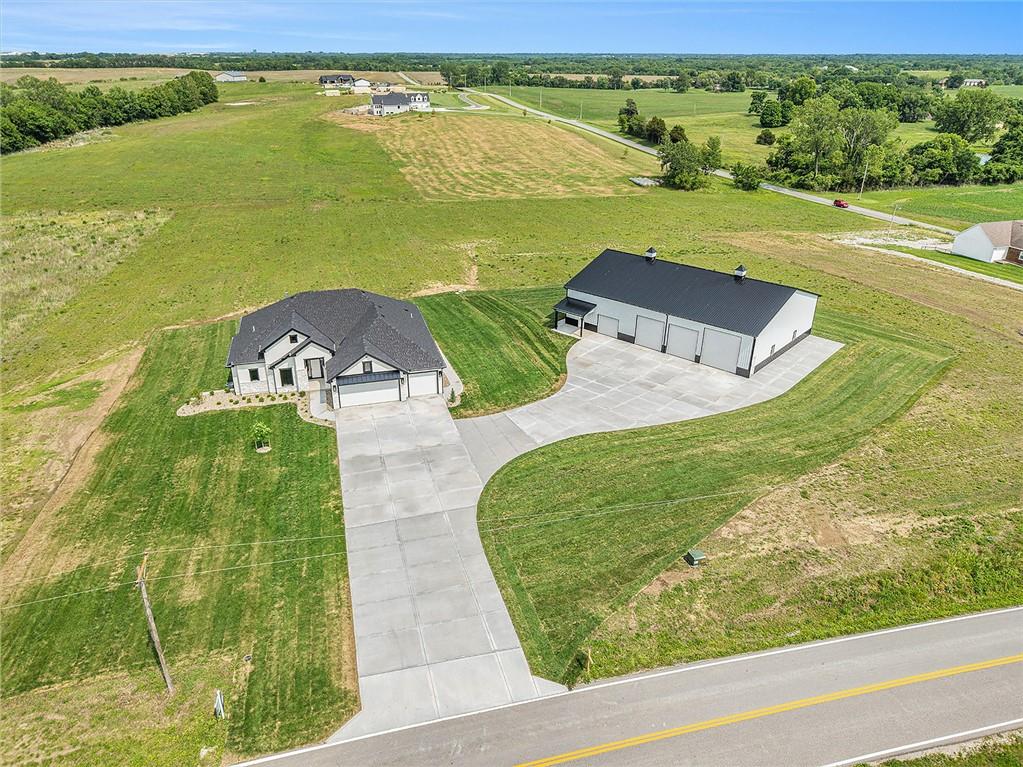 Want to be out of the city, yet not to far from amenities and freeway access? Need an outbuilding for your business or just a car enthusiast? Looking for possible multi generational housing? Brand new construction home with main level living and soft contemporary finishes awaits you on 6.8 acres of Platte County land. The main level boasts a light, bright kitchen with an expansive island of quartz countertops and matte black appliances. The primary suite and private secondary bedroom/full bath and an office or den complete the main floor with all solid surface flooring throughout. The lower level includes 2 bedrooms and 2 full baths plus a spacious rec room and a walk up bar area. Plenty of storage or possible future finish for gym or office in the lower level. A 4600 sq ft outbuilding with 4 garage door openings provides additional space for RV or multiple car garages. The building is also plumbed for a 1 bed, 1.5 bath apartment or perfect for a business office. Electrical is wired for future pool, hot tub or generator additions. Home is nearly finished and professional photos will follow after completion.