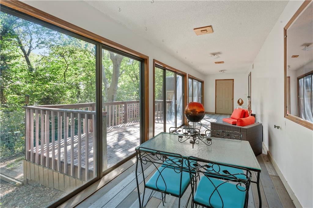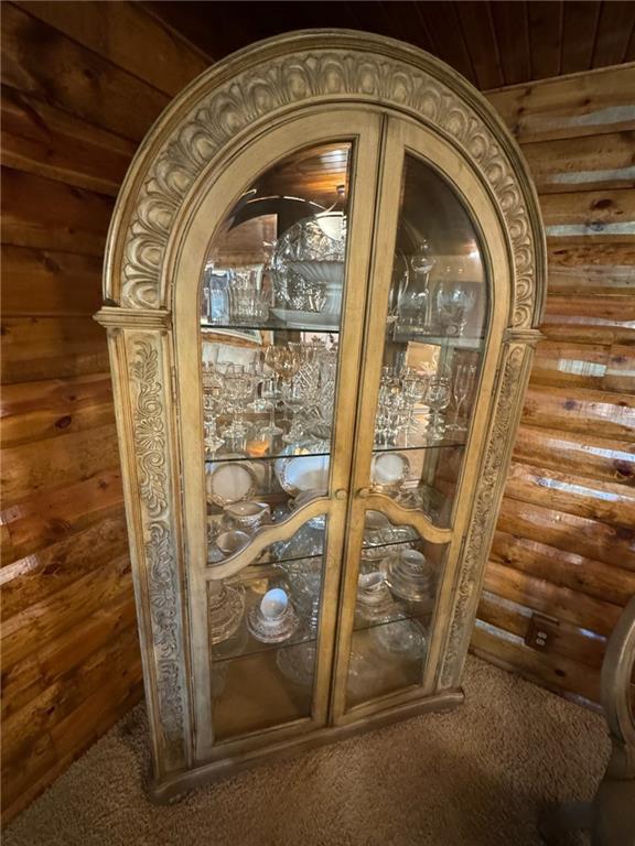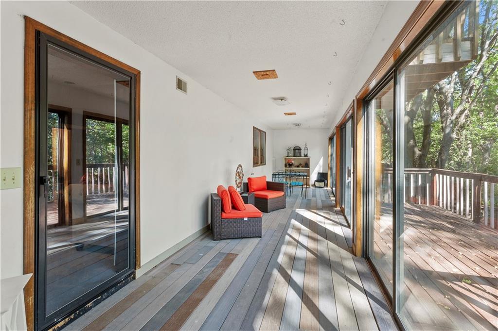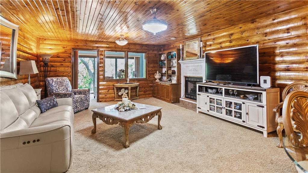 The spacious main floor features an inviting great room with beautiful logwood walls and ceiling, a cozy gas-burning fireplace, and built-in shelving. You’ll love the two sunrooms that provide serene views of the sprawling half-acre wooded lot.