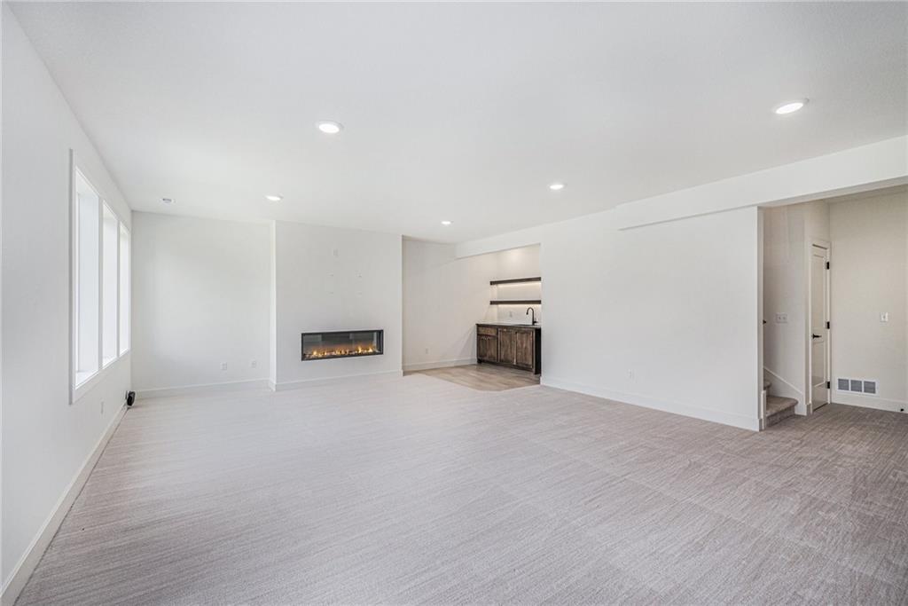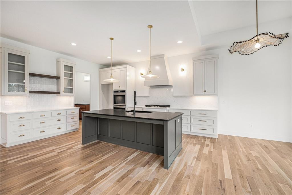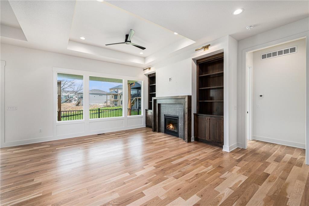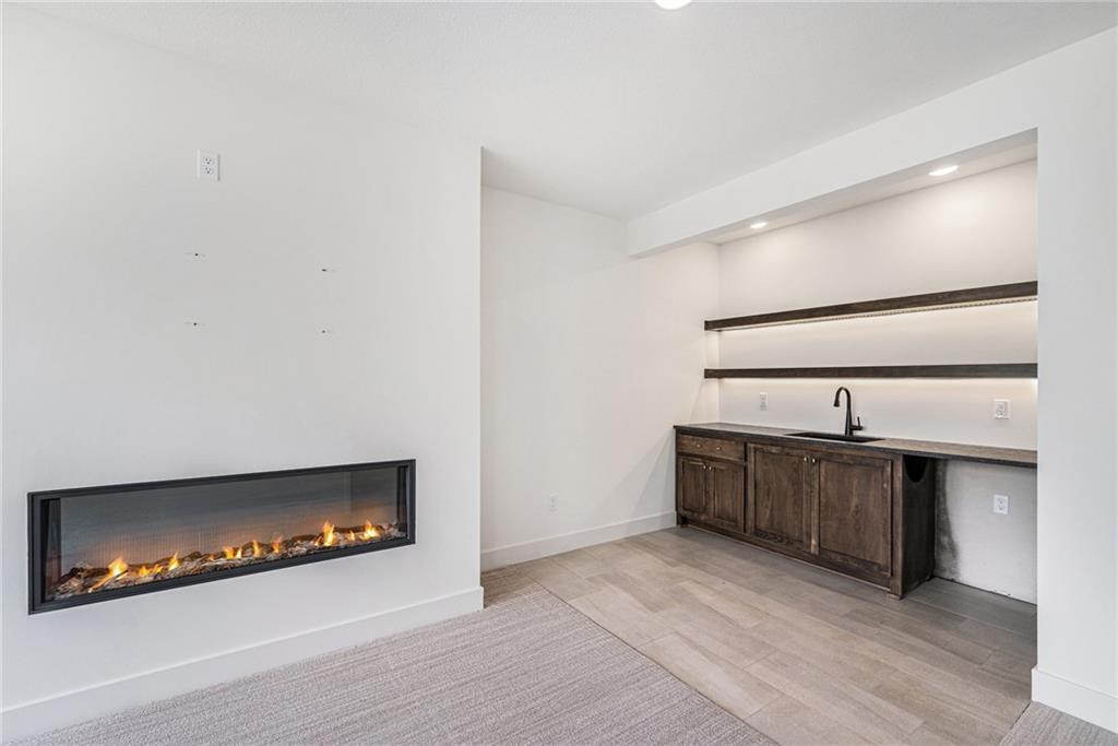 Custom 4 bedroom, 3 bath Fairfield reverse 1.5 story home built by Inspired Homes. Greeted into a foyer with tray ceilings. First bedroom and full bath at the front of home perfect for a guest space or home office. Flow into an open main level with 10 ft ceilings and 8 ft doorways. Upgraded kitchen with over-sized island, walk-in pantry, coffee bar, custom vent hood, quartz countertops & backsplash, Frigidaire gallery appliances including dishwasher, dual ovens, & 5 burner gas range. Home features an upgraded lighting and hardware package. Spacious living room w/ custom fireplace, & built-ins. Walk out to a 10×20 covered deck. Primary bedroom w/ walk-in closet & en-suite bath. Bath complete w/ tiled floors, zero entry walk-in shower, & dual vanities. Lower level hosts 2 bedrooms, full bathroom, family room, & wet bar. Contemporary exterior w/ white stone & copper gutters. White oak hardwood floors on main level. Neighborhood amenities include swimming pool, play area, & walking trail. Platte County School District.