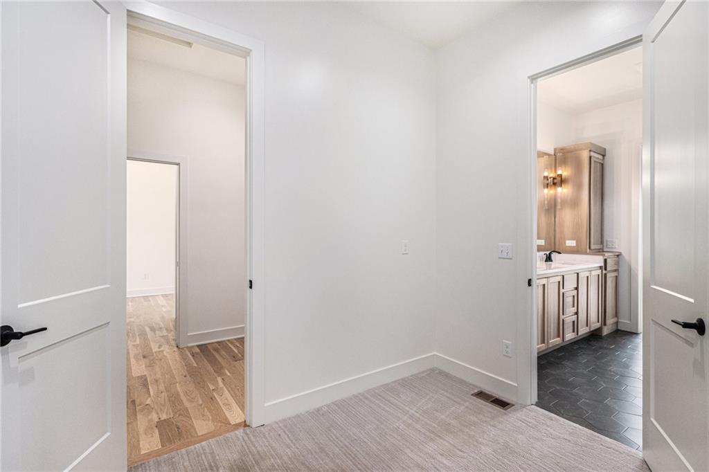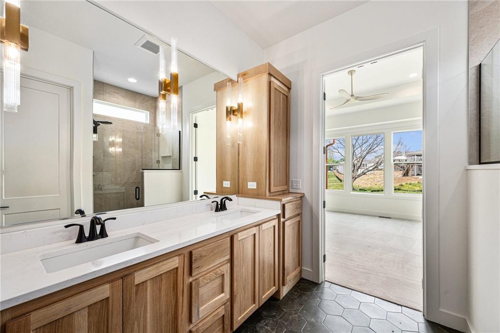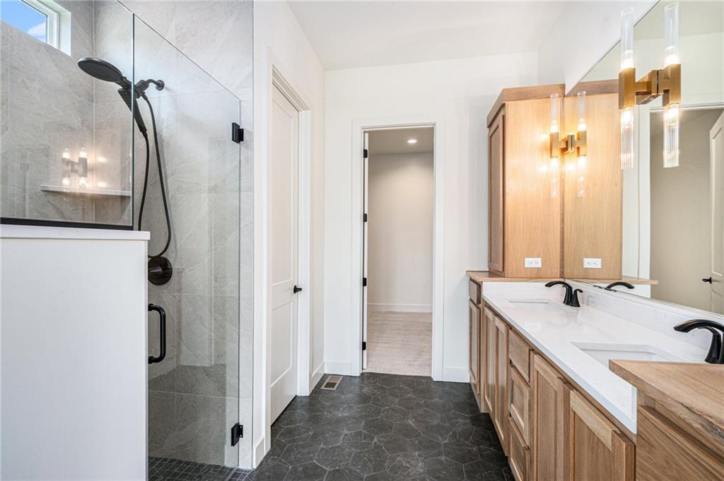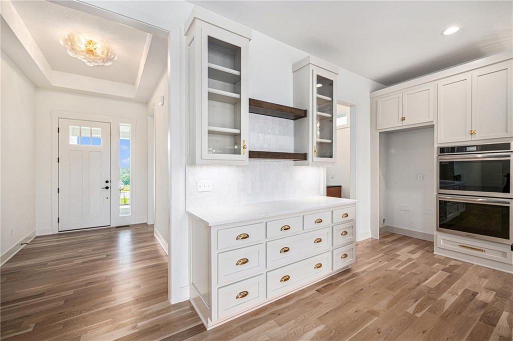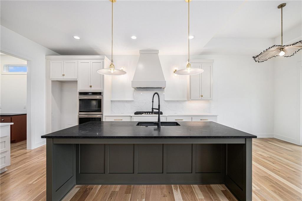 Custom 4 bedroom, 3 bath Fairfield reverse 1.5 story home built by Inspired Homes. Greeted into a foyer with tray ceilings. First bedroom and full bath at the front of home perfect for a guest space or home office. Flow into an open main level with 10 ft ceilings and 8 ft doorways. Upgraded kitchen with over-sized island, walk-in pantry, coffee bar, custom vent hood, quartz countertops & backsplash, Frigidaire gallery appliances including dishwasher, dual ovens, & 5 burner gas range. Home features an upgraded lighting and hardware package. Spacious living room w/ custom fireplace, & built-ins. Walk out to a 10×20 covered deck. Primary bedroom w/ walk-in closet & en-suite bath. Bath complete w/ tiled floors, zero entry walk-in shower, & dual vanities. Lower level hosts 2 bedrooms, full bathroom, family room, & wet bar. Contemporary exterior w/ white stone & copper gutters. White oak hardwood floors on main level. Neighborhood amenities include swimming pool, play area, & walking trail. Platte County School District.