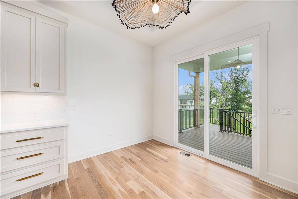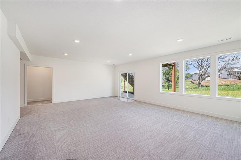 Seller offering $10,000 towards buyers closing costs with an acceptable offer! Custom 4 bedroom, 3 bath Fairfield reverse 1.5 story home built by Inspired Homes. Greeted into a foyer with tray ceilings. First bedroom and full bath at the front of home perfect for a guest space or home office. Flow into an open main level with 10 ft ceilings and 8 ft doorways. Upgraded kitchen with over-sized island, walk-in pantry, coffee bar, custom vent hood, quartz countertops & backsplash, Frigidaire gallery appliances including dishwasher, dual ovens, & 5 burner gas range. Home features an upgraded lighting and hardware package. Spacious living room w/ custom fireplace, & built-ins. Walk out to a 10×20 covered deck. Primary bedroom w/ walk-in closet & en-suite bath. Bath complete w/ tiled floors, zero entry walk-in shower, & dual vanities. Lower level hosts 2 bedrooms, full bathroom, family room, & wet bar. Contemporary exterior w/ white stone & copper gutters. White oak hardwood floors on main level. Neighborhood amenities include swimming pool, play area, & walking trail. Platte County School District.