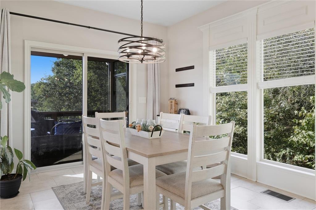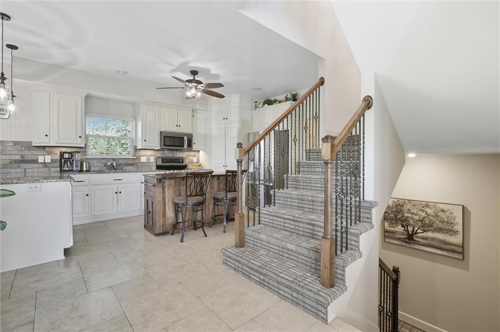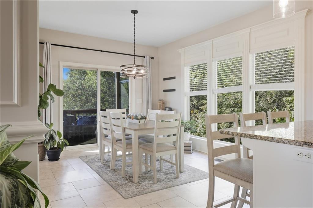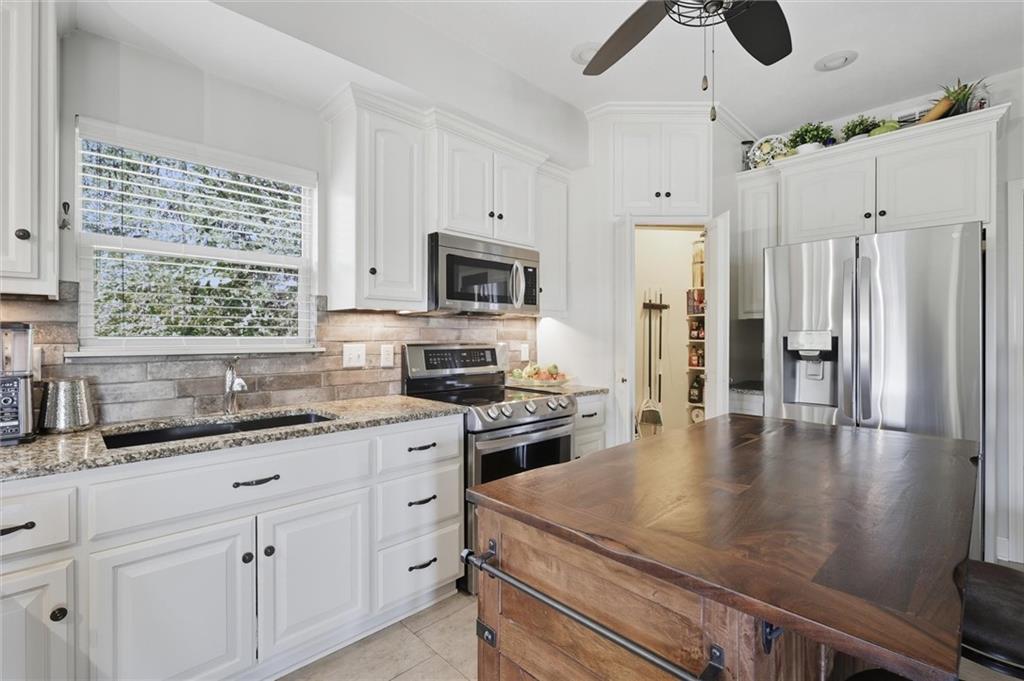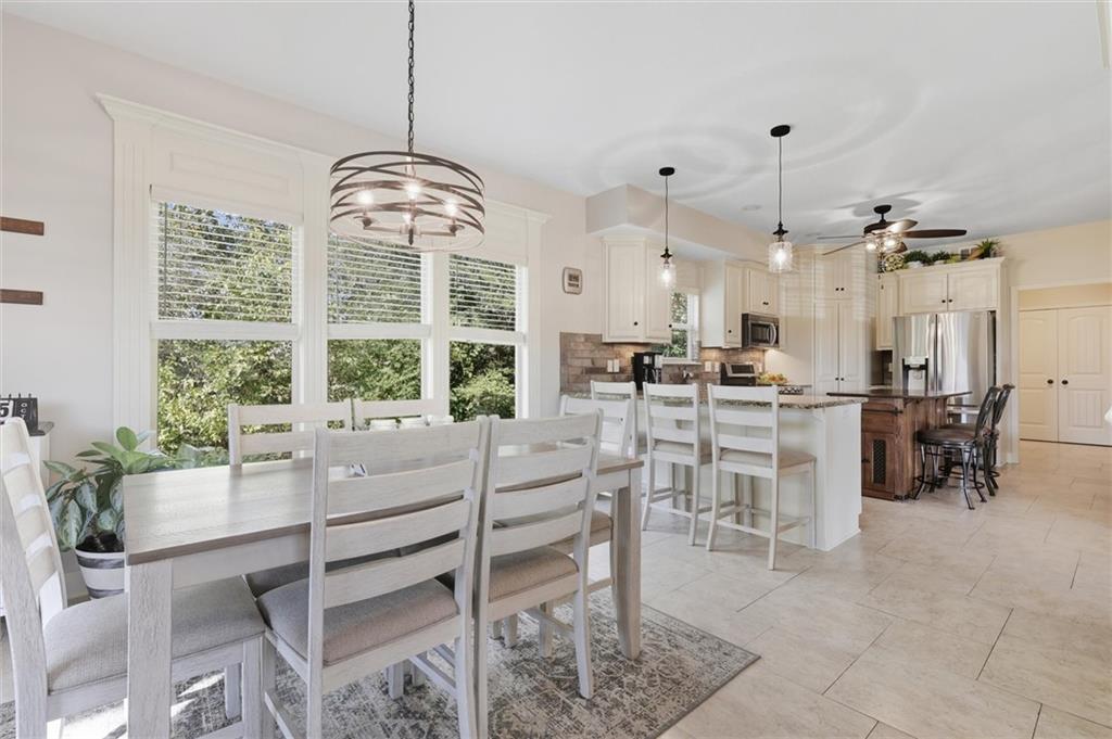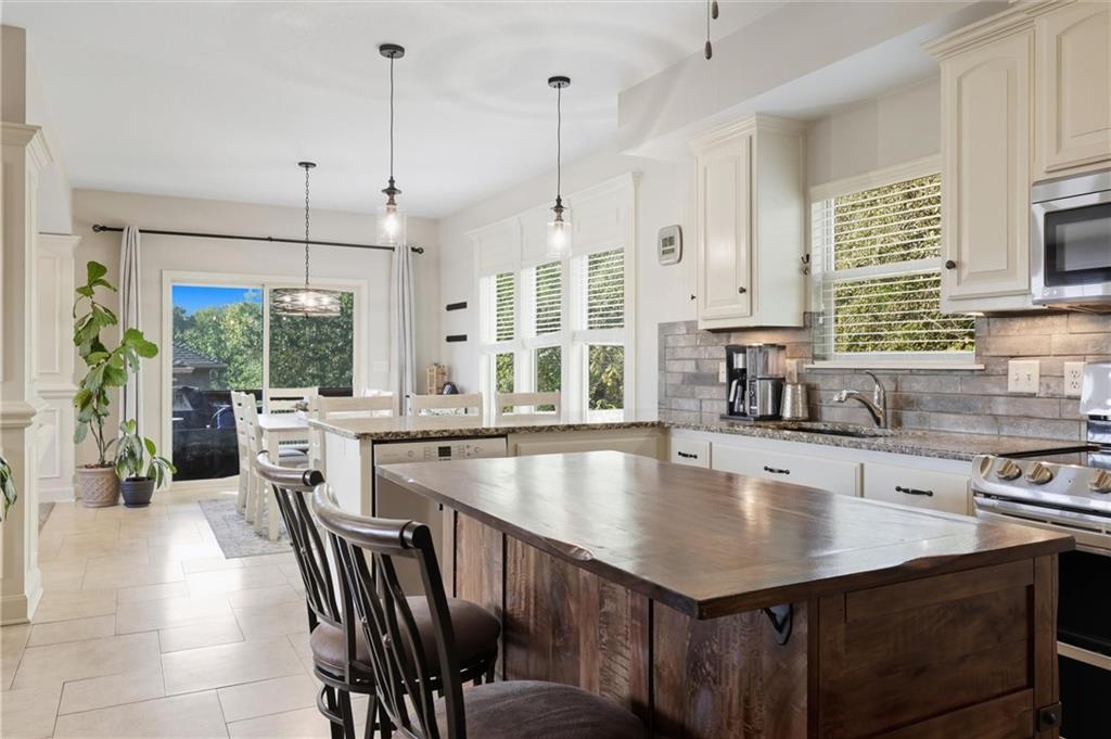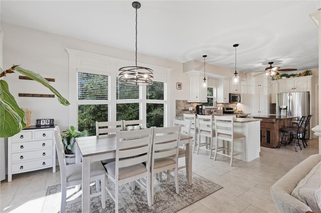 The kitchen offers granite countertops, a breakfast bar, stainless steel appliances, and a deep walk in pantry, combining beauty and functionality. The adjacent dining area flows seamlessly into the living space, creating an ideal setting for gatherings.