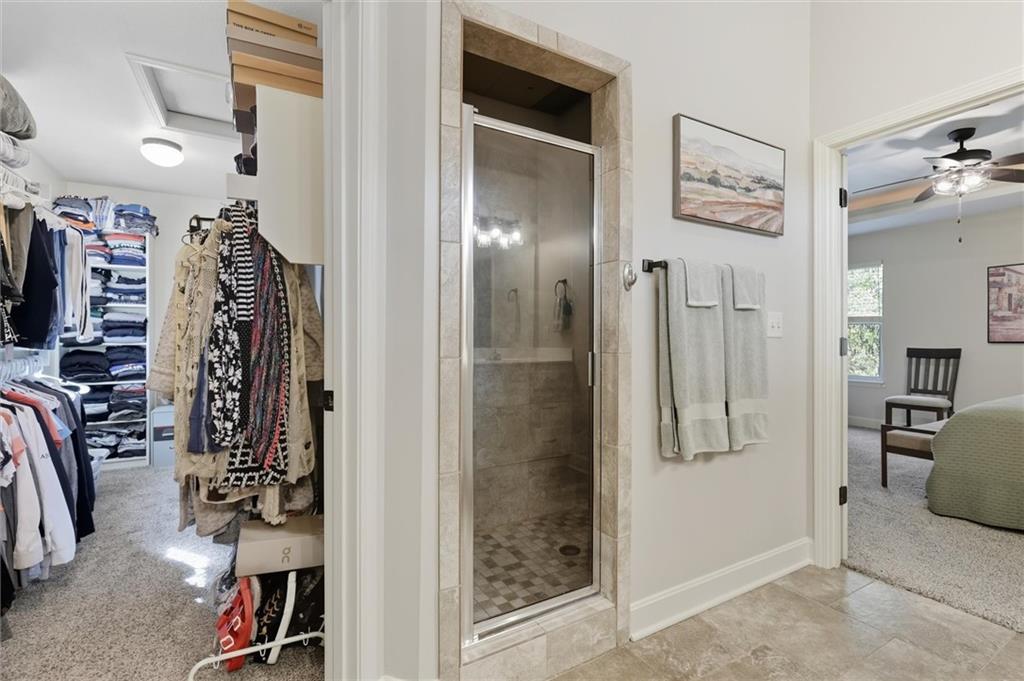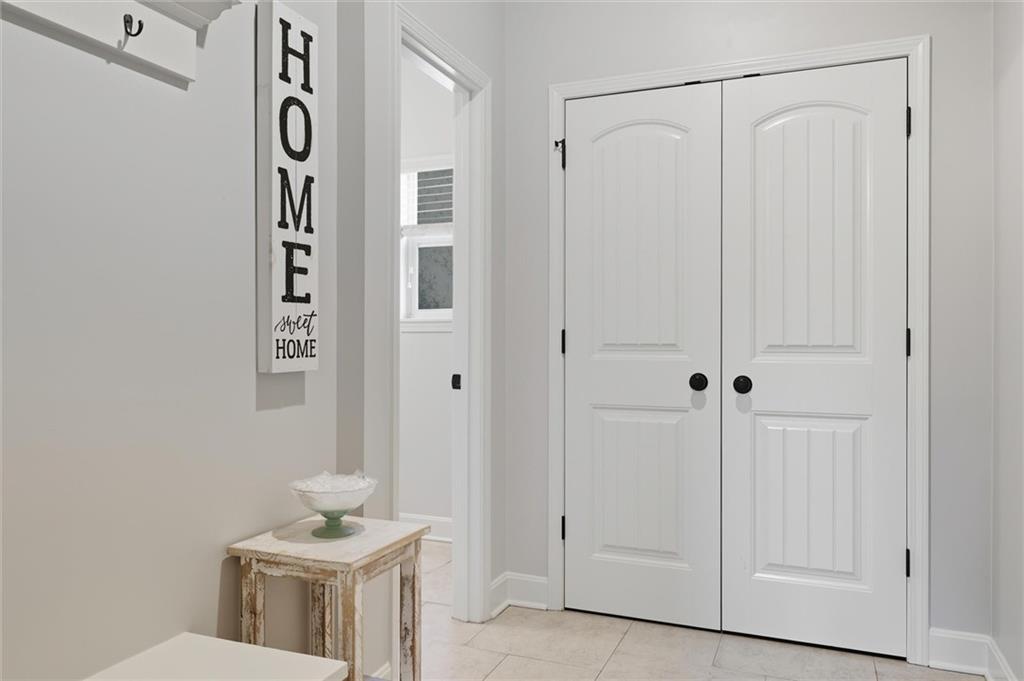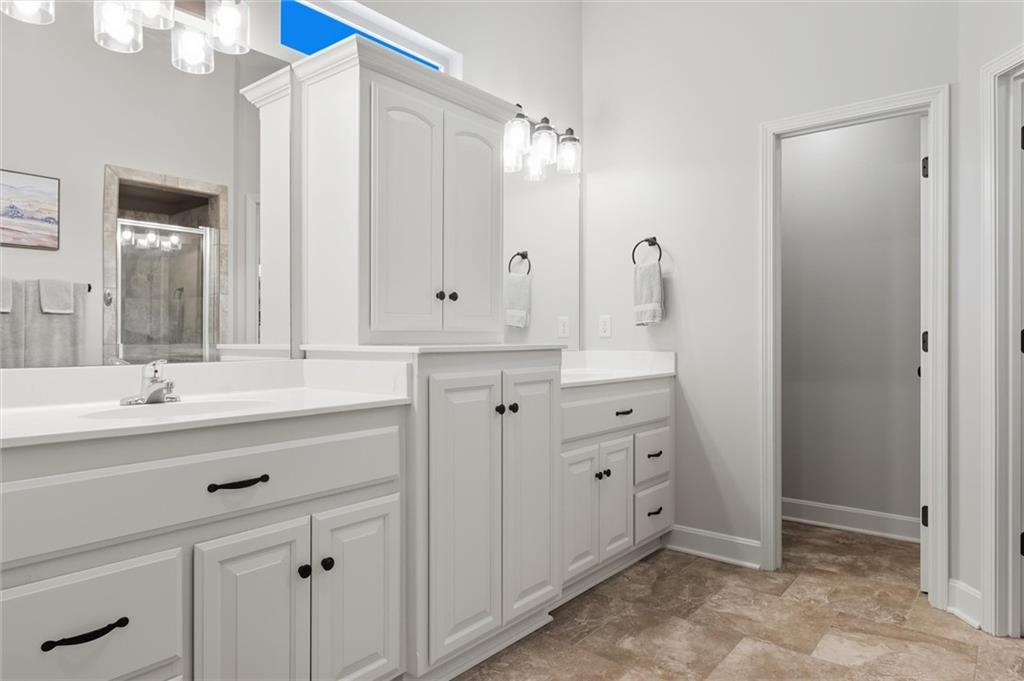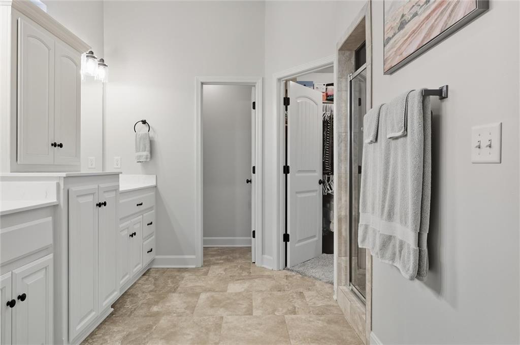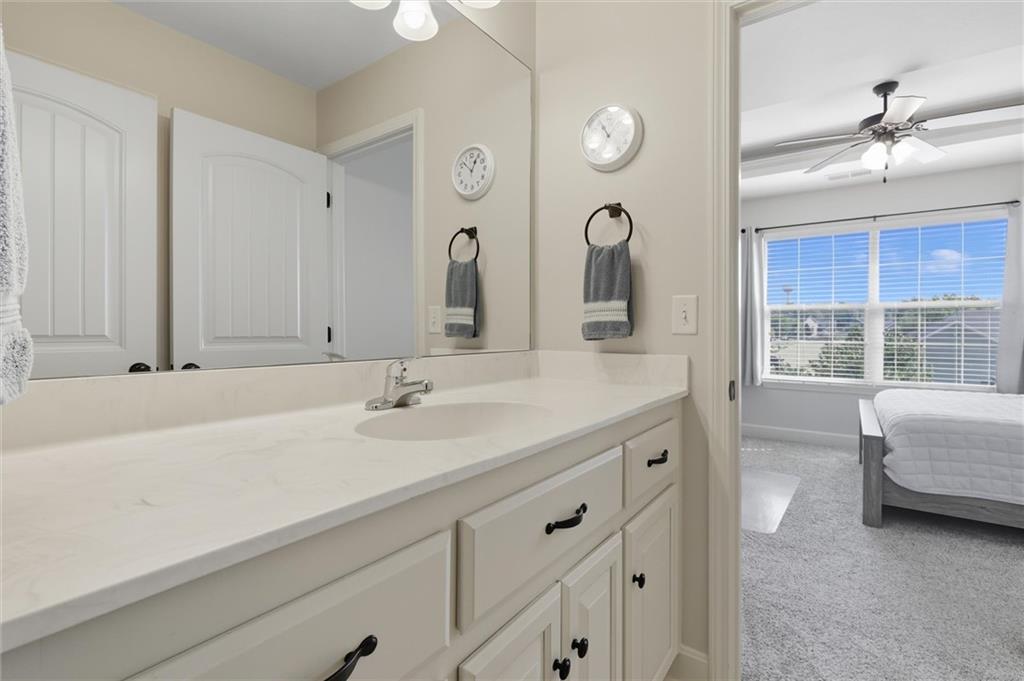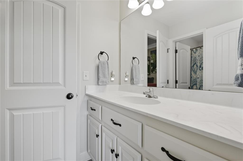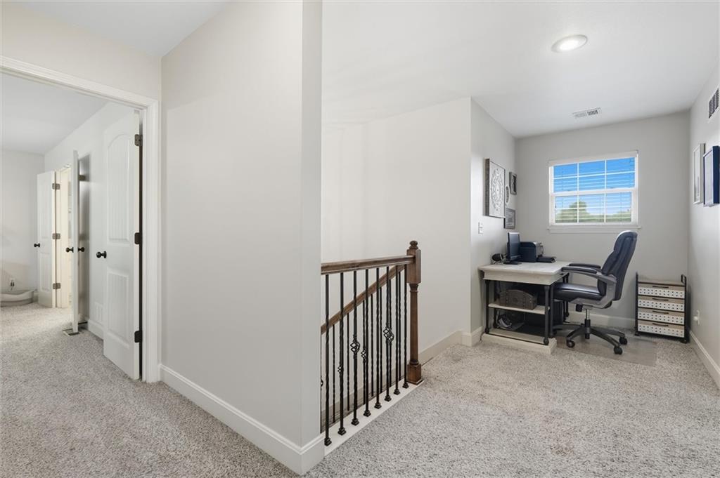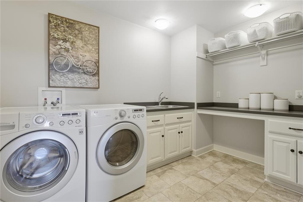 Upstairs, a landing office nook provides a convenient workspace or study area. The primary suite features double vanities, a walk-in shower with dual shower heads, and a large walk-in closet. The laundry room is conveniently located on the bedroom level and includes built-ins and a sink. Bedrooms two and three share a Jack and Jill bath.