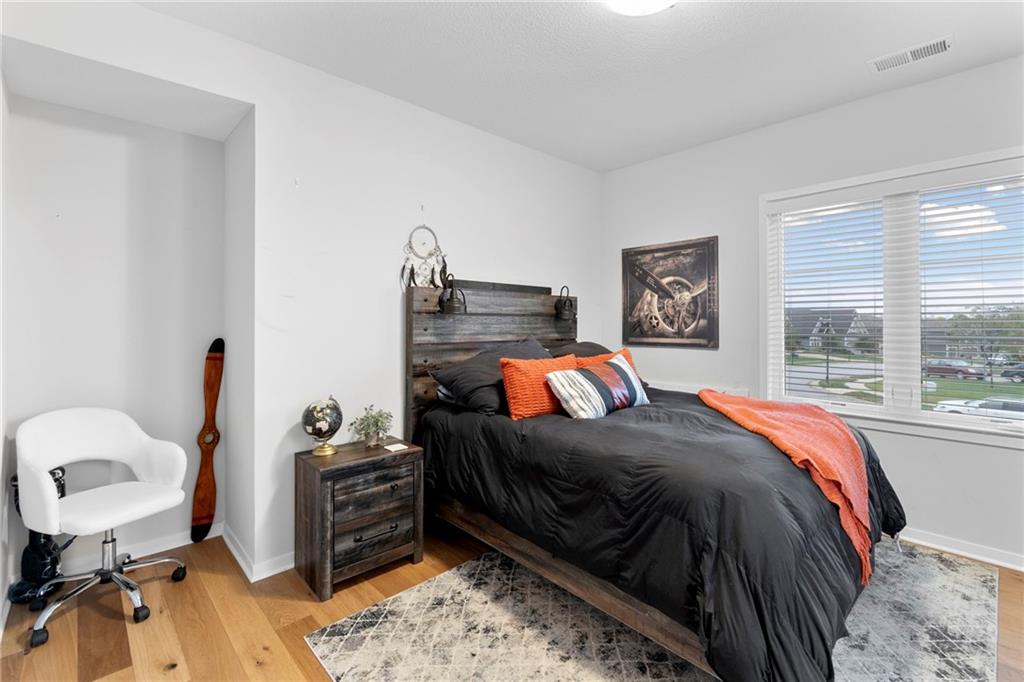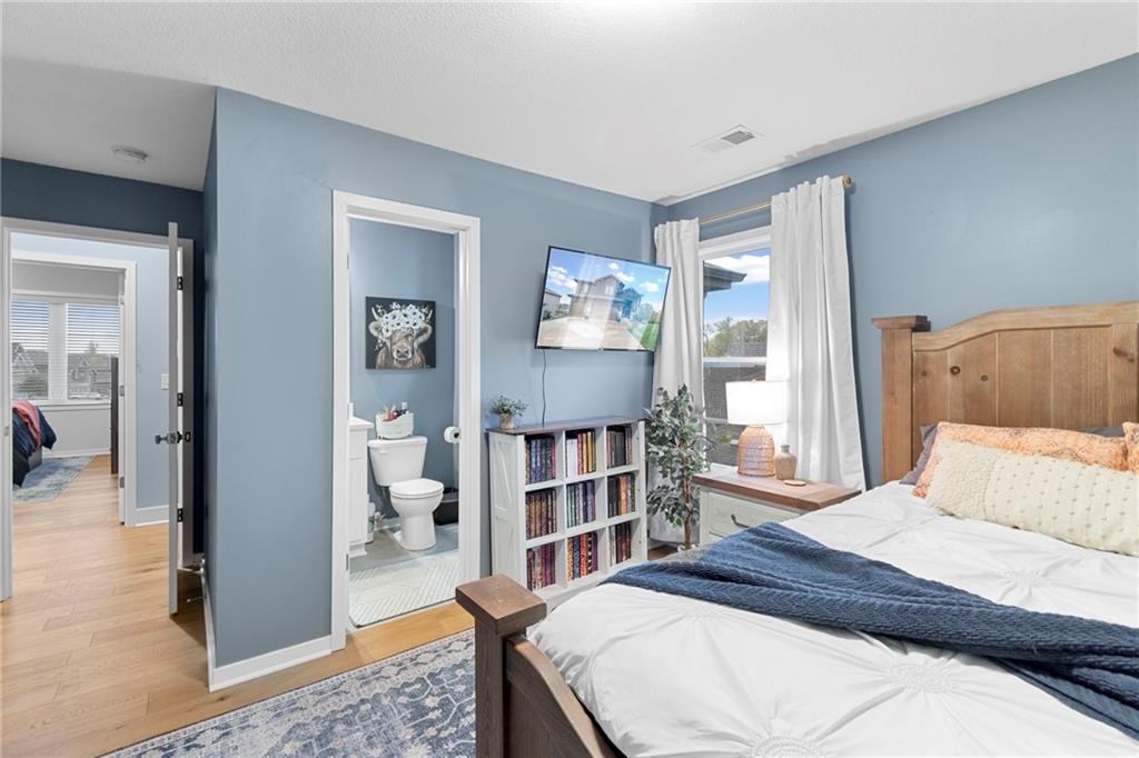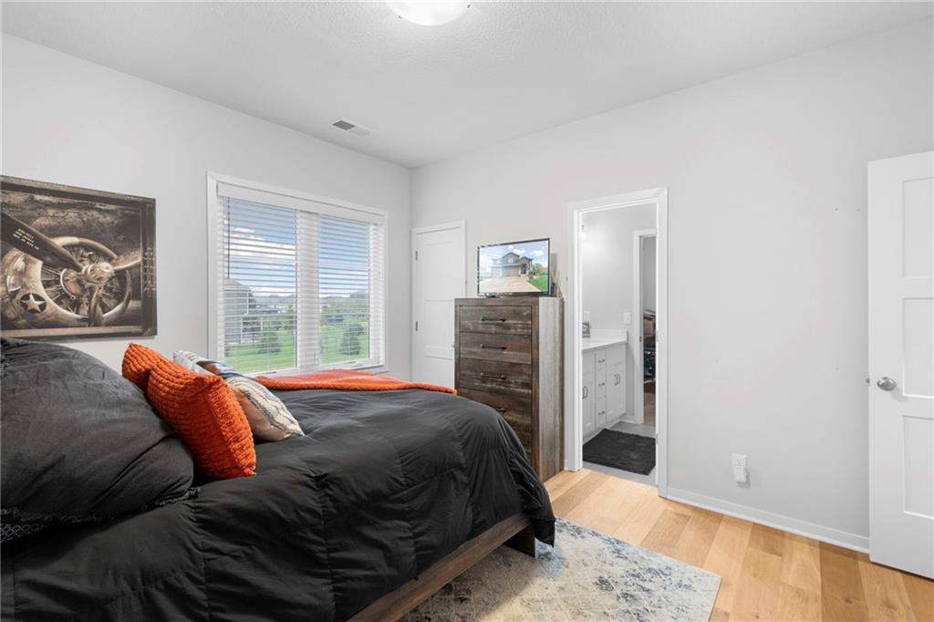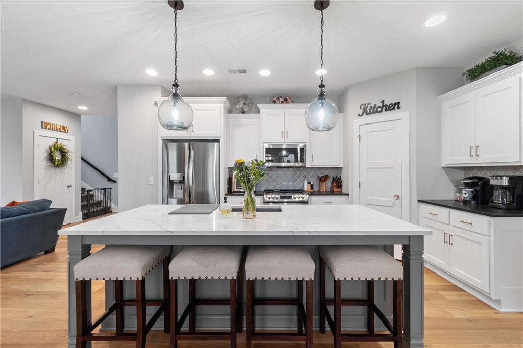 The kitchen, with its large quartz island, elegant gray arabesque backsplash, and walk-in pantry, opens to a cozy family room and covered deck. The adjoining patio, connected by the walkout basement, creates a seamless indoor-outdoor flow. Step outside to a giant backyard with fresh landscaping, full fencing, and a sprinkler system. The yard transitions beautifully from the neighborhood’s gentle landscape into wide-open green space beyond, making every sunset view unforgettable.
