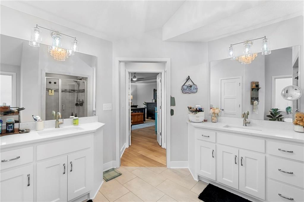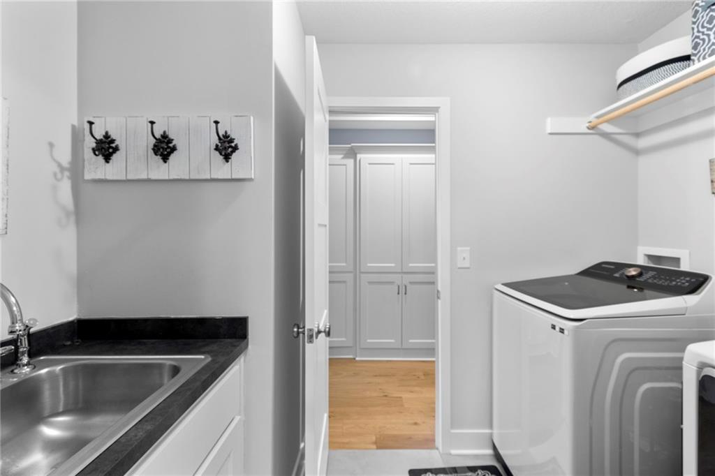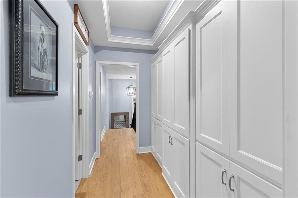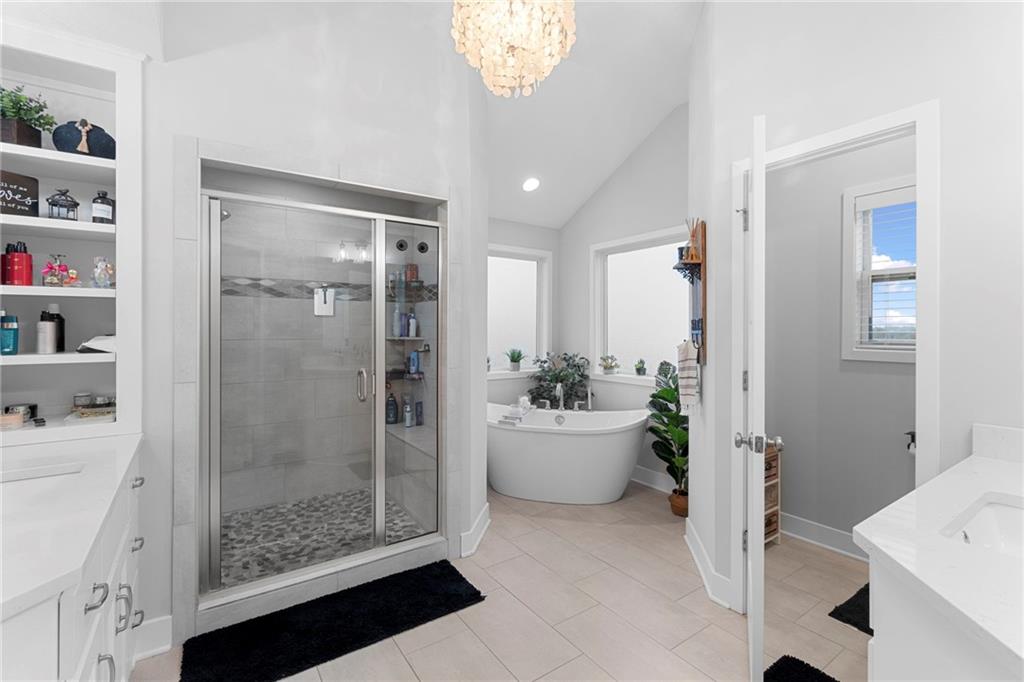 This home includes abundant storage closets, a practical mudroom with a built-in desk, and a deep utility sink in the laundry room. The primary suite feels like a private retreat with an oversized walk-in closet that connects directly to the laundry room. The spa-style bath features double vanities, a freestanding tub, a dual-head tile shower, and an elegant cascading chandelier.