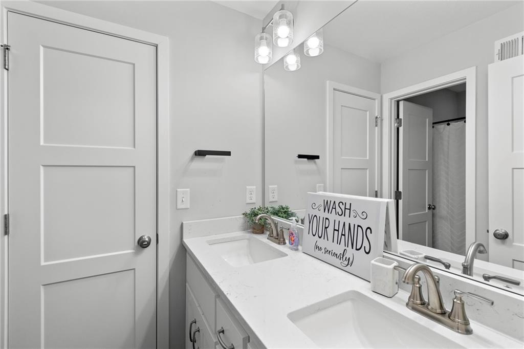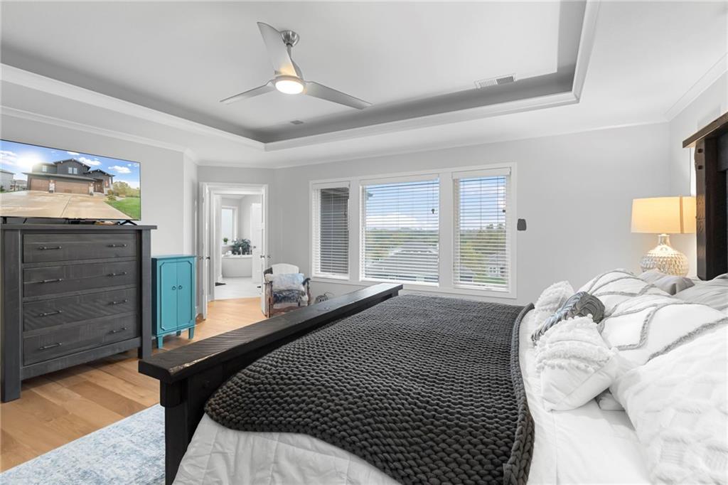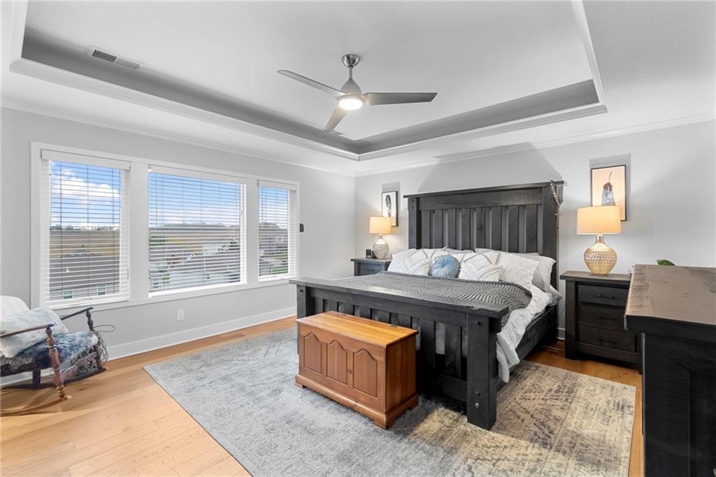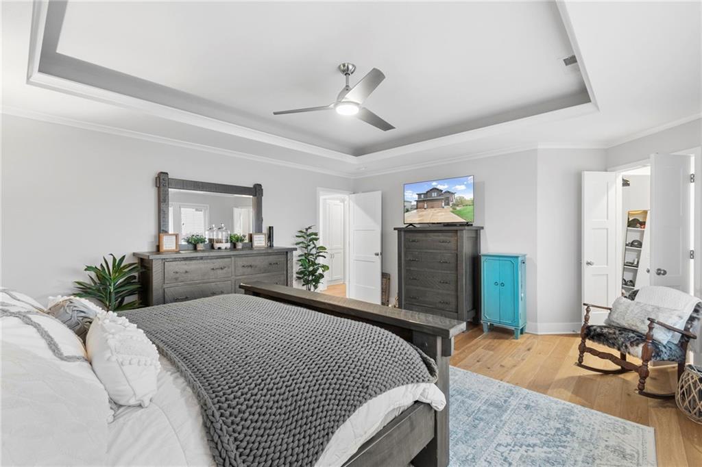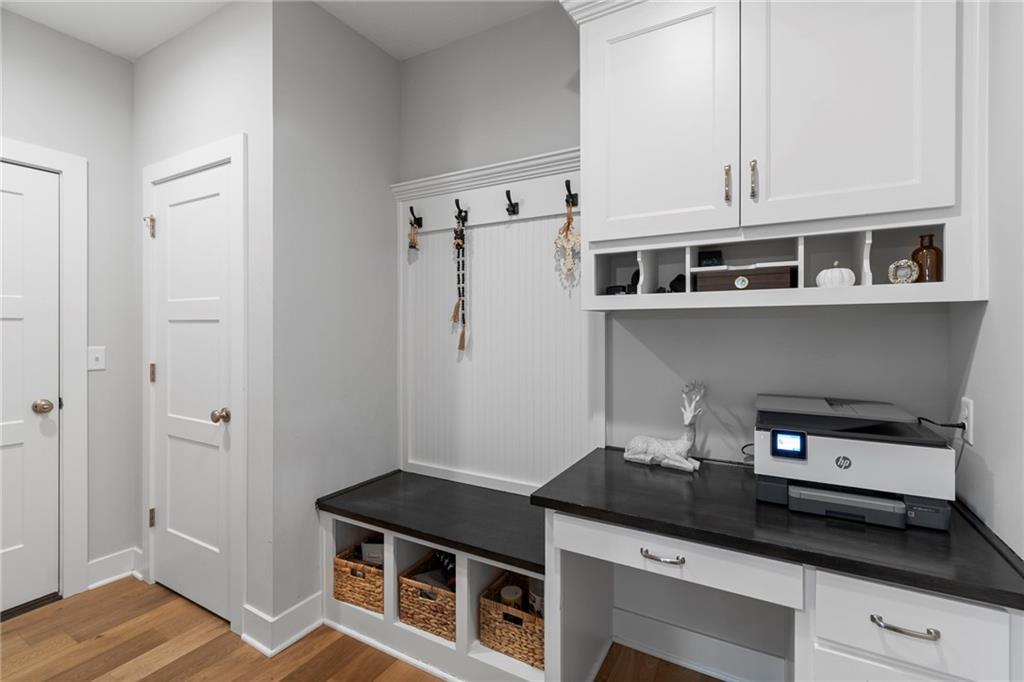 This home includes abundant storage closets, a practical mudroom with a built-in desk, and a deep utility sink in the laundry room. The primary suite feels like a private retreat with an oversized walk-in closet that connects directly to the laundry room. The spa-style bath features double vanities, a freestanding tub, a dual-head tile shower, and an elegant cascading chandelier.