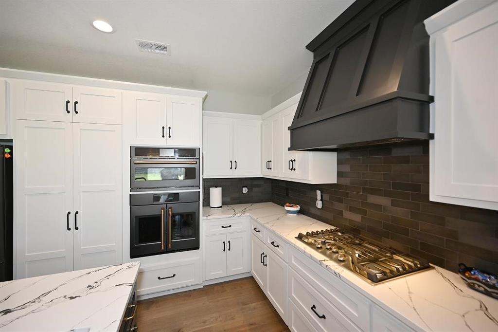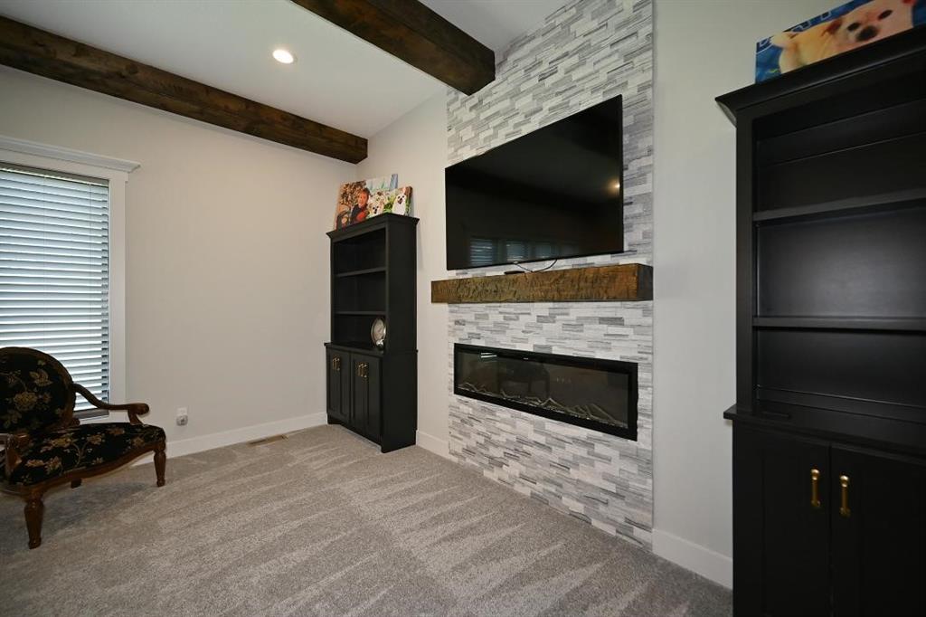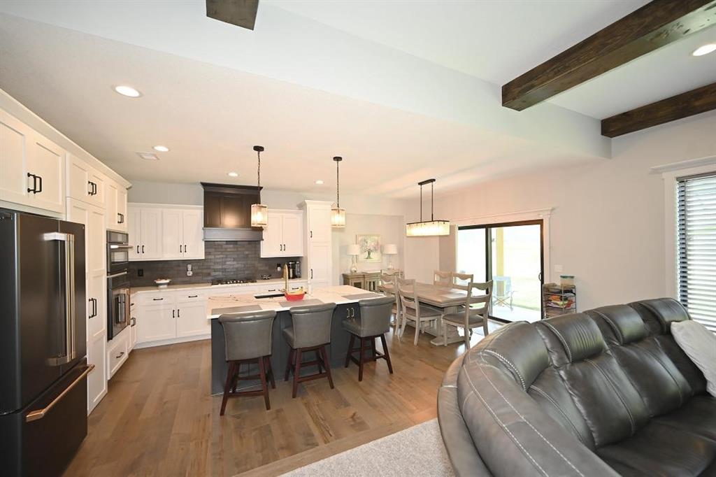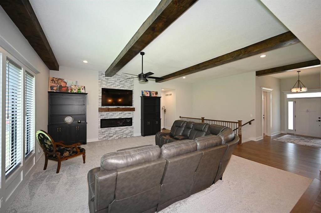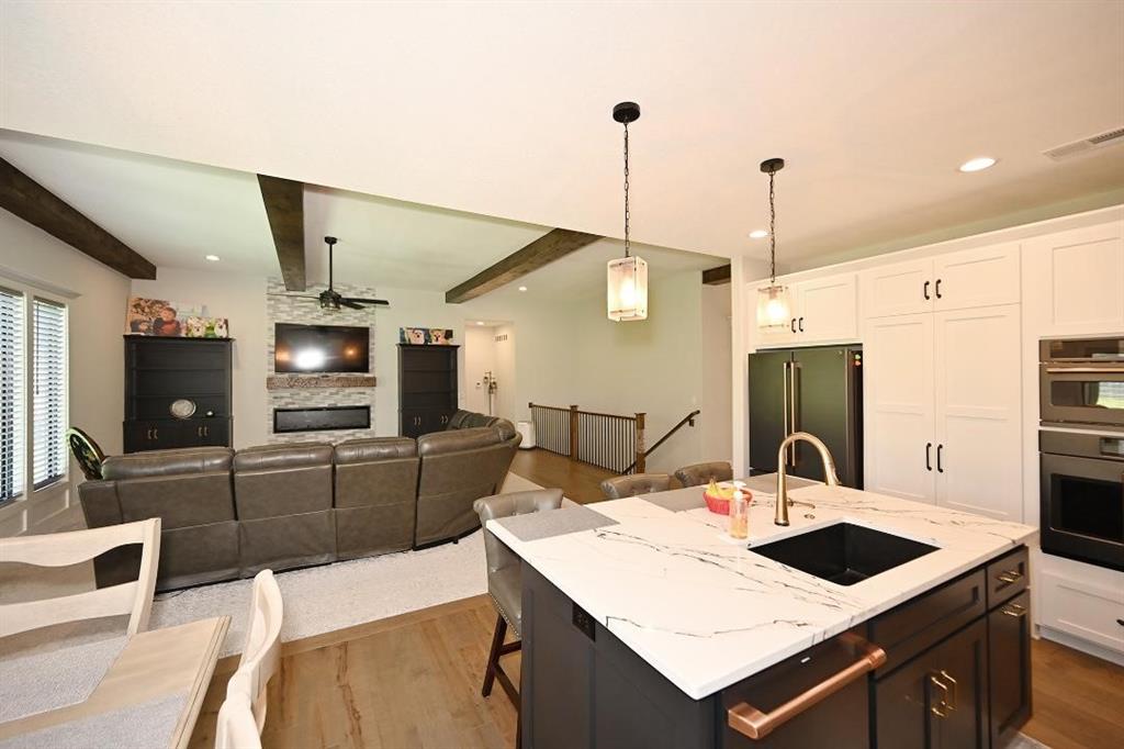 The main level offers a welcoming guest bedroom & full bath near the entry, ideal for visitors. The gourmet kitchen boasts quartz countertops, custom cabinetry, soft-close drawers, a large island, & a massive walk-in pantry w abundant shelving. High-end appliances & upgraded hardware, including faucets, knobs, & pulls, add to the kitchen’s sophistication. The great room features a custom fireplace surrounded by built-in shelving, engineered hardwood flooring, & stunning exposed wood beams. Designer lighting fixtures & updated mirrors elevate the space throughout.