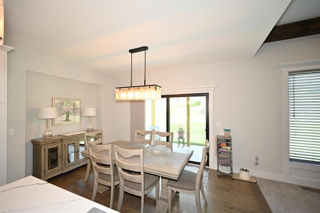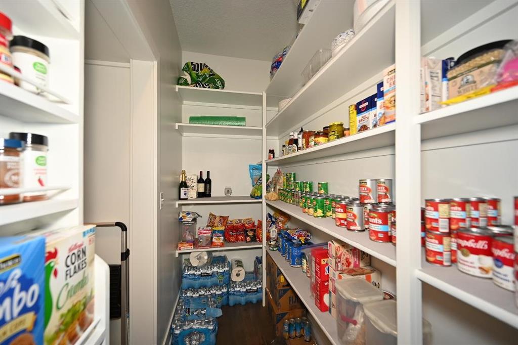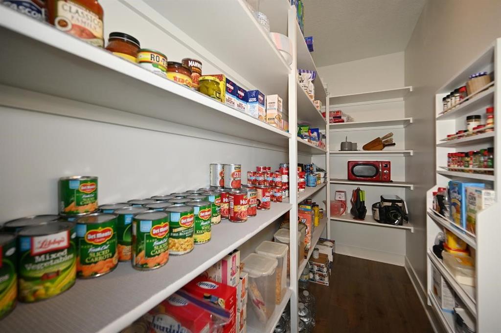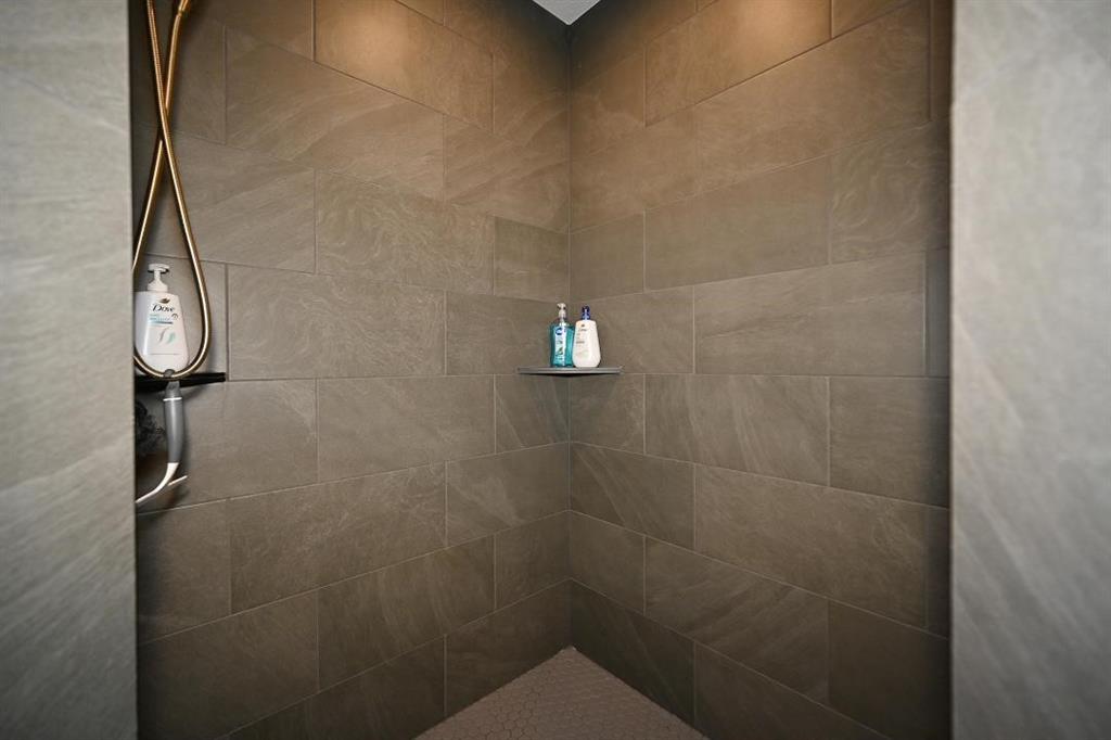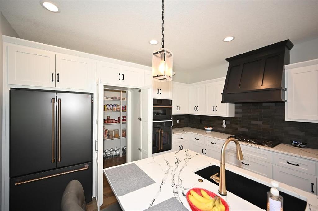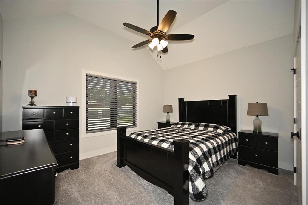 The main level offers a welcoming guest bedroom & full bath near the entry, ideal for visitors. The gourmet kitchen boasts quartz countertops, custom cabinetry, soft-close drawers, a large island, & a massive walk-in pantry w abundant shelving. High-end appliances & upgraded hardware, including faucets, knobs, & pulls, add to the kitchen’s sophistication. The great room features a custom fireplace surrounded by built-in shelving, engineered hardwood flooring, & stunning exposed wood beams. Designer lighting fixtures & updated mirrors elevate the space throughout.
