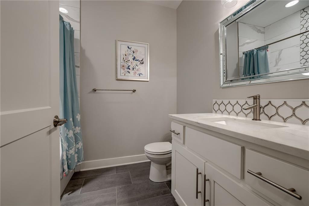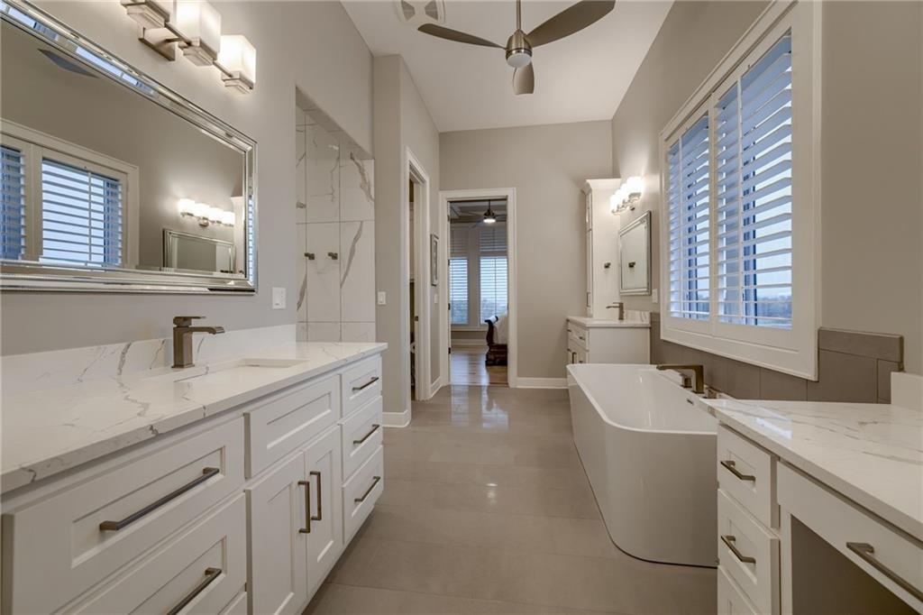 The opulent primary suite offers a spa-like retreat with a luxurious soaking tub, dual separate vanities, and an abundance of natural light. Throughout the home, large windows frame breathtaking views of the city skyline, creating a serene backdrop in every room.
