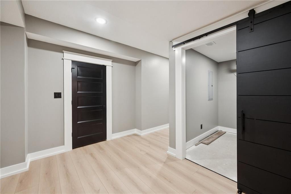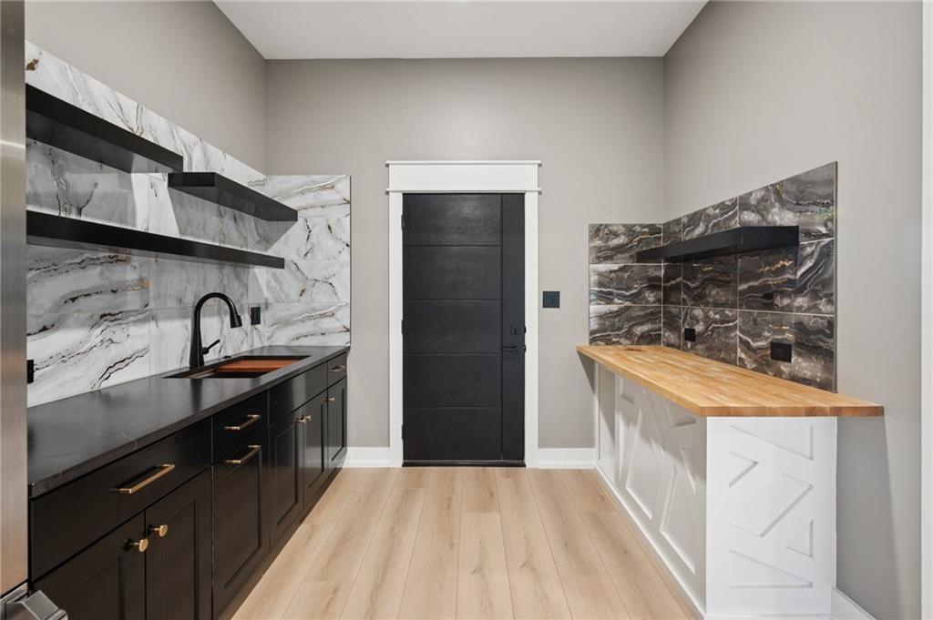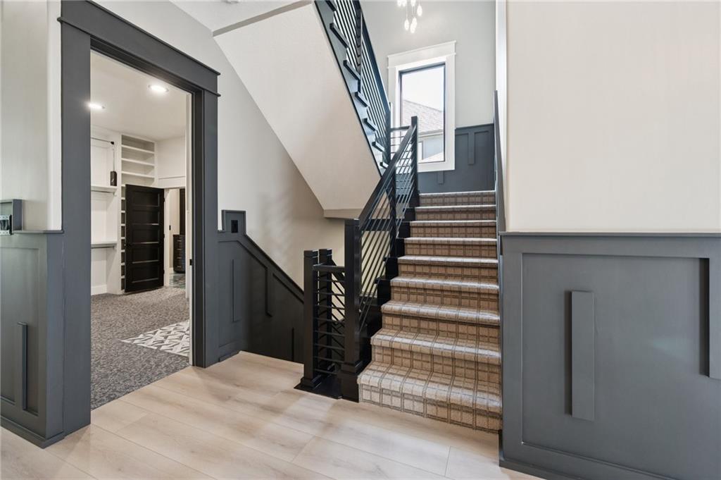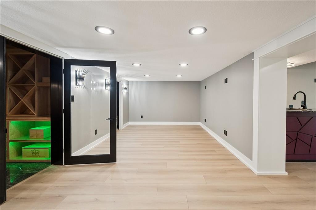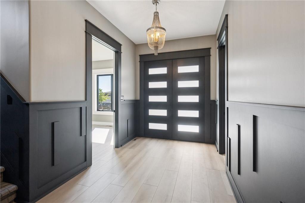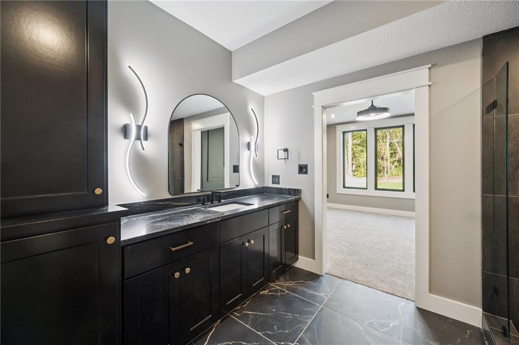 A One-of-a-Kind Masterpiece of Moody Glamour and Modern Edge. Step into a home unlike any other—a custom-built sanctuary where sophistication meets shadow and every detail is designed to dazzle. This first-of-its-kind residence exudes an irresistible blend of high-end modern living and dark, luxurious allure. The heart of the home unfolds in a striking open-concept kitchen, dining, and living space—anchored by a magnificent double-sized gas cooktop, Café Series appliances, and a double drawer dishwasher. Entertain effortlessly with dual ovens, dual faucets, and a butler’s pantry/prep kitchen that hides the magic behind the scenes. A built-in wine chiller gleams beneath chandeliers that scatter crystal light across richly veined quartz countertops. Step from the dining nook onto an expansive covered deck, complete with a dramatic outdoor fireplace—a gathering space that feels equally suited for twilight dinners and midnight conversations. The main-floor primary suite is a showpiece of moody indulgence, featuring a black-trimmed accent wall, and a zero-entry shower with dual shower heads. The sprawling walk-in closet offers pull-down bars for effortless organization and connects to a discreet washer/dryer hookup for added convenience. Downstairs, the finished walkout basement is pure enchantment: LVP flooring flows through a deep berry-and-black bar that glows under soft lighting, leading to a true theater room, stone-walled wine cellar, and finished storage with built-in shelving. The suspended garage adds a layer of architectural intrigue, while the epoxy-coated, heated three-car garage with built-ins ensures every inch is both beautiful and functional. Every corner of this home whispers luxury—two water heaters, zoned HVAC, an oversized drop zone, and a private, wooded backyard with a permanent basketball hoop and concrete pad complete this entertainer’s dream. Darkly elegant. Unbelievably custom. Unapologetically original. This home isn’t just built—it’s composed.