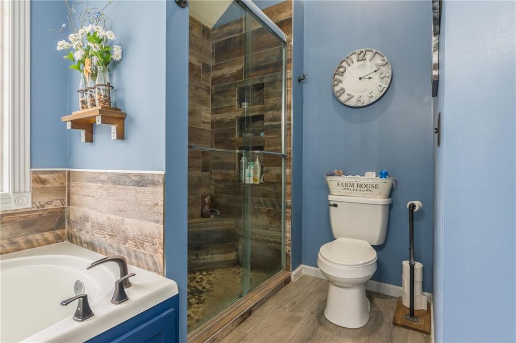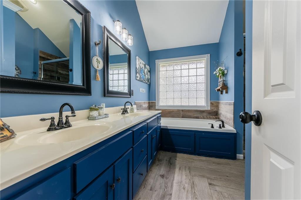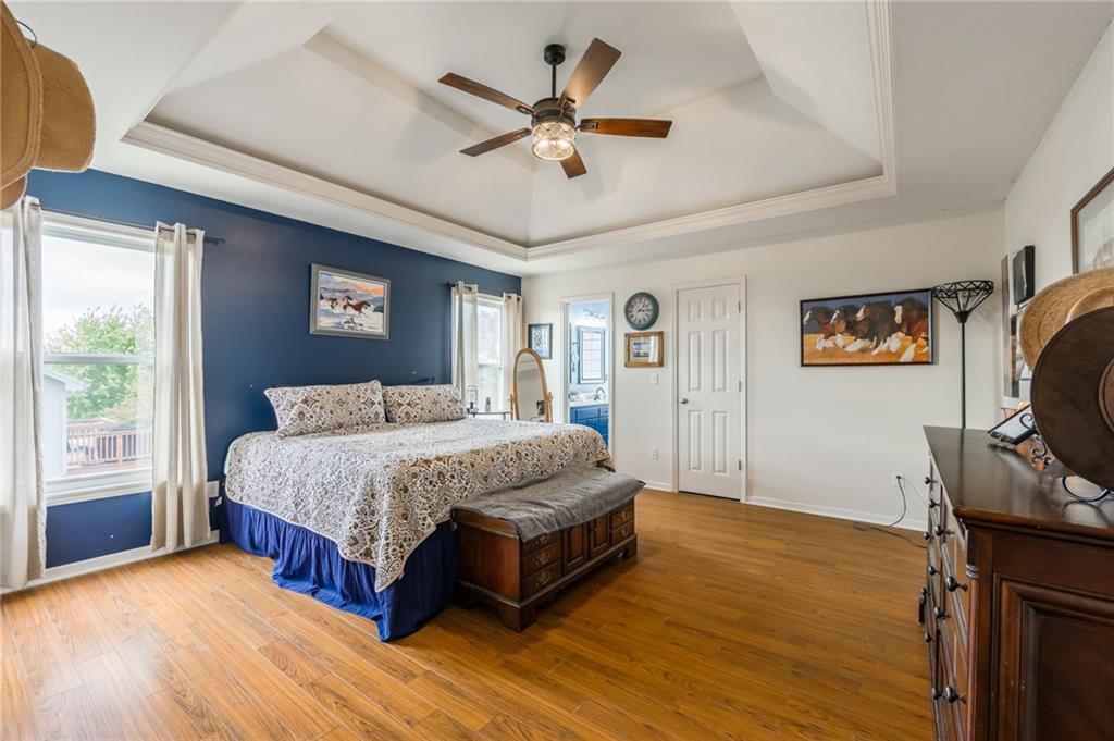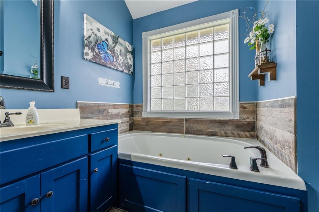 The living room invites you to unwind with a cozy fireplace, soaring ceilings, and an easy flow that feels both spacious and warm. The main floor features 3 bedrooms and laundry. The oversized primary suite is a retreat all its own — with two walk-in closets, tray ceilings, and a spa-like bathroom complete with a jetted tub and updated shower.
