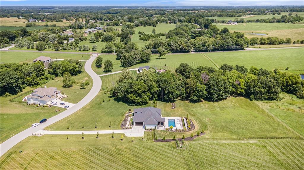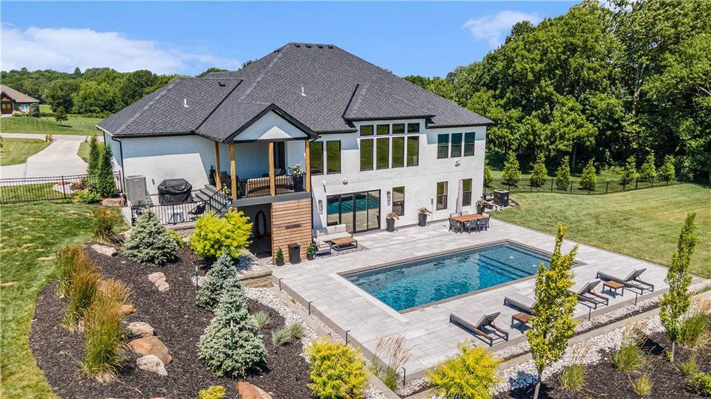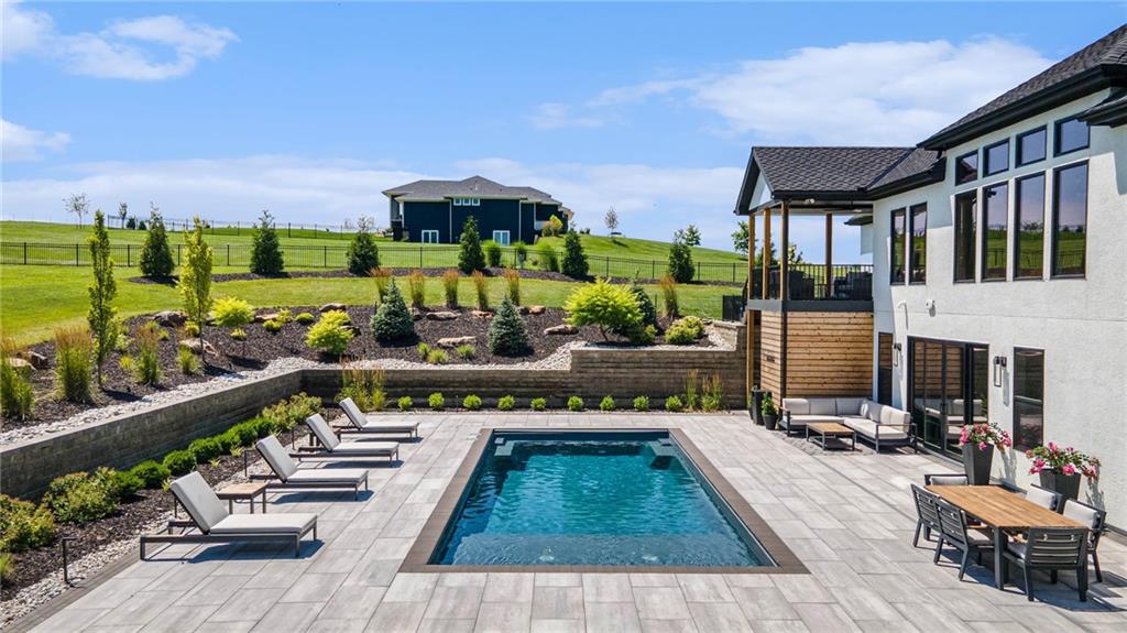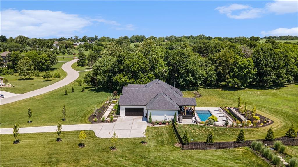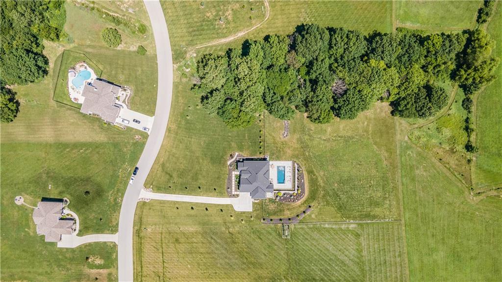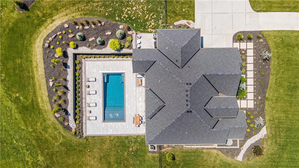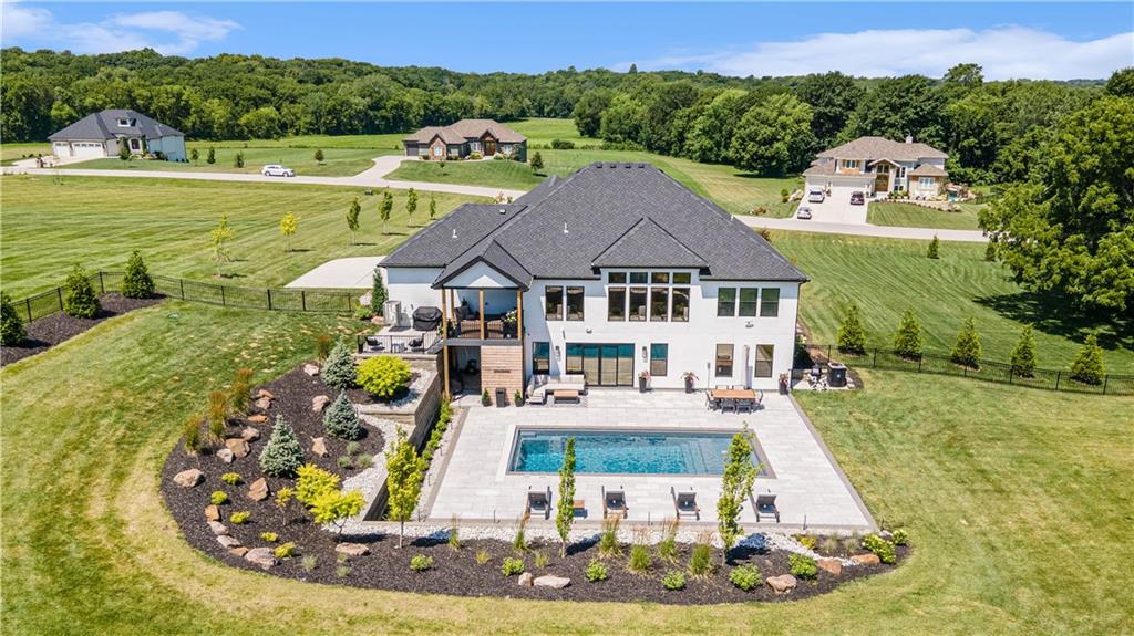 Welcome to this stunning custom reverse 1.5-story home, set on a beautifully manicured 3.62-acre lot. From the moment you arrive, you’ll notice the meticulous landscaping, treed-lined driveway, and custom stone path leading to the striking 10′ double entry doors. The side-entry 3-car garage features epoxy flooring and adds to the home’s clean, modern appeal. Inside, 10’ ceilings and hardwood floors run throughout the main level. The east wing of the home was expanded to accommodate spacious bedrooms and an impressive primary walk-in closet. The primary boasts a tray ceiling with ceiling fan, the luxurious ensuite includes a freestanding tub, double vanity, and a walk-in shower. The open-concept living room features a handcrafted ceiling design and a Roman Clay gas fireplace. Black Pella windows provide picturesque views of the backyard and pool, while flooding the living area and kitchen with natural light. No detail was spared in the designer kitchen, complete with a waterfall-edge quartz island, custom cabinetry, tile backsplash wall, wrapped hood vent, floating shelves, and 6-burner gas stove. A coffee bar, butler’s pantry, and walk-in pantry add functionality. Downstairs offers an expansive open layout with 10’ ceilings, luxury vinyl plank flooring, full bath, full bar and half bath. The show-stopping basement bar features an oversized black quartz island, sink, custom cabinetry, tile feature wall, and floating shelves. Two additional bedrooms and a third full bathroom complete the lower level. The storage room has been converted into a home gym and includes John Deere doors that open to pool deck. Outdoors, enjoy a private oasis with a beautifully landscaped Pinnacle fiberglass 35′ in-ground pool, with retractable cover, retaining wall, ambient lighting, and tree-lined east boundary. Convenient pool storage is tucked beneath the deck. This home offers luxury, privacy, and custom craftsmanship at every turn.