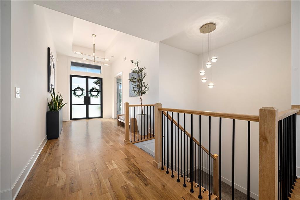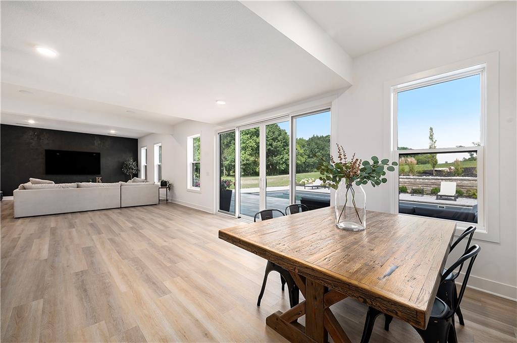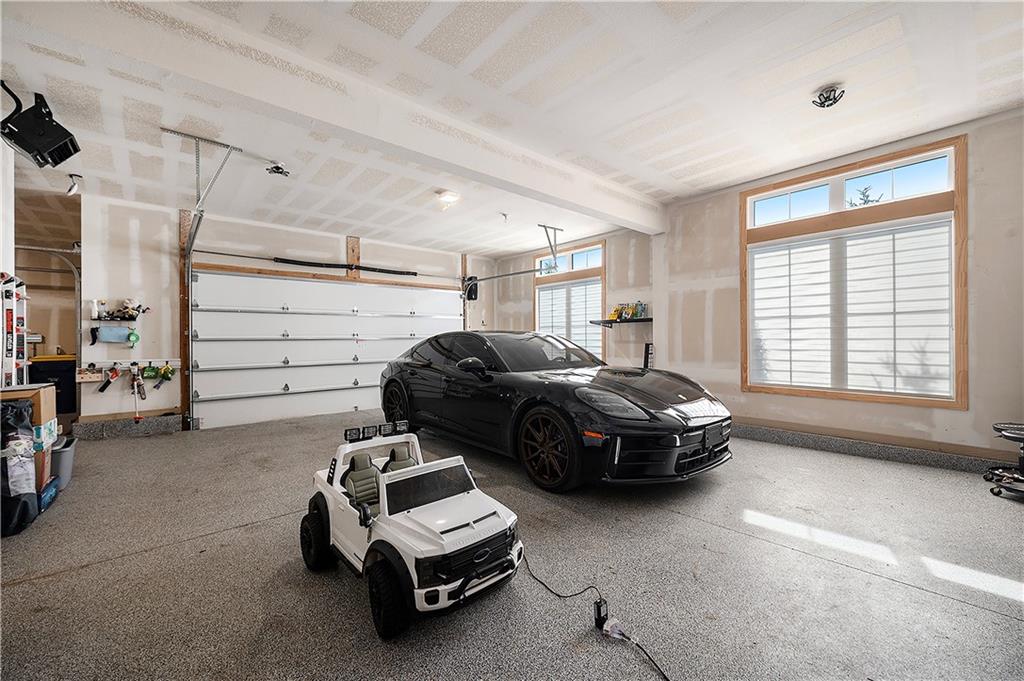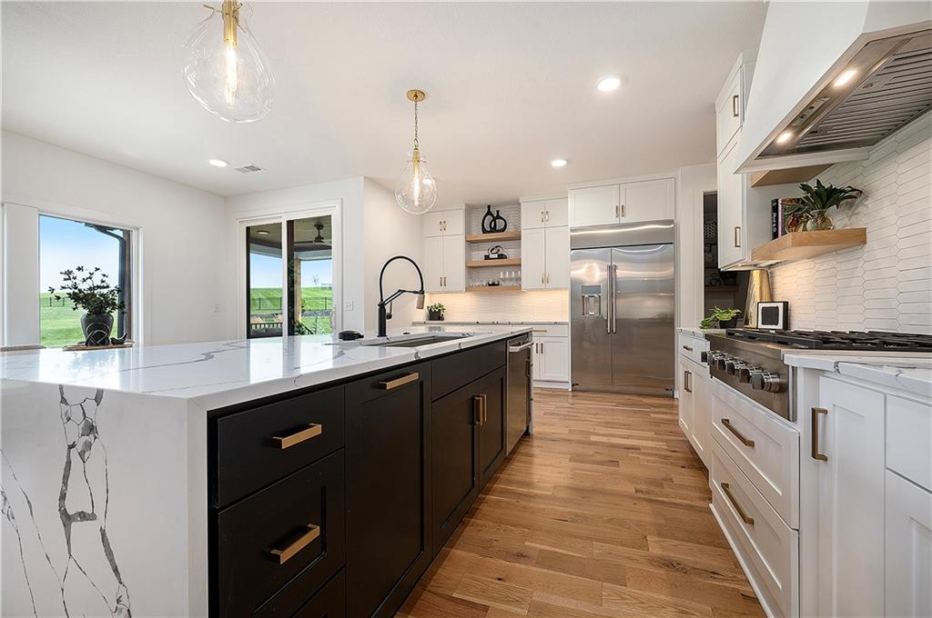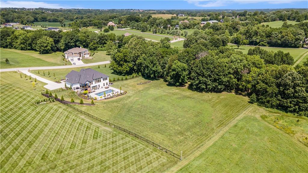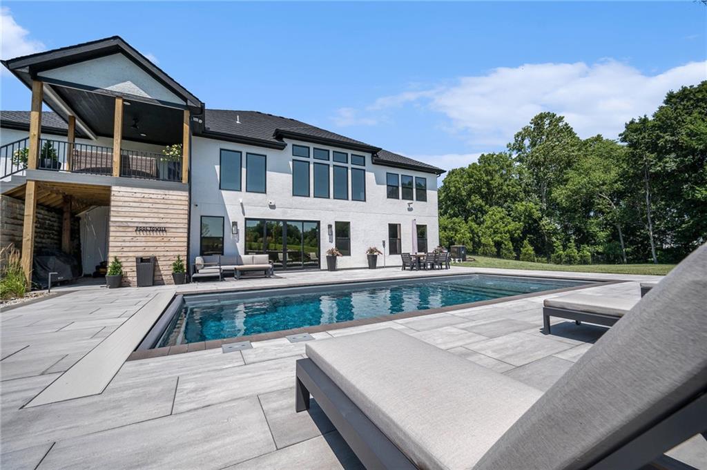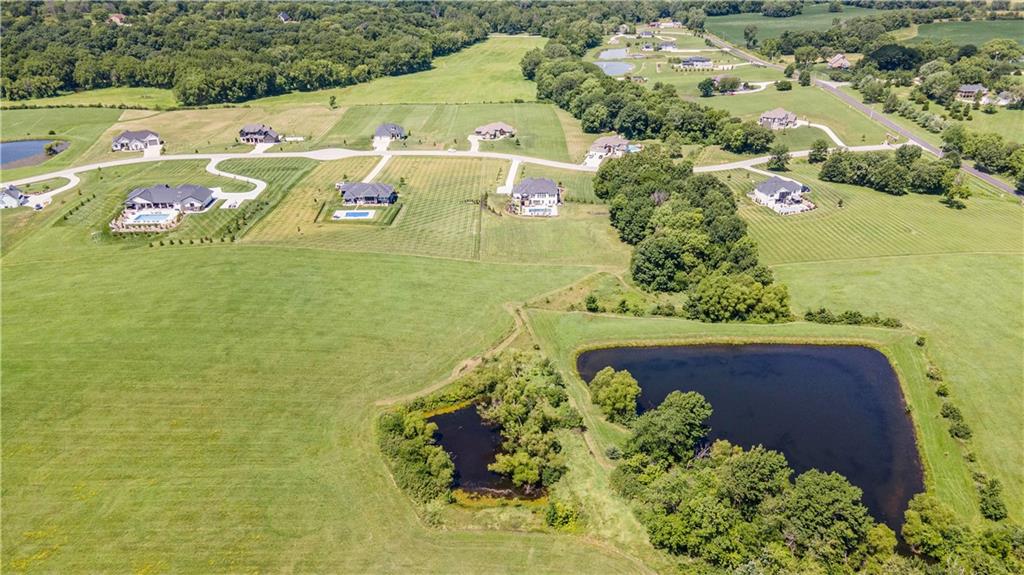 Welcome to this stunning custom reverse 1.5-story home, set on a beautifully manicured 3.62-acre lot. From the moment you arrive, you’ll notice the meticulous landscaping, treed-lined driveway, and custom stone path leading to the striking 10′ double entry doors. The side-entry 3-car garage features epoxy flooring and adds to the home’s clean, modern appeal. Inside, 10’ ceilings and hardwood floors run throughout the main level. The east wing of the home was expanded to accommodate spacious bedrooms and an impressive primary walk-in closet. The primary boasts a tray ceiling with ceiling fan, the luxurious ensuite includes a freestanding tub, double vanity, and a walk-in shower. The open-concept living room features a handcrafted ceiling design and a Roman Clay gas fireplace. Black Pella windows provide picturesque views of the backyard and pool, while flooding the living area and kitchen with natural light. No detail was spared in the designer kitchen, complete with a waterfall-edge quartz island, custom cabinetry, tile backsplash wall, wrapped hood vent, floating shelves, and 6-burner gas stove. A coffee bar, butler’s pantry, and walk-in pantry add functionality. Downstairs offers an expansive open layout with 10’ ceilings, luxury vinyl plank flooring, full bath, full bar and half bath. The show-stopping basement bar features an oversized black quartz island, sink, custom cabinetry, tile feature wall, and floating shelves. Two additional bedrooms and a third full bathroom complete the lower level. The storage room has been converted into a home gym and includes John Deere doors that open to pool deck. Outdoors, enjoy a private oasis with a beautifully landscaped Pinnacle fiberglass 35′ in-ground pool, with retractable cover, retaining wall, ambient lighting, and tree-lined east boundary. Convenient pool storage is tucked beneath the deck. This home offers luxury, privacy, and custom craftsmanship at every turn.