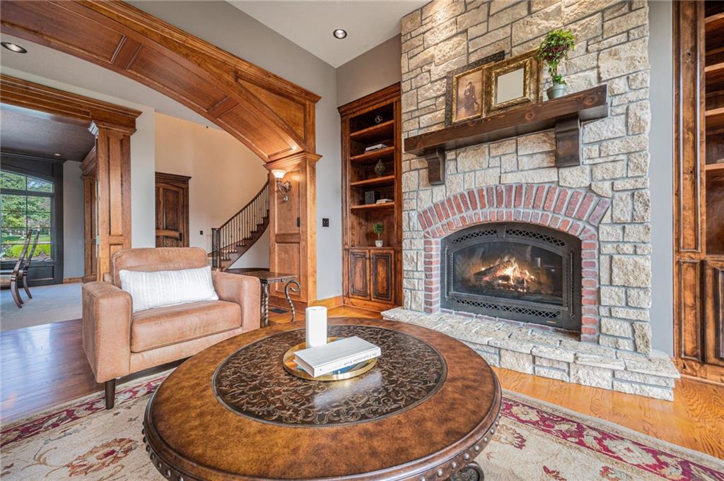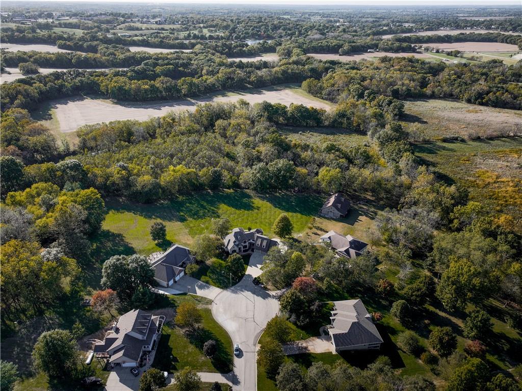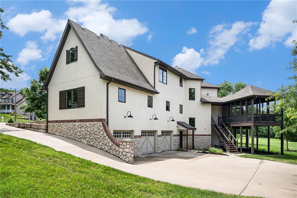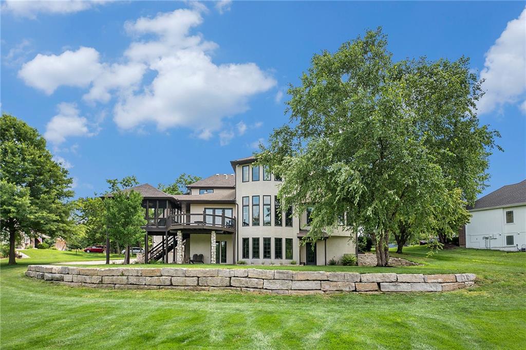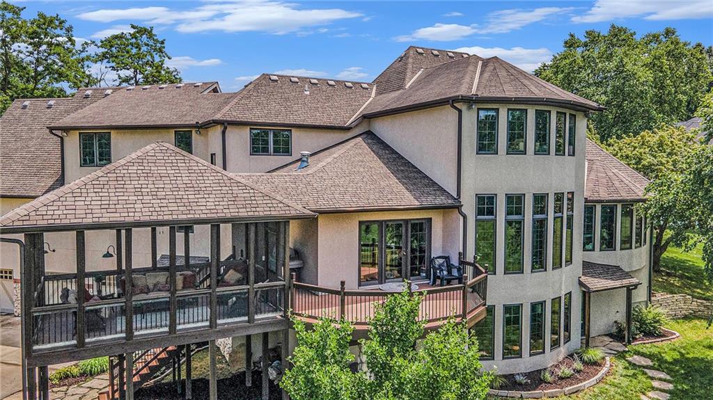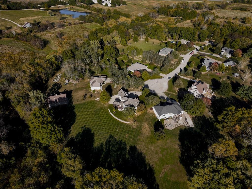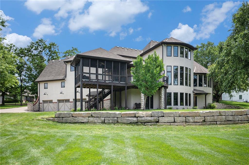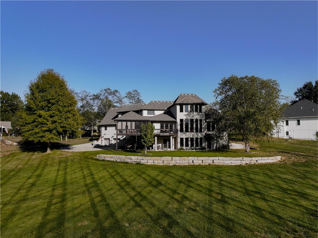 Tucked away on a quiet cul-de-sac in the desirable Strawberry Hill development, this impressive 1.5 story residence rests on a sprawling 1.76± acre lot. With quick access to The Litton Center, scenic walking trails, a play park & nearby Smithville Lake, the location offers both convenience & recreation. From the moment you arrive, the exterior showcases pride of ownership w/timeless curb appeal & meticulous care. Step inside to be greeted by a dramatic foyer featuring a curved staircase, soaring 2-story ceilings & rich, moody-traditional design details. Recently refinished hardwood floors, 2 geothermal HVAC systems (both in ground loop), computer-controlled Vantage Luxury Lighting, structured wiring & thoughtful upgrades throughout set this home apart. The great room makes a bold statement w/an arched wood entry, a striking stacked-stone fireplace flanked by custom built-ins & a wall of windows filling the space with natural light. The gourmet kitchen is designed for the chef at heart, offering knotty alder cabinetry, stone countertops, tile backsplash, built-in refrigerator, gas cooktop, oversized island & an exceptional walk-in pantry. Enjoy meals in the elegant formal dining room or the inviting 3-season room overlooking your private backyard. The main-level primary suite is a true retreat, boasting a coffered ceiling, spa-inspired ensuite w/dual custom vanities, large walk-in shower, jacuzzi tub & an expansive walk-in closet. Upstairs, discover 3 generously sized bedrooms, each with ample closet space & private or jack-and-jill bath access. The finished walkout lower level is designed as a full secondary living space—perfect for guests or multi-generational living. It includes a 2nd full kitchen, bedroom, bathroom, recreation/living areas, garage access & abundant storage. For entertaining, there’s even a theater/media room ready for movie nights or game day. Outside, the expansive backyard is ideal for gatherings, grilling, or tossing the football with friends.