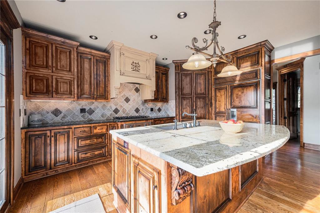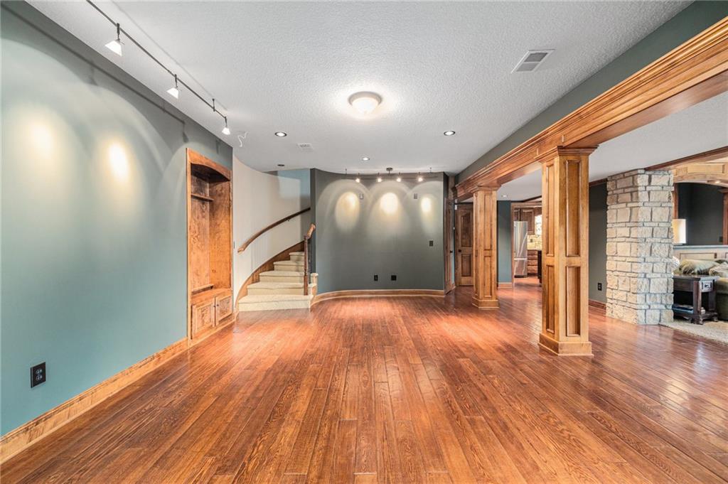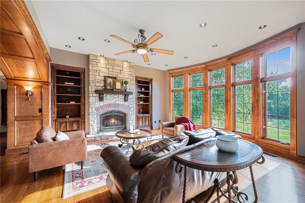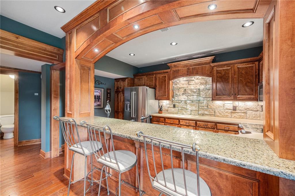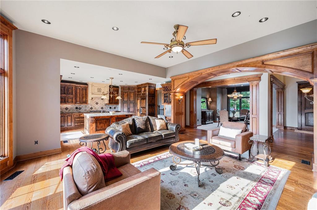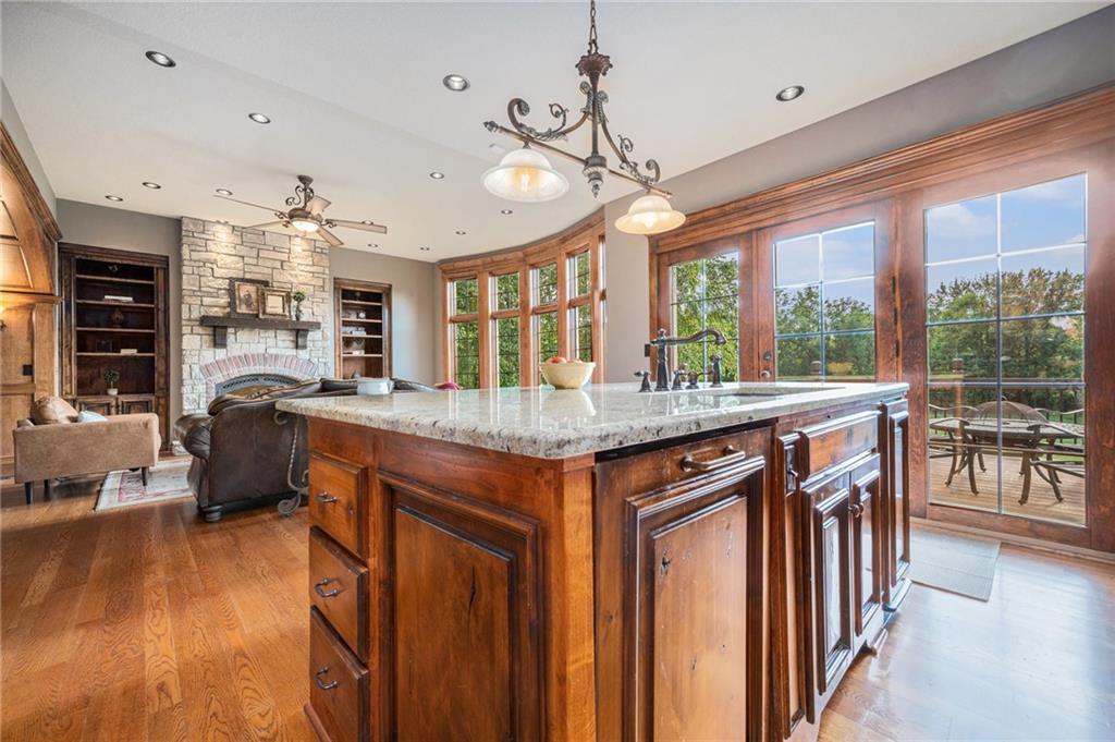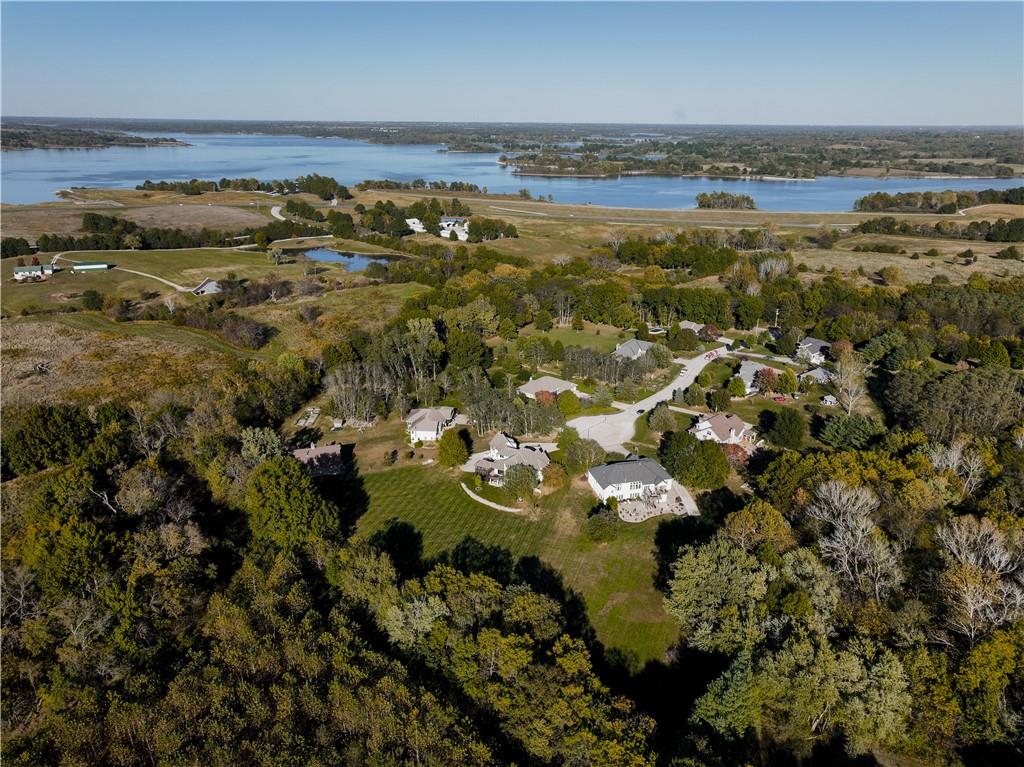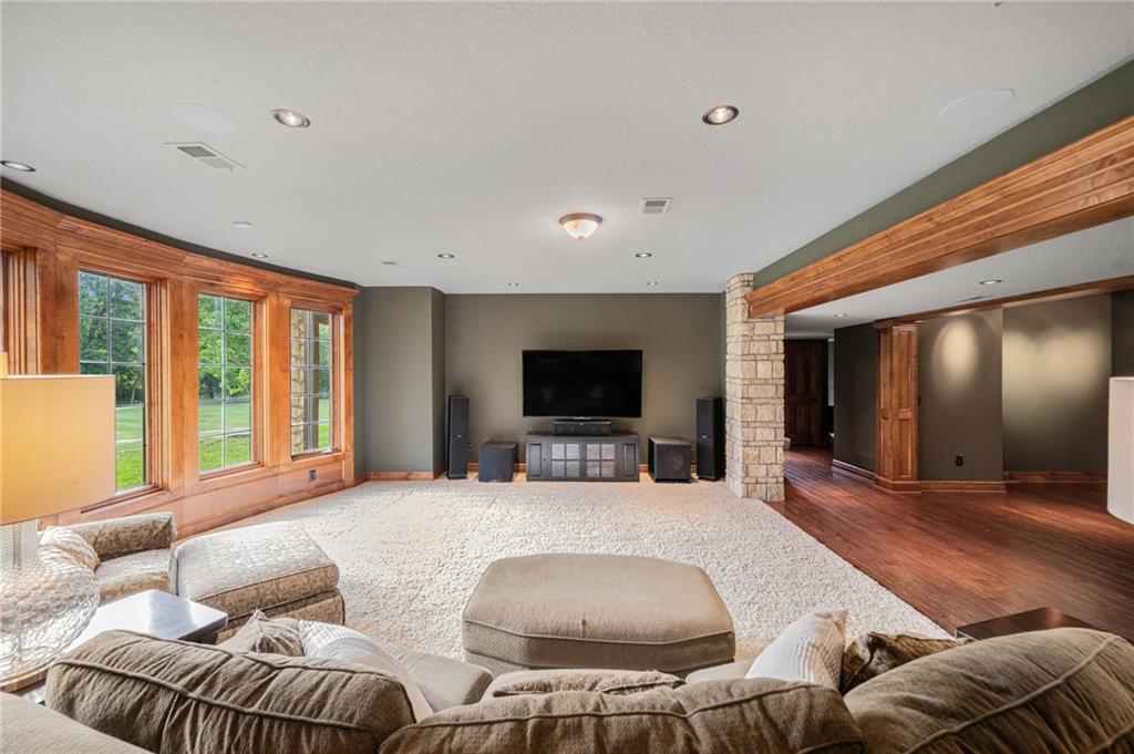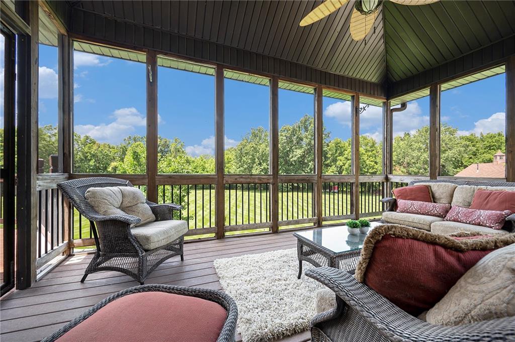 Tucked away on a quiet cul-de-sac in the desirable Strawberry Hill development, this impressive 1.5 story residence rests on a sprawling 1.76± acre lot. With quick access to The Litton Center, scenic walking trails, a play park & nearby Smithville Lake, the location offers both convenience & recreation. From the moment you arrive, the exterior showcases pride of ownership w/timeless curb appeal & meticulous care. Step inside to be greeted by a dramatic foyer featuring a curved staircase, soaring 2-story ceilings & rich, moody-traditional design details. Recently refinished hardwood floors, 2 geothermal HVAC systems (both in ground loop), computer-controlled Vantage Luxury Lighting, structured wiring & thoughtful upgrades throughout set this home apart. The great room makes a bold statement w/an arched wood entry, a striking stacked-stone fireplace flanked by custom built-ins & a wall of windows filling the space with natural light. The gourmet kitchen is designed for the chef at heart, offering knotty alder cabinetry, stone countertops, tile backsplash, built-in refrigerator, gas cooktop, oversized island & an exceptional walk-in pantry. Enjoy meals in the elegant formal dining room or the inviting 3-season room overlooking your private backyard. The main-level primary suite is a true retreat, boasting a coffered ceiling, spa-inspired ensuite w/dual custom vanities, large walk-in shower, jacuzzi tub & an expansive walk-in closet. Upstairs, discover 3 generously sized bedrooms, each with ample closet space & private or jack-and-jill bath access. The finished walkout lower level is designed as a full secondary living space—perfect for guests or multi-generational living. It includes a 2nd full kitchen, bedroom, bathroom, recreation/living areas, garage access & abundant storage. For entertaining, there’s even a theater/media room ready for movie nights or game day. Outside, the expansive backyard is ideal for gatherings, grilling, or tossing the football with friends.