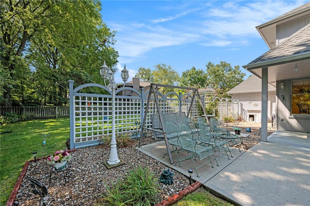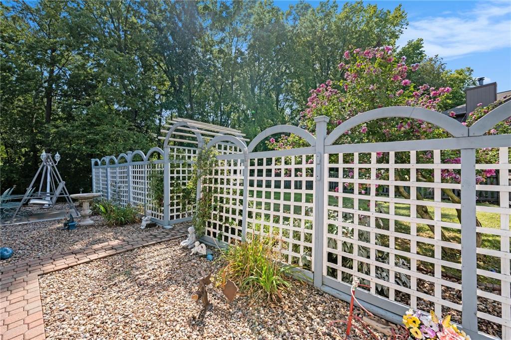 Outdoors, enjoy a lush backyard retreat with vibrant landscaping, decorative lattice, and ample space for gardening, entertaining, or play.