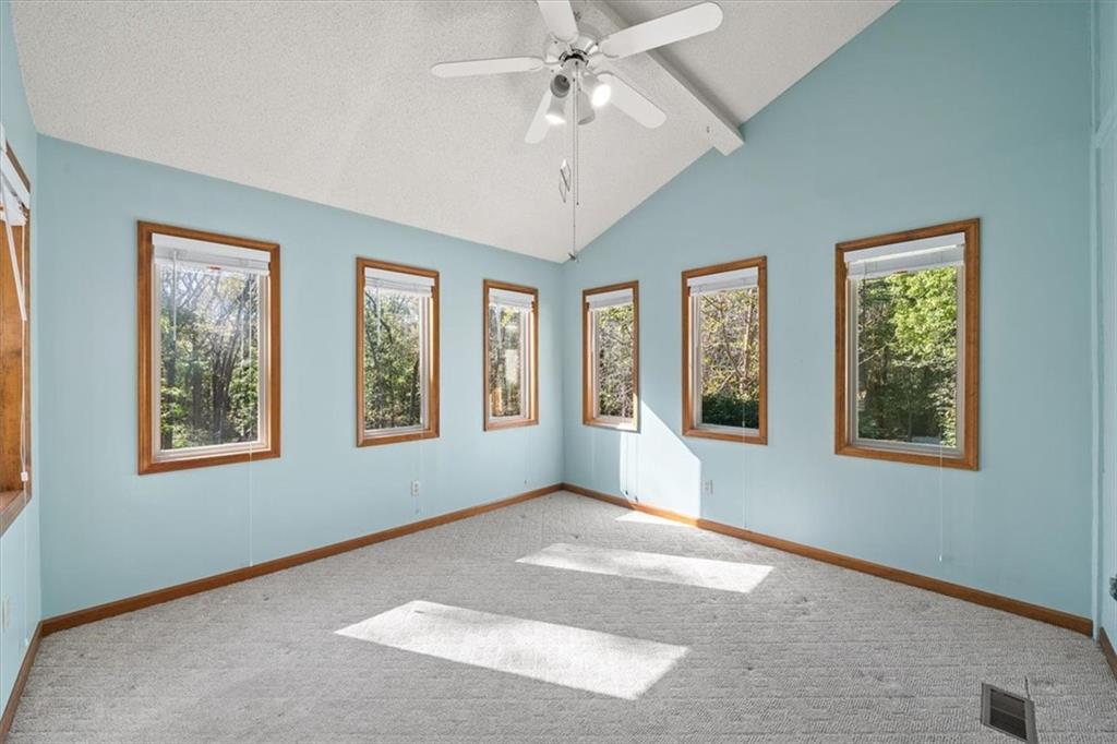 Natural light fills the sunroom, where mornings begin with birdsong and evenings end with views of your private woods and trails. The deck just beyond is perfect for quiet coffee, lively gatherings, or watching the seasons change.