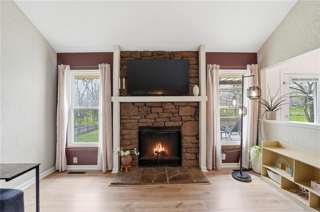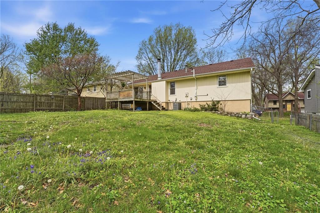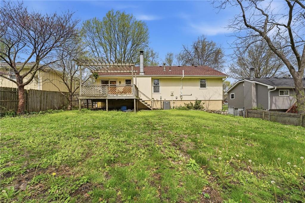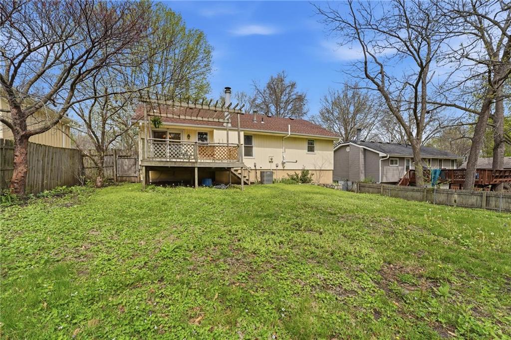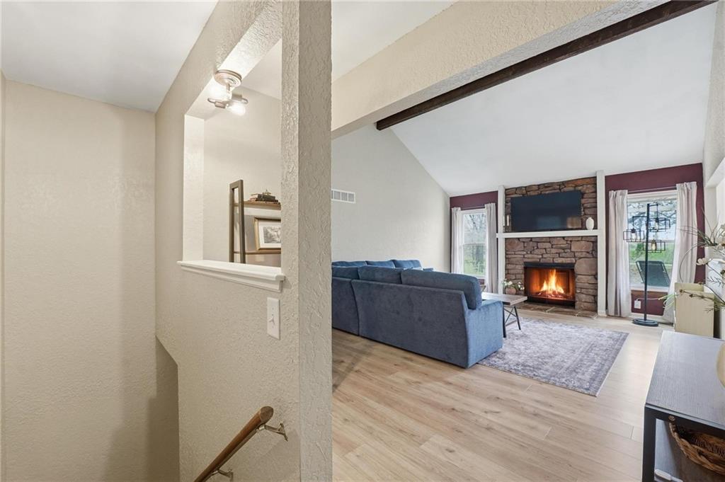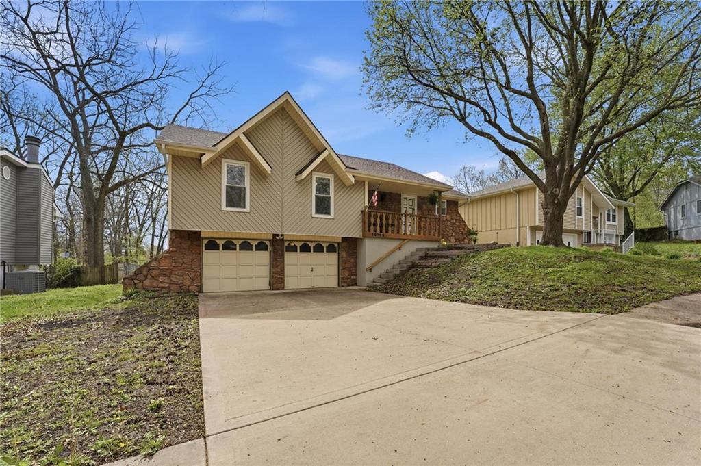 This stunning raised ranch home has been beautifully updated with modern luxury vinyl plank flooring, new carpeting, a new roof, a tiled primary bathroom shower, and fresh paint throughout. Upon entering, you’ll notice the high ceilings and wooden beam accents that create a spacious atmosphere, warmly complemented by a charming stone fireplace. The layout seamlessly flows into a dining room featuring a back door that leads to the deck. The kitchen is equipped with ample cabinetry and smart counter space for all your culinary needs. Down the hallway, you will find a coat closet, linen closet, a full bathroom with a large vanity and a shower over the tub, and three cozy bedrooms at the end of the hall, each adorned with plush carpeting. The primary bedroom offers generous space and a stunning ensuite, complete with a new tiled shower, vanity, and mirror. The finished basement includes a recreation room and a laundry room with fantastic storage, including storage shelves that stay. The two car garage provides access to the basement, featuring space for a coat rack and additional storage behind the shutter doors in the recreation room. The back deck, accessible from the dining room via the back door, overlooks a fenced backyard that backs up to trees, creating a serene retreat. This home is situated in a quiet cul-de-sac within the North Kansas City School District, with Staley High School as the designated attendance school.