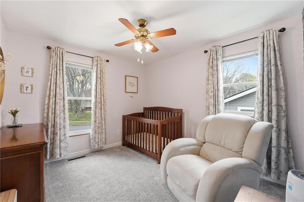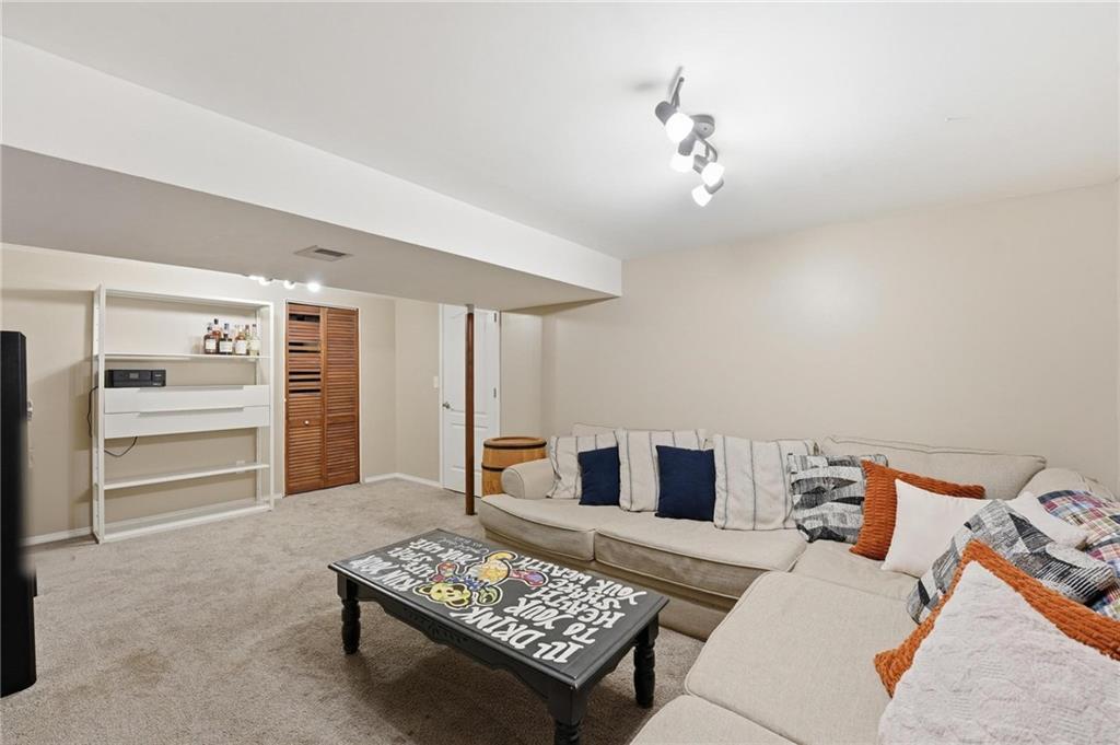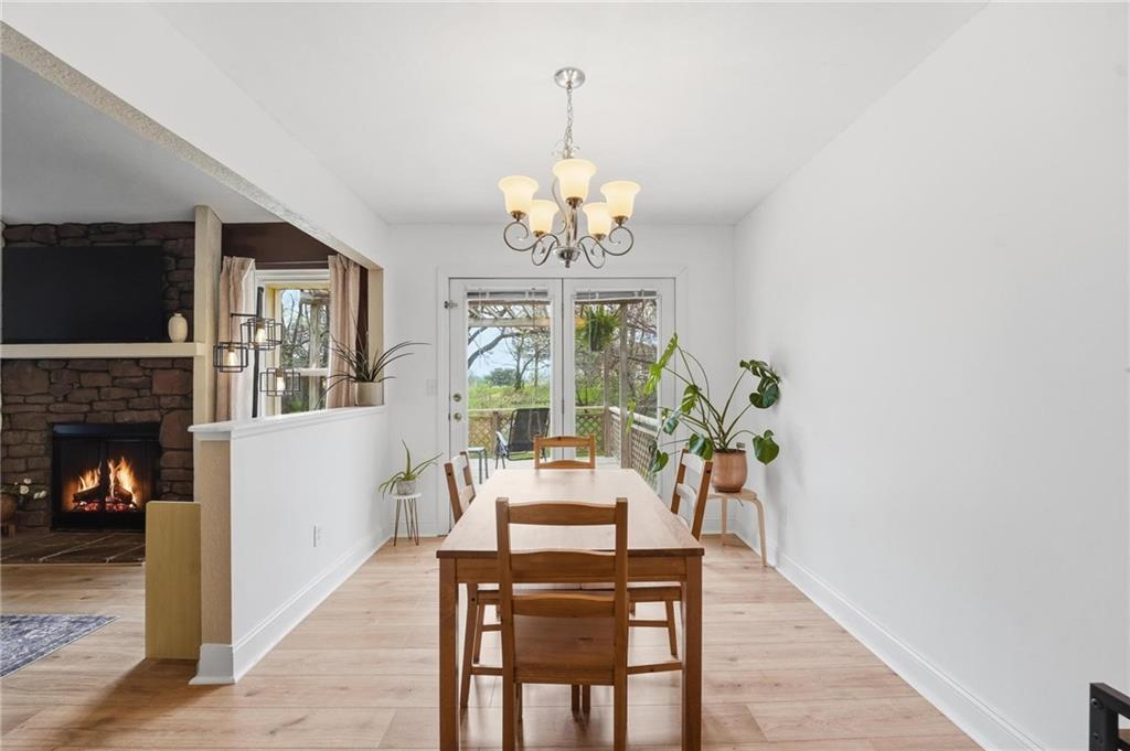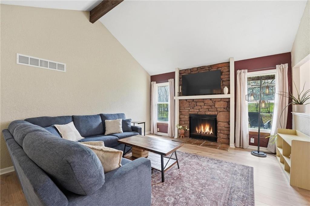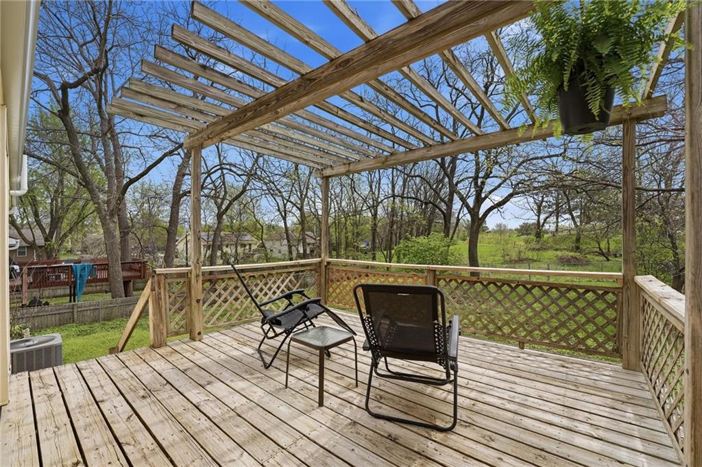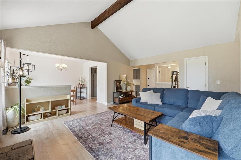 This stunning raised ranch home has been beautifully updated with modern luxury vinyl plank flooring, new carpeting, a new roof, a tiled primary bathroom shower, and fresh paint throughout. Upon entering, you’ll notice the high ceilings and wooden beam accents that create a spacious atmosphere, warmly complemented by a charming stone fireplace. The layout seamlessly flows into a dining room featuring a back door that leads to the deck. The kitchen is equipped with ample cabinetry and smart counter space for all your culinary needs. Down the hallway, you will find a coat closet, linen closet, a full bathroom with a large vanity and a shower over the tub, and three cozy bedrooms at the end of the hall, each adorned with plush carpeting. The primary bedroom offers generous space and a stunning ensuite, complete with a new tiled shower, vanity, and mirror. The finished basement includes a recreation room and a laundry room with fantastic storage, including storage shelves that stay. The two car garage provides access to the basement, featuring space for a coat rack and additional storage behind the shutter doors in the recreation room. The back deck, accessible from the dining room via the back door, overlooks a fenced backyard that backs up to trees, creating a serene retreat. This home is situated in a quiet cul-de-sac within the North Kansas City School District, with Staley High School as the designated attendance school.