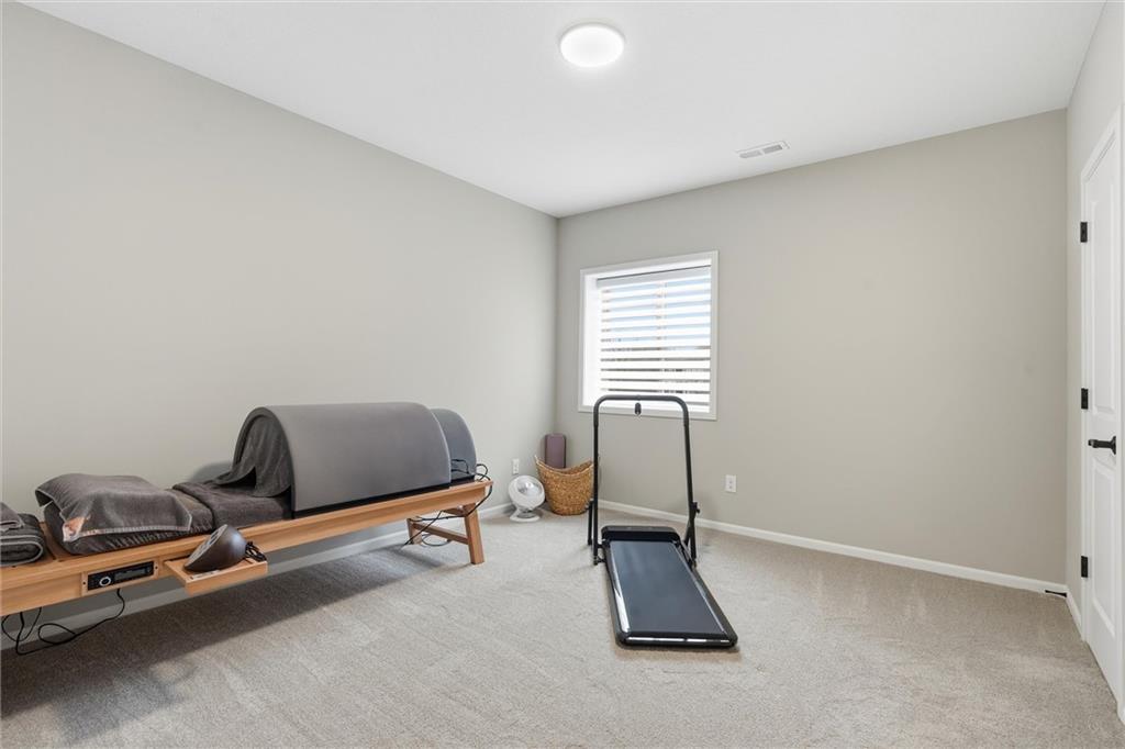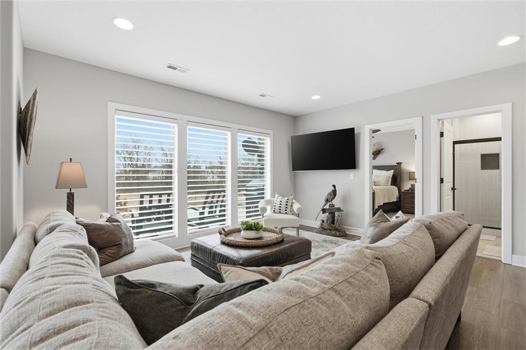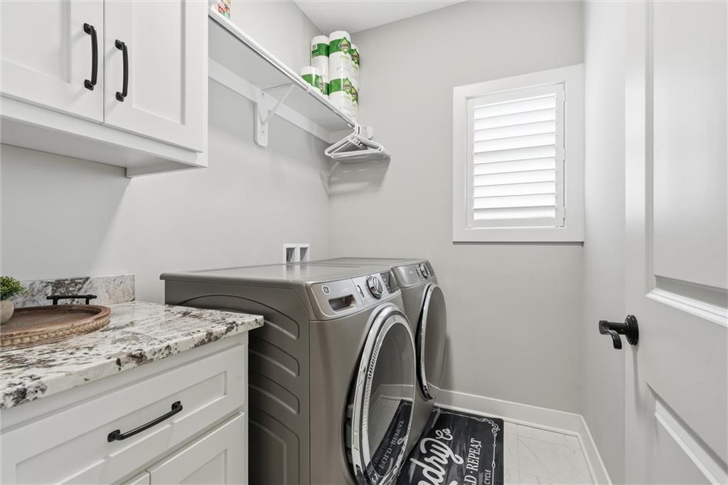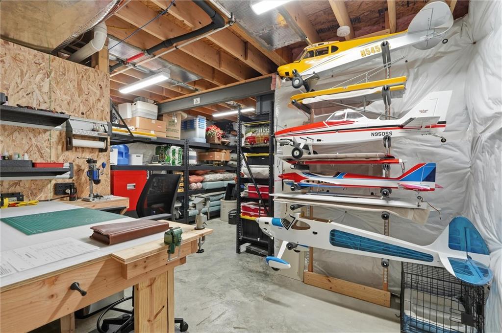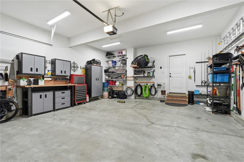 Comfort continues with an ADT security system, premium window treatments, upgraded ceiling fans, and enhanced low-voltage wiring. Storage is maximized with custom closets, a Gladiator garage system, basement shelving, and a lit workbench. The garage also includes a 50-amp RV plug.