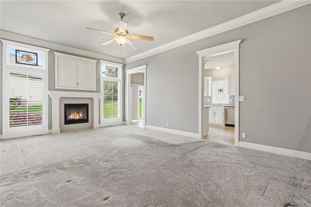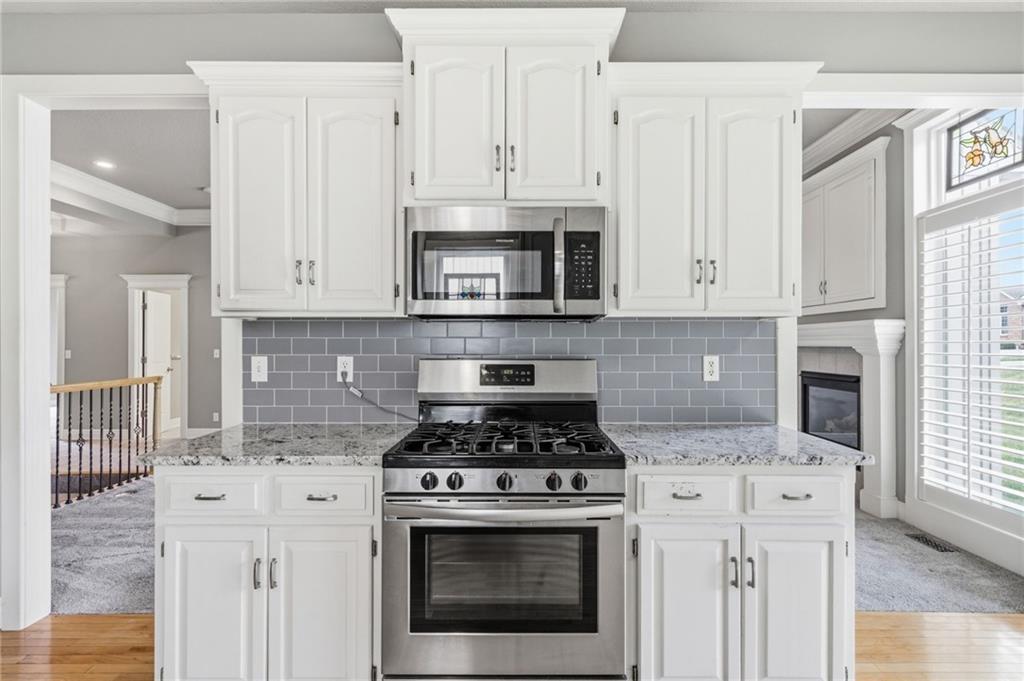 Step inside to a spacious living room featuring a cozy fireplace, with large windows on each side, complete with plantation shutters that fill the space with natural light . Just off the living room, the eat-in kitchen offers white cabinetry, granite countertops, stainless steel appliances, and a convenient built-in desk with upper cabinets—perfect for staying organized. A sliding door leads directly to the patio, making it easy to enjoy outdoor relaxation.