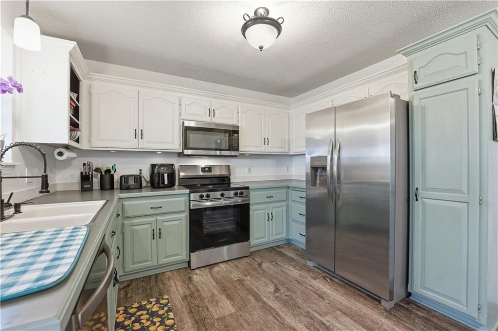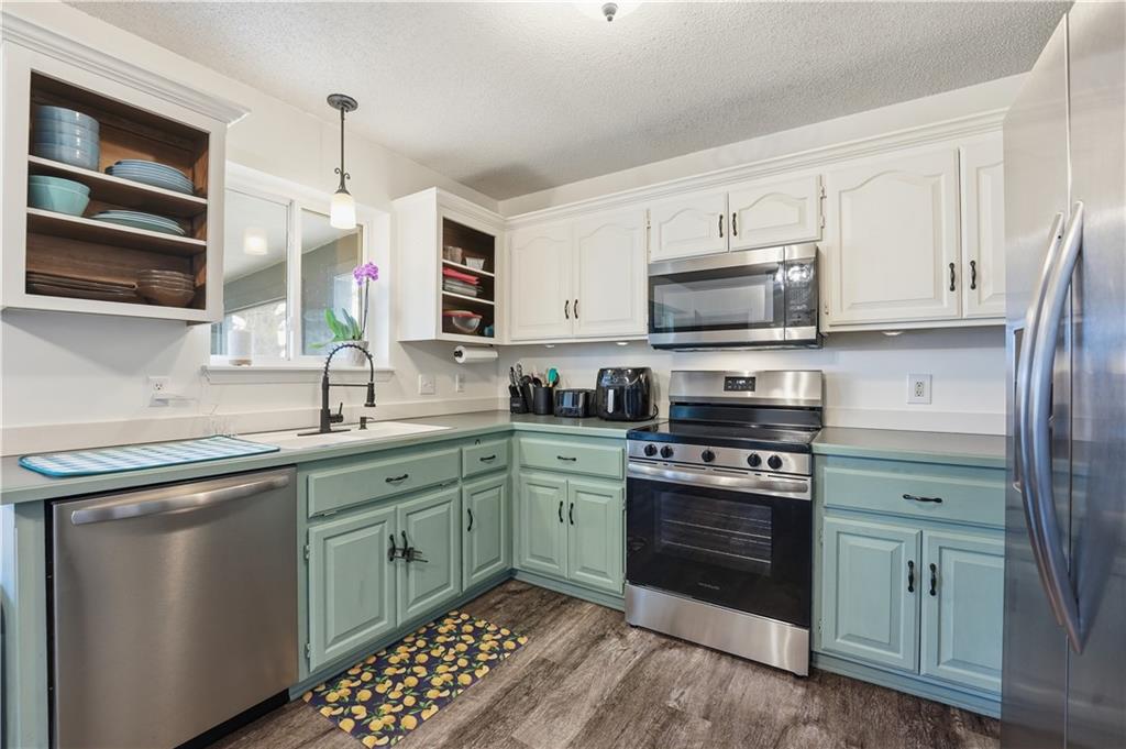 - Appliances Dishwasher, Disposal, Refrigerator, Free-Standing Electric Oven, Stainless Steel Appliance(s)