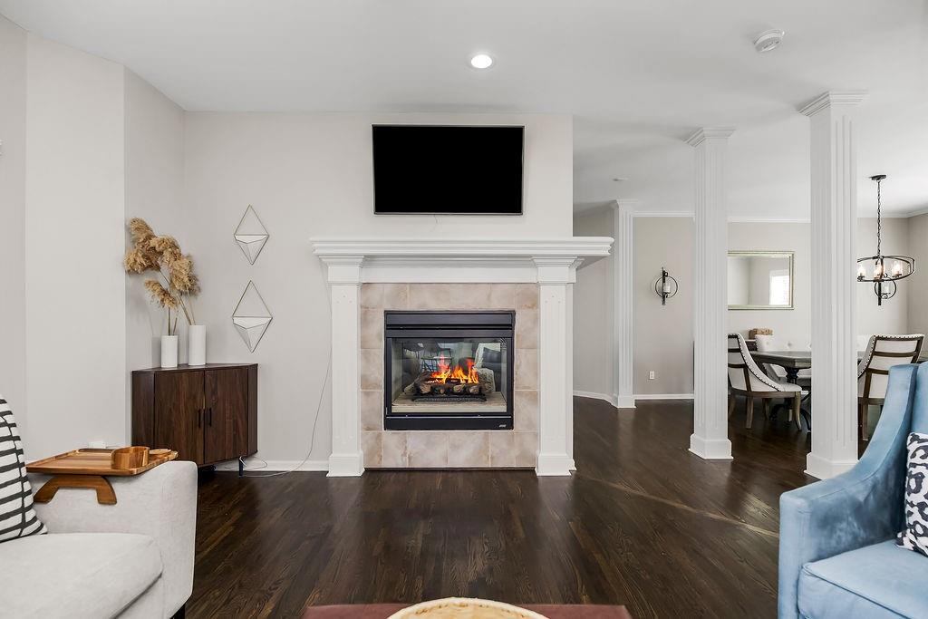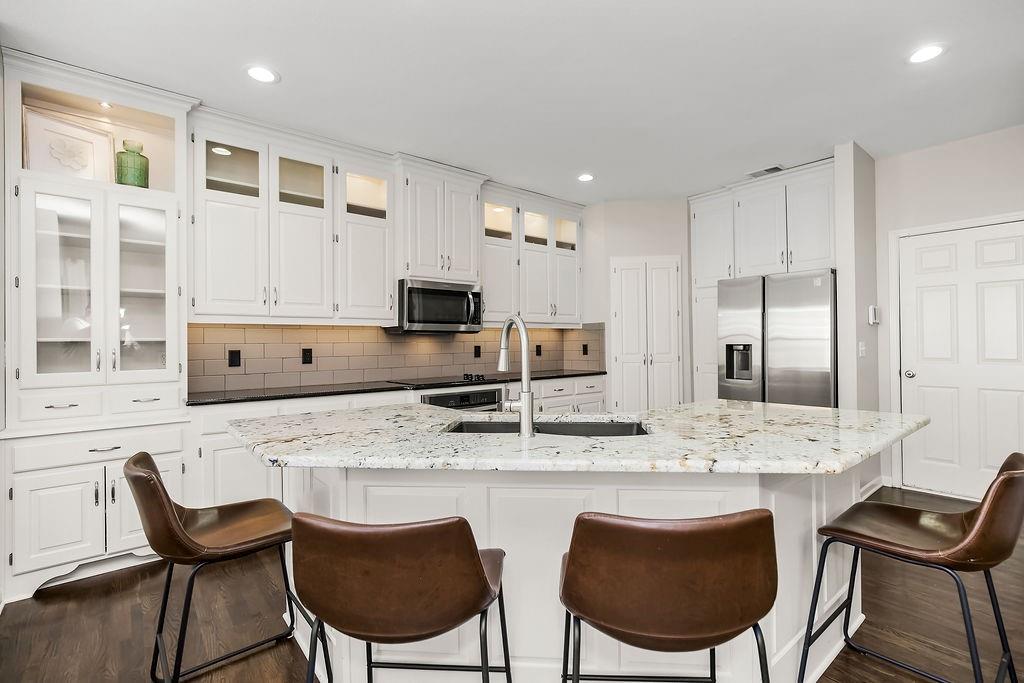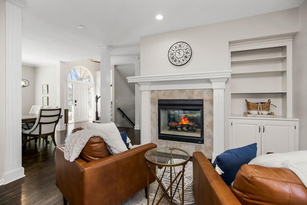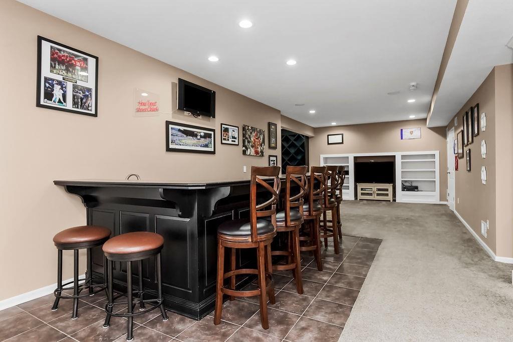 This spacious 2-story home on a large corner lot backs to green space and offers over 3,100 square feet with 4 bedrooms, 3 full and 1 half bathrooms. With a layout designed for both everyday living and entertaining. The main level features a bright kitchen with white cabinetry, under-cabinet lighting, stainless steel appliances, a cooktop, a pantry, and both formal and casual dining spaces. A cozy hearth room with a see-through gas fireplace connects seamlessly to the family room and leads out to a newer covered deck. Upstairs, all four bedrooms provide comfortable living, including a generous primary suite with a tray ceiling, a jetted tub, a walk-in shower, a double vanity, and a walk-in closet. Laundry room on the second floor for added convenience. The finished walk-out basement is built for entertaining, complete with a full wet bar, wine storage, a beverage fridge, and a surround sound system, and walks out to a fenced-in yard with a partially covered patio and an outdoor bar! Additional updates include a new roof in 2024, newer exterior paint, and entry lighting. Located in the Thousand Oaks community with neighborhood amenities including pools, trails, tennis courts, and more!