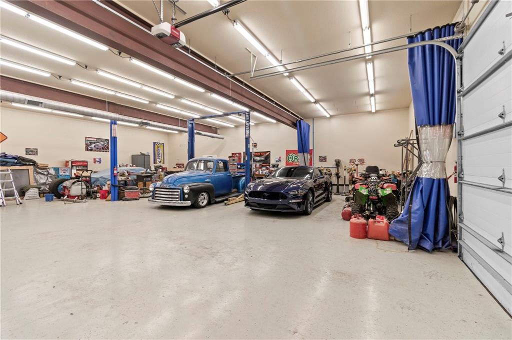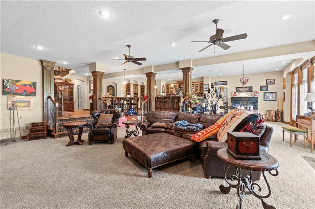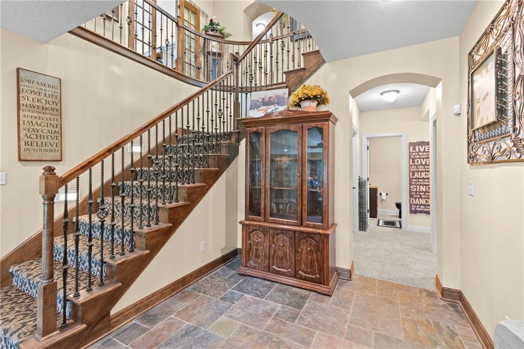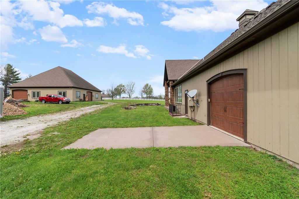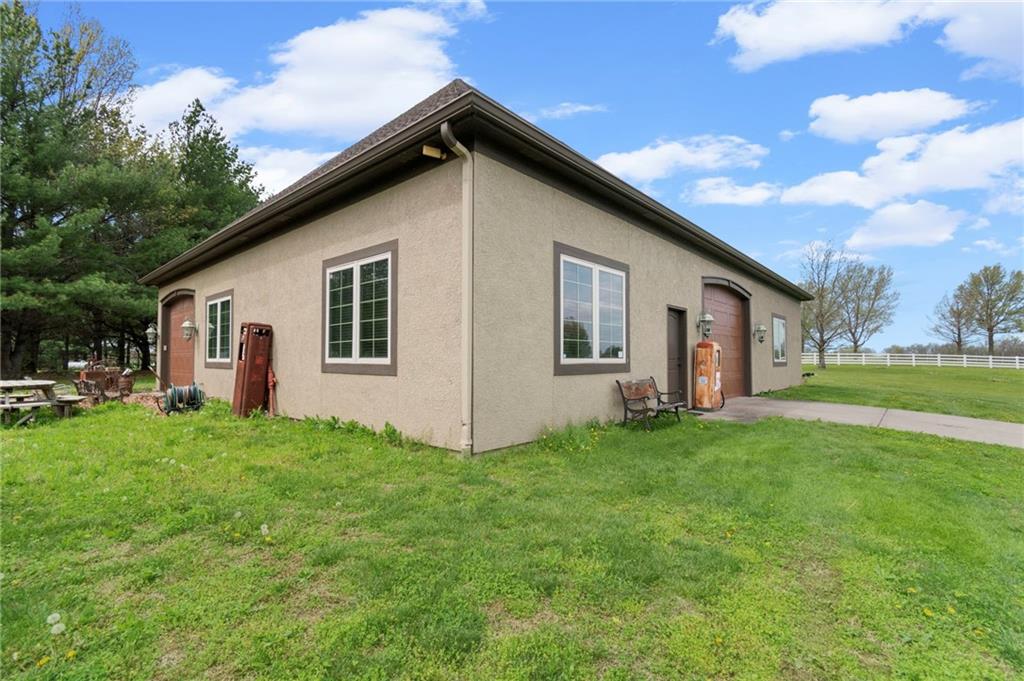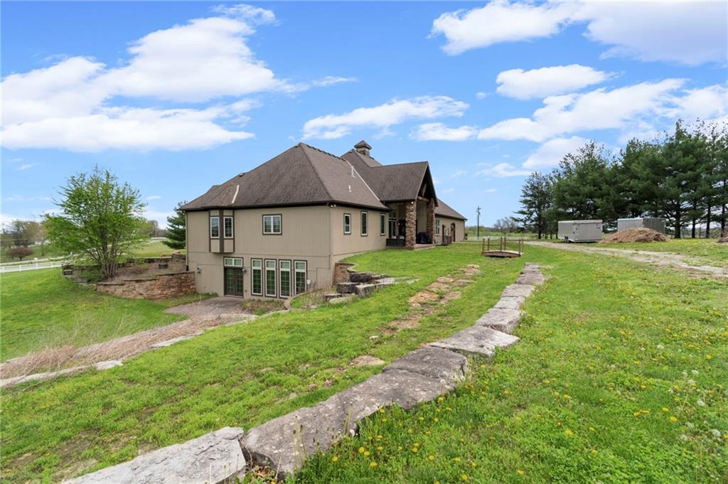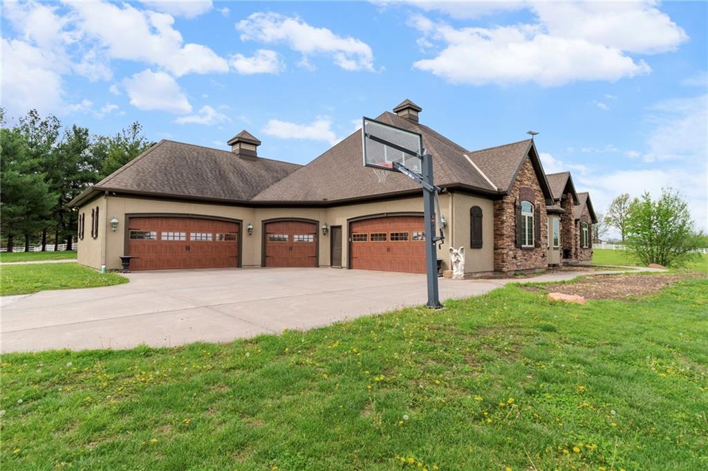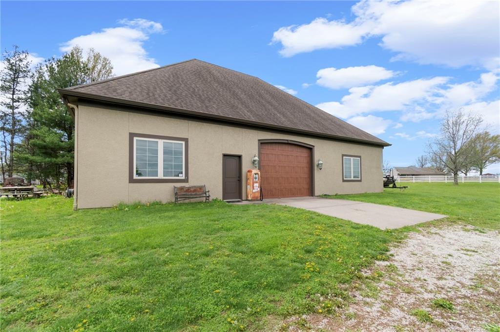Set on nearly five acres just outside of town, this Kearney estate checks every box and then adds a few you didn’t know you needed. Inside, the main living space opens into a layout that feels open and intentional. The living room, dining area, and kitchen flow together seamlessly, anchored by hardwood floors and natural light. A fireplace with custom built-ins adds a focal point.The kitchen is built for real life and gatherings. Granite countertops, custom cabinetry, double wall ovens, and an oversized island make prep and hosting easy. A walk-in pantry keeps everything tucked away. The main level offers flexibility with a front room that can serve as a bedroom, formal dining space, or office. Two additional bedrooms share a well-designed bath with separate vanity areas. The primary suite is set apart, featuring a large walk-in closet and spa-like bath with soaking tub, tiled shower with dual heads, and double vanity. Laundry and a half bath complete the level. Downstairs, the finished lower level is built for hosting. A full wet bar with a large island opens into a second living area with its own fireplace. A private bedroom and bath make it ideal for guests or multi-generational living, along with a half bath and flexible space for a gym, office, or sixth non-conforming bedroom. Storage is extensive, with a suspended slab design offering approximately 55×31 of storage space, plus an additional 21×11 area that also functions as a secure storm shelter. The six-car attached garage provides plenty of space, and the detached 50×60 shop adds even more with its own office, bathroom, car wash, and paint bay, plus an unfinished upper level. Built with intention, the home features structural beams for wide open spaces, twelve-foot ceilings on both levels, geothermal heating, and energy-efficient windows. Mineral rights convey with the property, including oil and water discovered during the geothermal process and registered with the Missouri Department of Natural Resources.