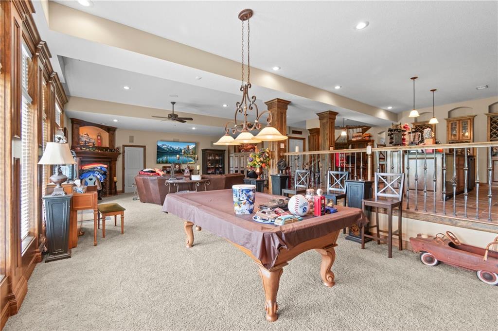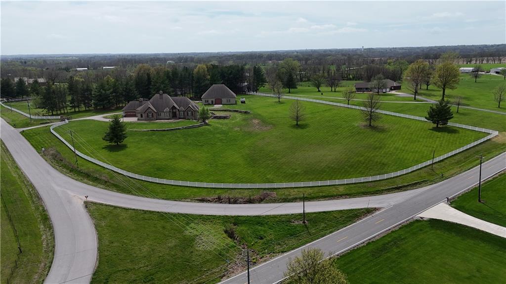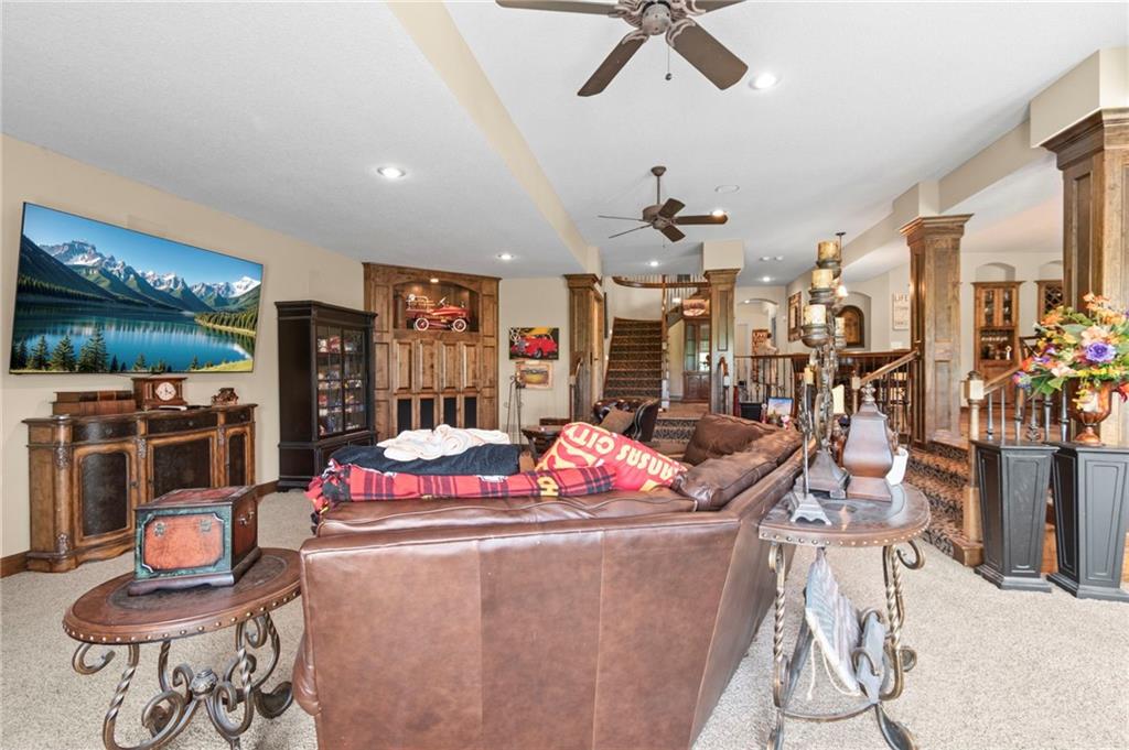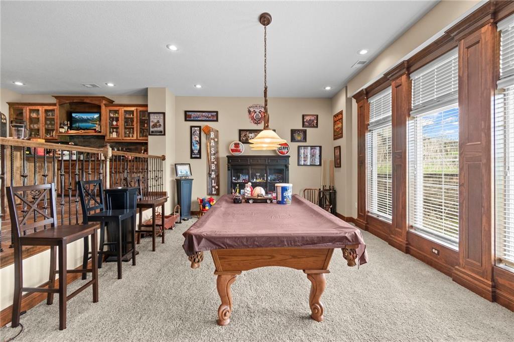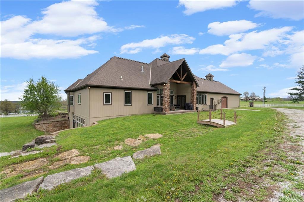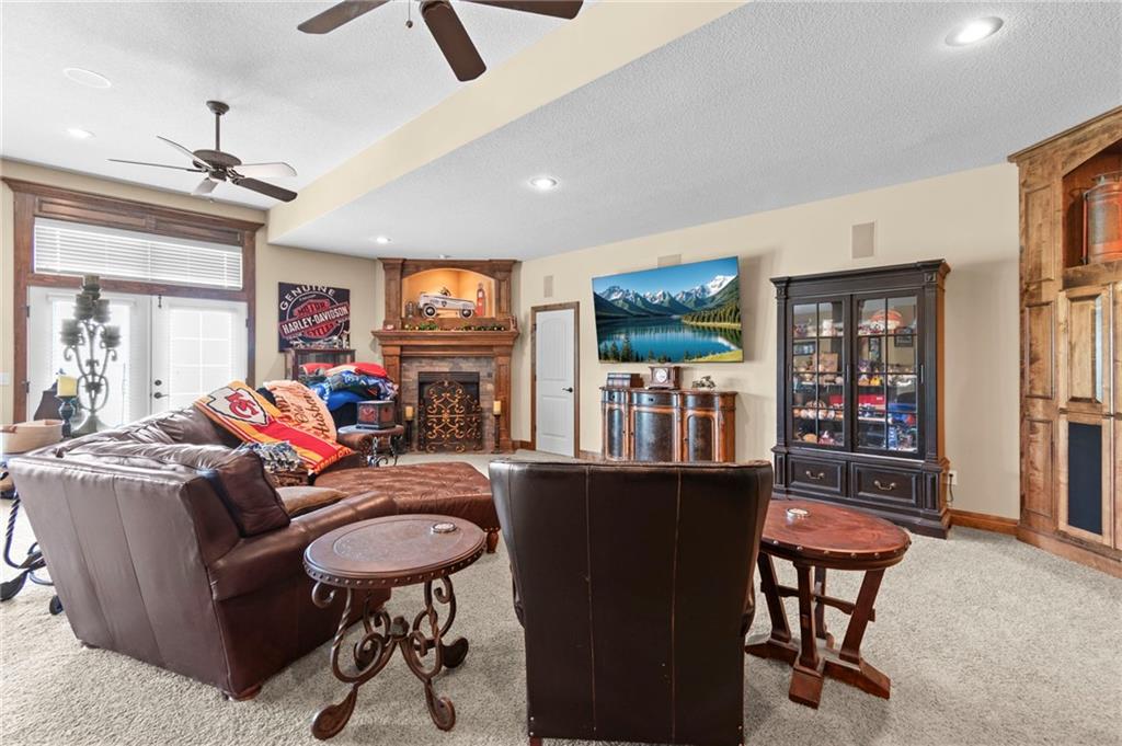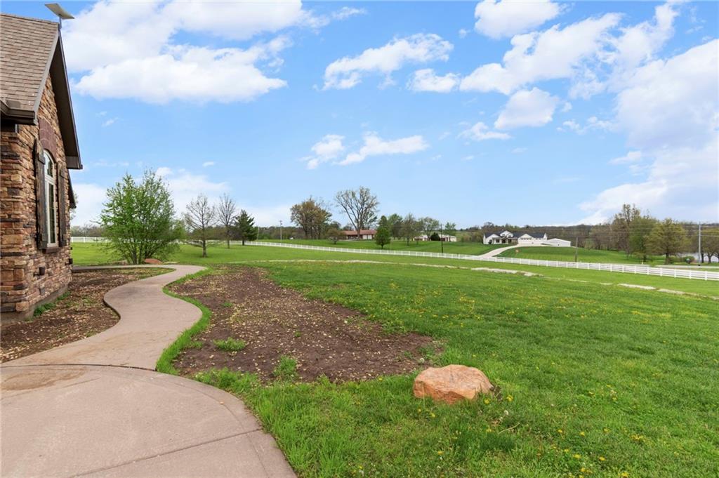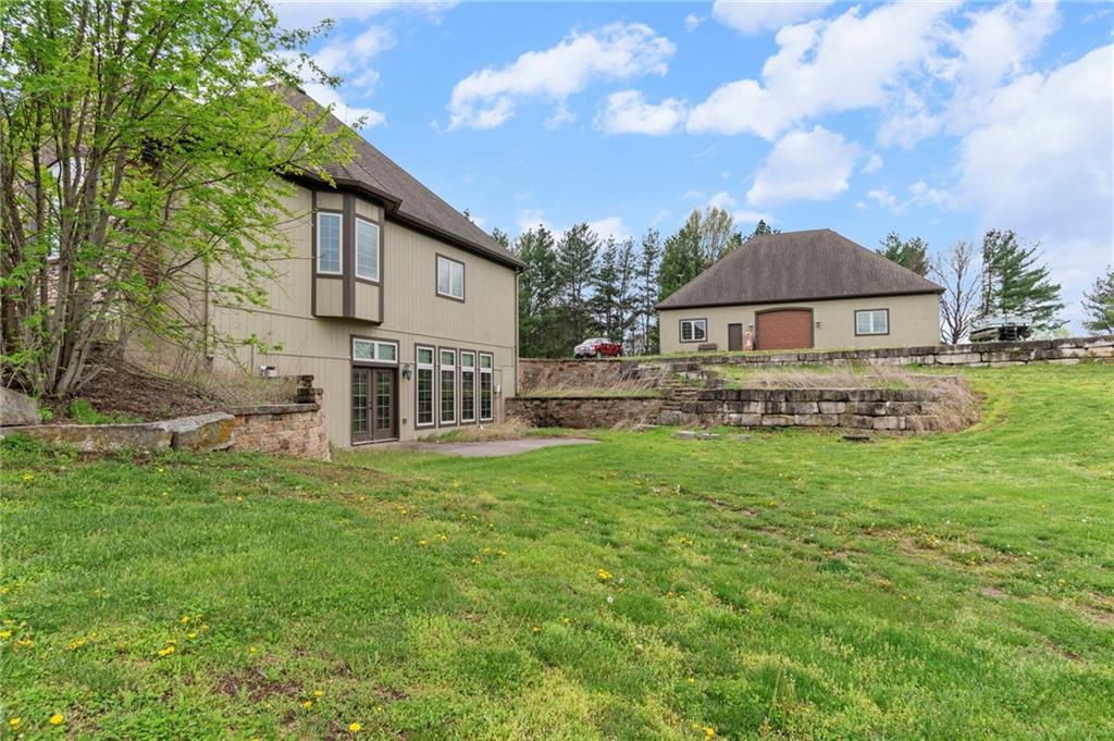 Set on nearly five acres just outside of town, this Kearney estate checks every box and then adds a few you didn’t know you needed. Inside, the main living space opens into a layout that feels open and intentional. The living room, dining area, and kitchen flow together seamlessly, anchored by hardwood floors and natural light. A fireplace with custom built-ins adds a focal point.The kitchen is built for real life and gatherings. Granite countertops, custom cabinetry, double wall ovens, and an oversized island make prep and hosting easy. A walk-in pantry keeps everything tucked away. The main level offers flexibility with a front room that can serve as a bedroom, formal dining space, or office. Two additional bedrooms share a well-designed bath with separate vanity areas. The primary suite is set apart, featuring a large walk-in closet and spa-like bath with soaking tub, tiled shower with dual heads, and double vanity. Laundry and a half bath complete the level. Downstairs, the finished lower level is built for hosting. A full wet bar with a large island opens into a second living area with its own fireplace. A private bedroom and bath make it ideal for guests or multi-generational living, along with a half bath and flexible space for a gym, office, or sixth non-conforming bedroom. Storage is extensive, with a suspended slab design offering approximately 55×31 of storage space, plus an additional 21×11 area that also functions as a secure storm shelter. The six-car attached garage provides plenty of space, and the detached 50×60 shop adds even more with its own office, bathroom, car wash, and paint bay, plus an unfinished upper level. Built with intention, the home features structural beams for wide open spaces, twelve-foot ceilings on both levels, geothermal heating, and energy-efficient windows. Mineral rights convey with the property, including oil and water discovered during the geothermal process and registered with the Missouri Department of Natural Resources.