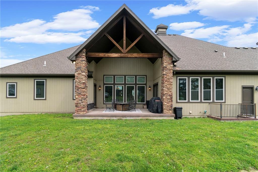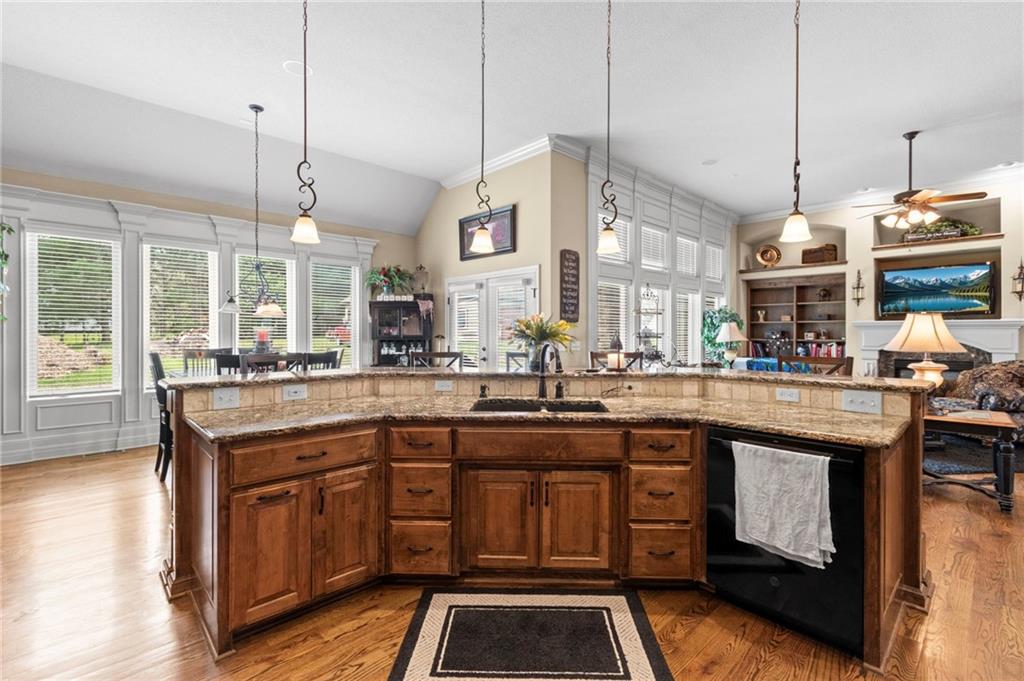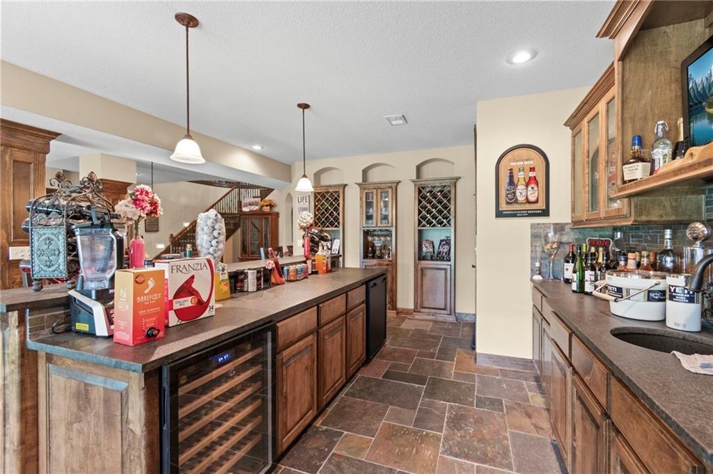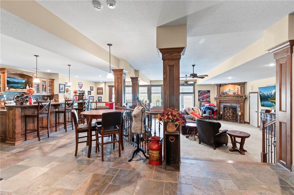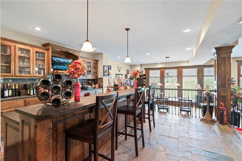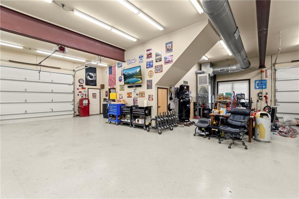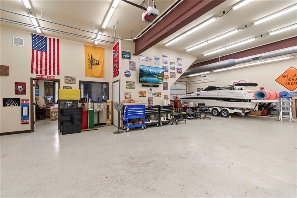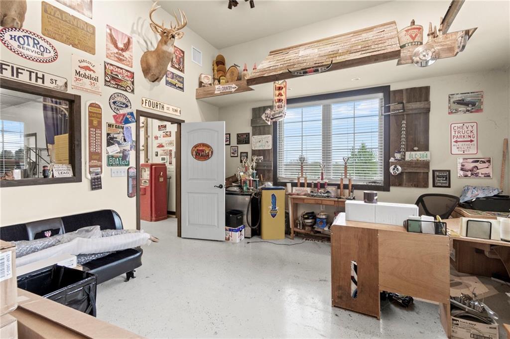Set on nearly five acres just outside of town, this Kearney estate checks every box and then adds a few you didn’t know you needed. Inside, the main living space opens into a layout that feels open and intentional. The living room, dining area, and kitchen flow together seamlessly, anchored by hardwood floors and natural light. A fireplace with custom built-ins adds a focal point.The kitchen is built for real life and gatherings. Granite countertops, custom cabinetry, double wall ovens, and an oversized island make prep and hosting easy. A walk-in pantry keeps everything tucked away. The main level offers flexibility with a front room that can serve as a bedroom, formal dining space, or office. Two additional bedrooms share a well-designed bath with separate vanity areas. The primary suite is set apart, featuring a large walk-in closet and spa-like bath with soaking tub, tiled shower with dual heads, and double vanity. Laundry and a half bath complete the level. Downstairs, the finished lower level is built for hosting. A full wet bar with a large island opens into a second living area with its own fireplace. A private bedroom and bath make it ideal for guests or multi-generational living, along with a half bath and flexible space for a gym, office, or sixth non-conforming bedroom. Storage is extensive, with a suspended slab design offering approximately 55×31 of storage space, plus an additional 21×11 area that also functions as a secure storm shelter. The six-car attached garage provides plenty of space, and the detached 50×60 shop adds even more with its own office, bathroom, car wash, and paint bay, plus an unfinished upper level. Built with intention, the home features structural beams for wide open spaces, twelve-foot ceilings on both levels, geothermal heating, and energy-efficient windows. Mineral rights convey with the property, including oil and water discovered during the geothermal process and registered with the Missouri Department of Natural Resources.