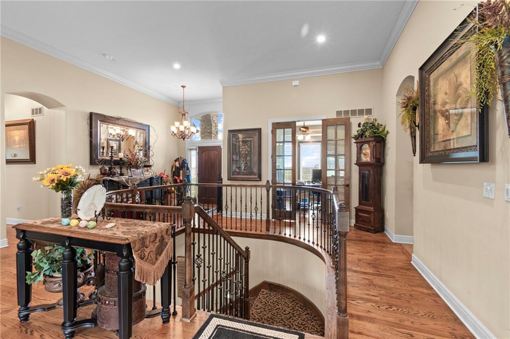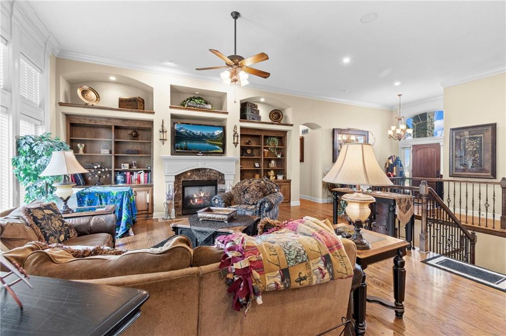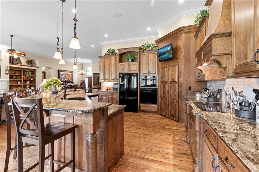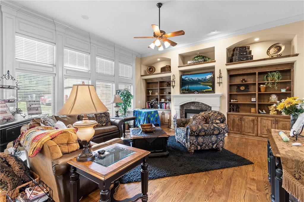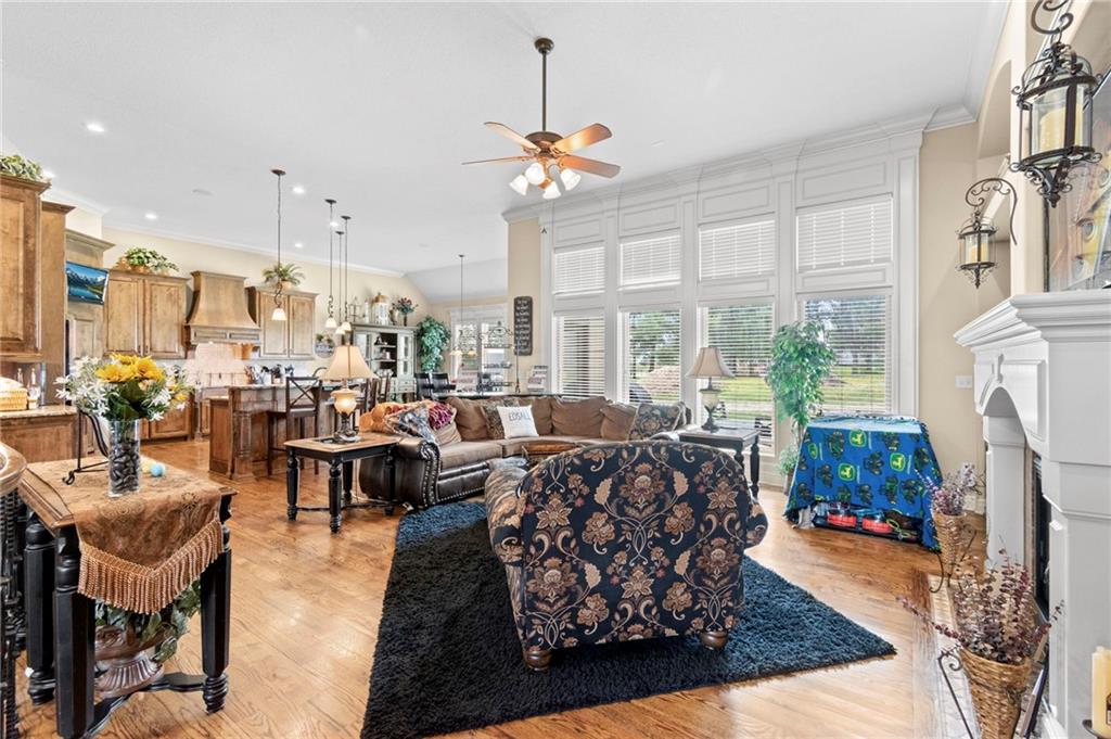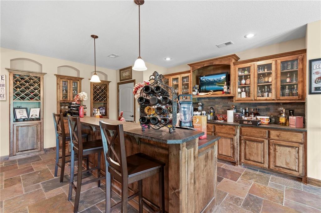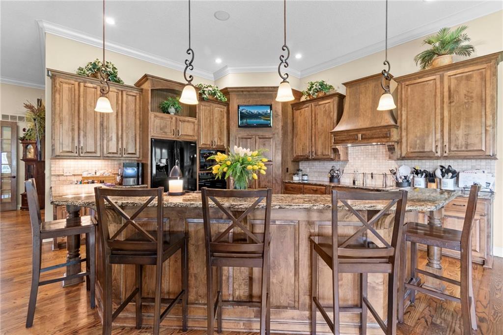 Set on nearly five acres just outside of town, this Kearney estate checks every box and then adds a few you didn’t know you needed. Inside, the main living space opens into a layout that feels open and intentional. The living room, dining area, and kitchen flow together seamlessly, anchored by hardwood floors and natural light. A fireplace with custom built-ins adds a focal point.The kitchen is built for real life and gatherings. Granite countertops, custom cabinetry, double wall ovens, and an oversized island make prep and hosting easy. A walk-in pantry keeps everything tucked away. The main level offers flexibility with a front room that can serve as a bedroom, formal dining space, or office. Two additional bedrooms share a well-designed bath with separate vanity areas. The primary suite is set apart, featuring a large walk-in closet and spa-like bath with soaking tub, tiled shower with dual heads, and double vanity. Laundry and a half bath complete the level. Downstairs, the finished lower level is built for hosting. A full wet bar with a large island opens into a second living area with its own fireplace. A private bedroom and bath make it ideal for guests or multi-generational living, along with a half bath and flexible space for a gym, office, or sixth non-conforming bedroom. Storage is extensive, with a suspended slab design offering approximately 55×31 of storage space, plus an additional 21×11 area that also functions as a secure storm shelter. The six-car attached garage provides plenty of space, and the detached 50×60 shop adds even more with its own office, bathroom, car wash, and paint bay, plus an unfinished upper level. Built with intention, the home features structural beams for wide open spaces, twelve-foot ceilings on both levels, geothermal heating, and energy-efficient windows. Mineral rights convey with the property, including oil and water discovered during the geothermal process and registered with the Missouri Department of Natural Resources.