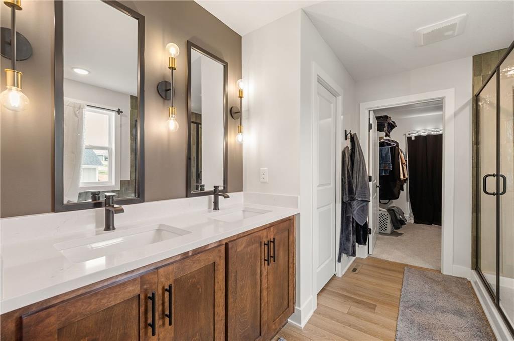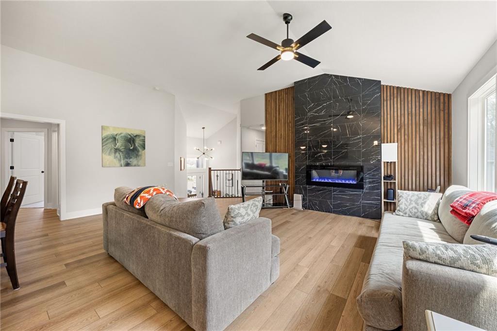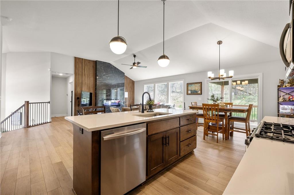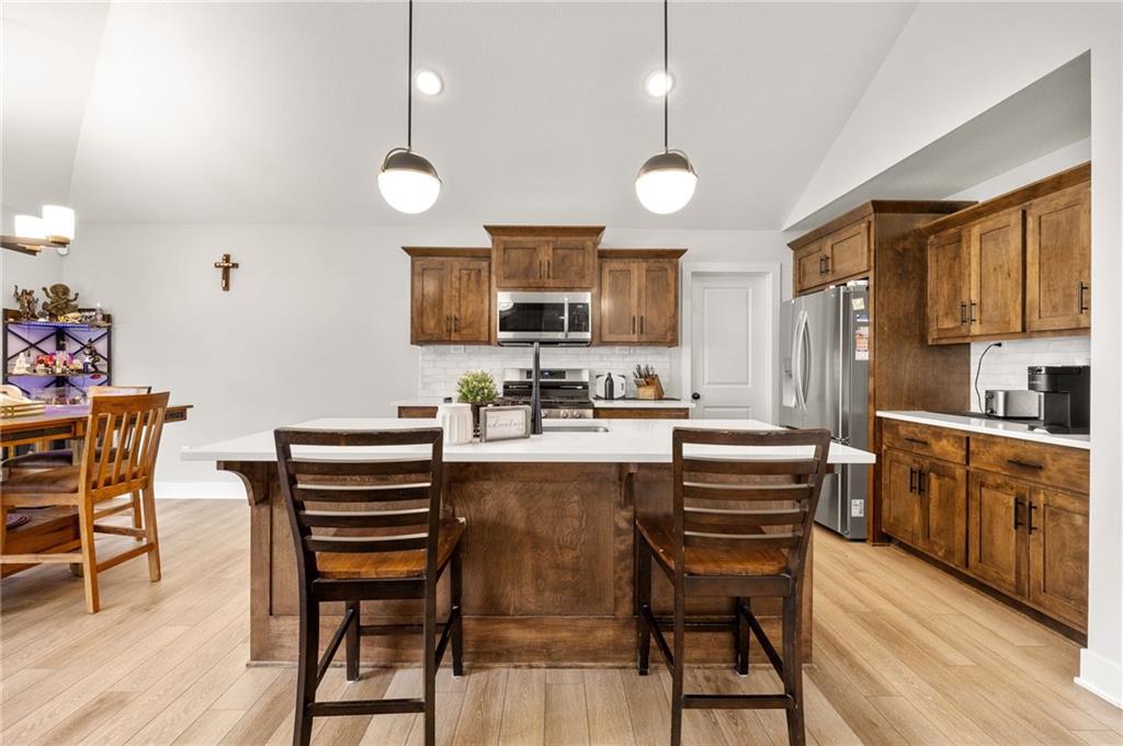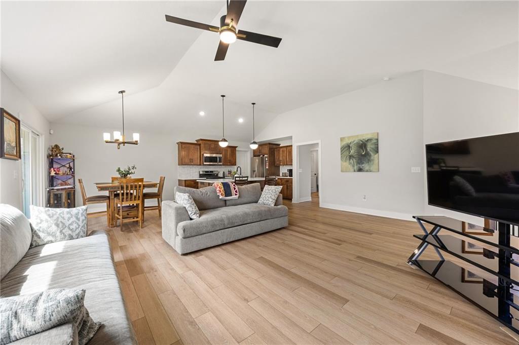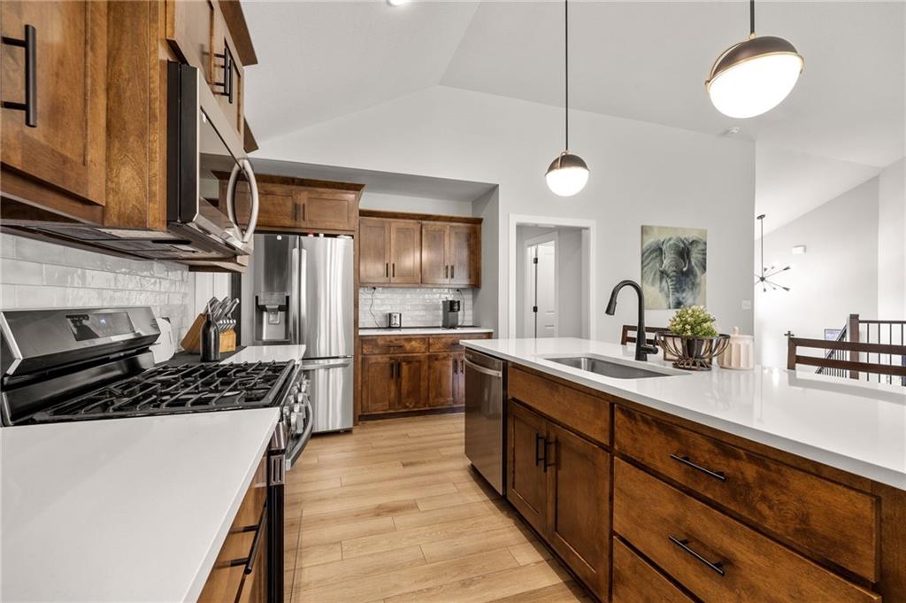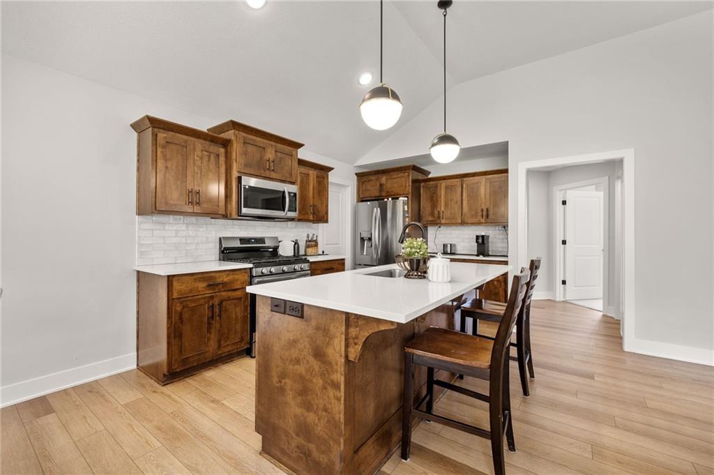 Welcome to this nearly new, beautifully upgraded home built by Kerns Homebuilders. This 4-bedroom, 3-bath property offers an open, contemporary layout with thoughtful upgrades at every turn. The main level features an open concept with a striking fireplace accent wall and large windows that fill the home with natural light. The beautifully designed kitchen includes wood cabinetry, a spacious island, stainless steel appliances, and stylish lighting—perfect for everyday living and entertaining. The primary suite is complete with a tiled shower, tub, double vanity and walk-in closet. With two additional rooms and a bathroom on the main level. The basement has a great area for entertaining with another bedroom and bathroom off the garage. Sellers are relocating for work, giving you the opportunity to move into a like-new home without the wait!