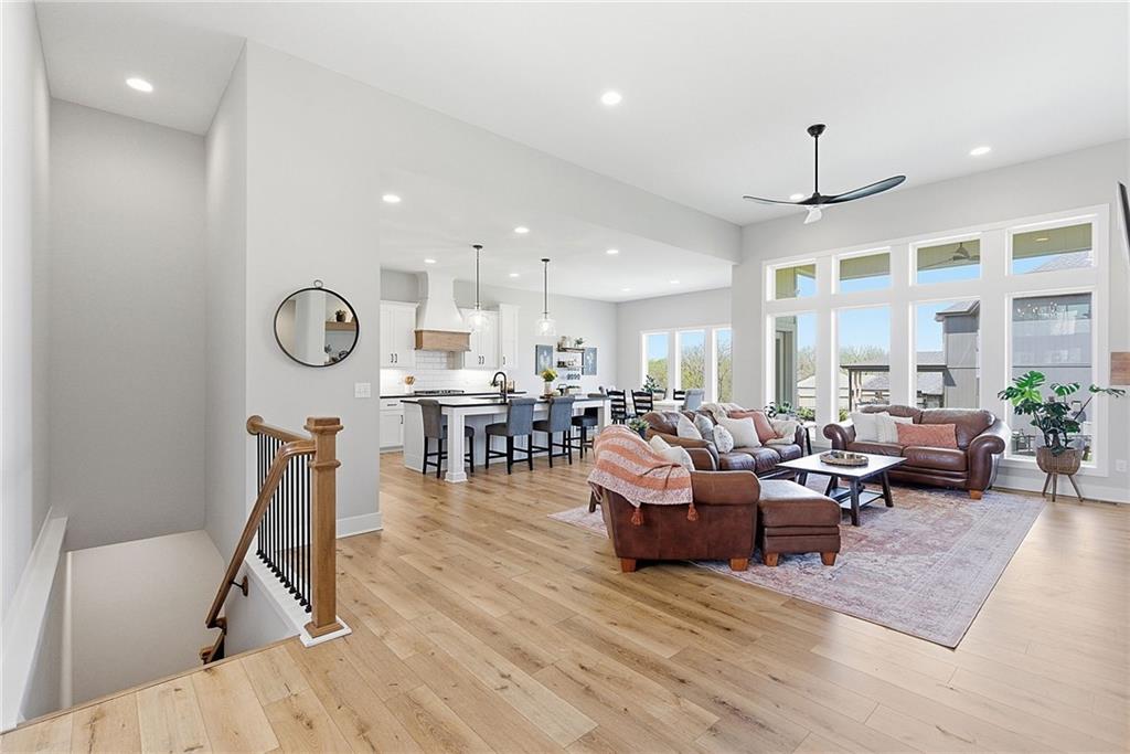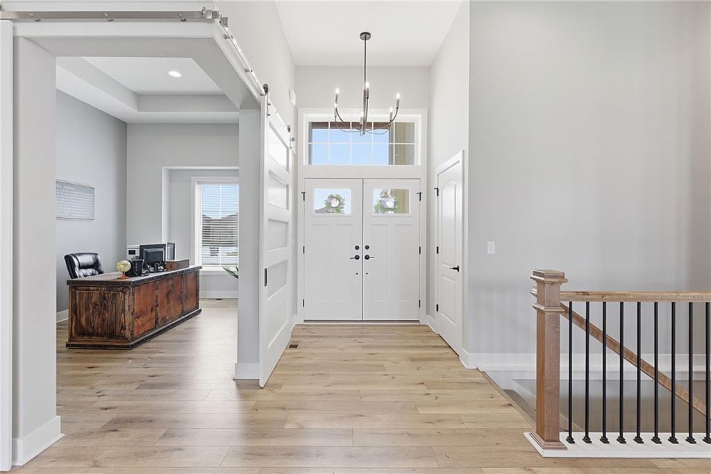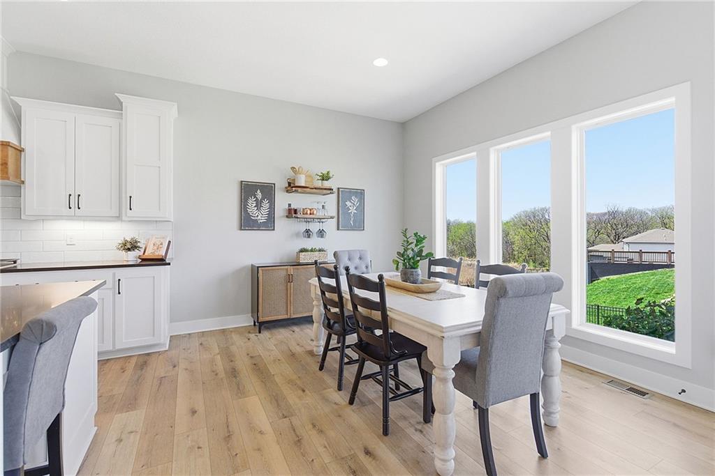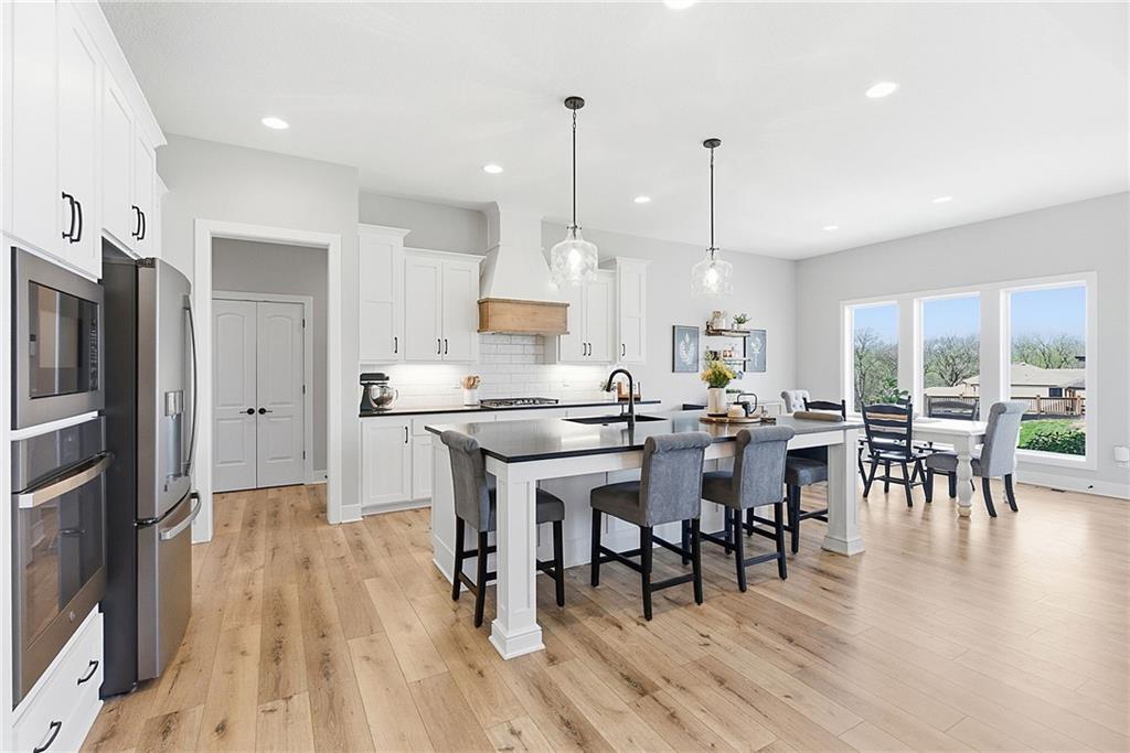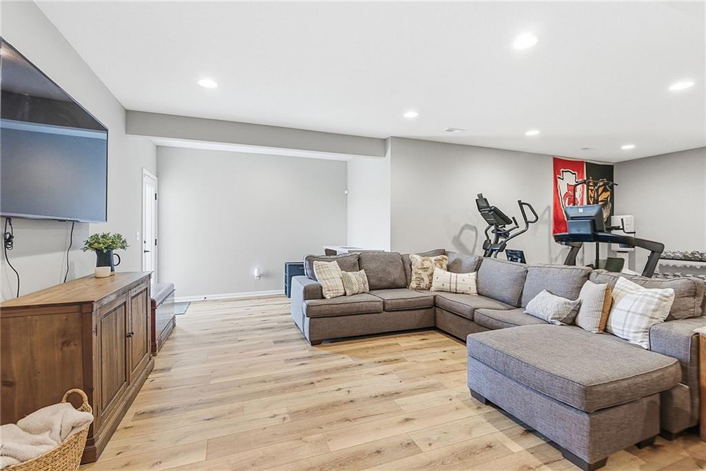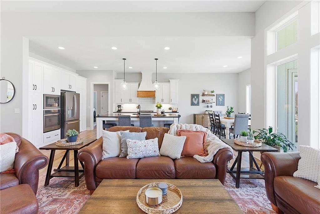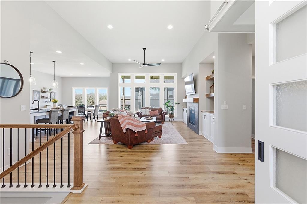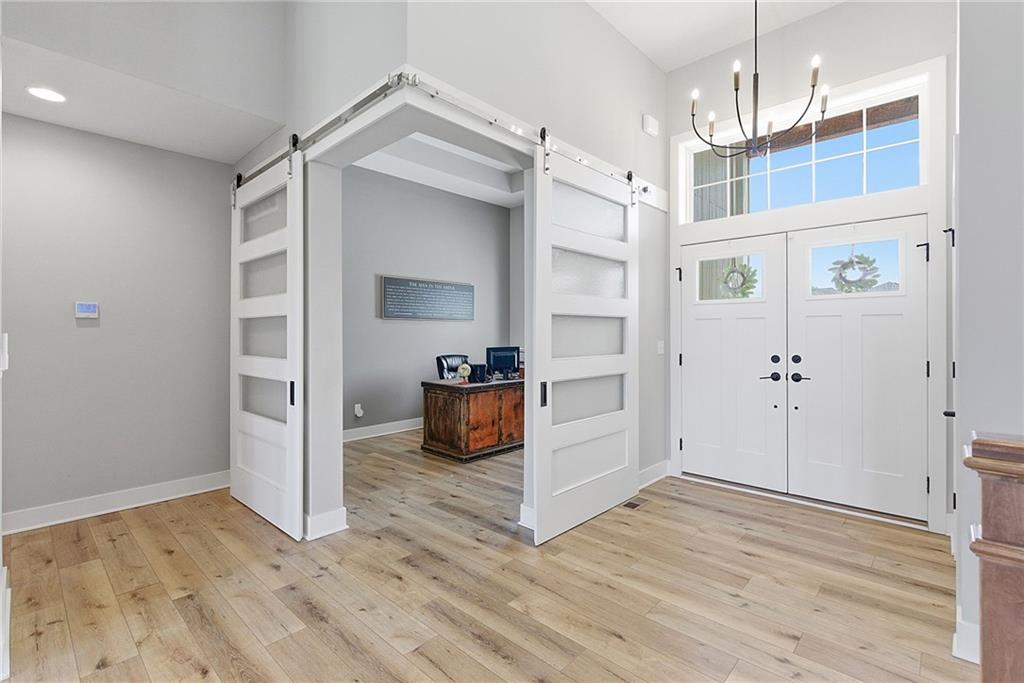 Bright and airy reverse 1.5 story designed for easy living and effortless entertaining. Luxury vinyl plank flooring runs throughout the main level, complementing the open floorplan and creating a seamless flow from room to room. A stunning wall of windows along the back of the home fills the space with natural light, making every area feel warm and inviting. The kitchen is both functional and beautiful, featuring abundant cabinetry and a large center island that’s perfect for gathering. The spacious primary suite offers a private retreat with a custom feature wall, direct access to the deck, dual vanities, a relaxing soaker tub, and a generous walk-in closet. A dedicated office on the main level provides the perfect work-from-home setup or quiet flex space. The walk-out lower level expands your living area with a large family room, wet bar, three additional bedrooms, and a second laundry room, ideal for convenience and hosting. Step outside to enjoy the large yard from either the covered deck or patio, perfect for relaxing or entertaining in any season.