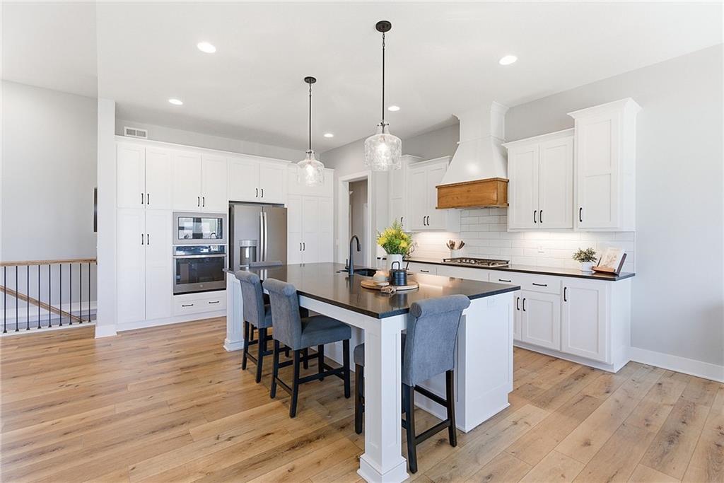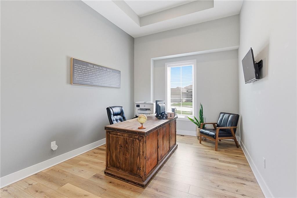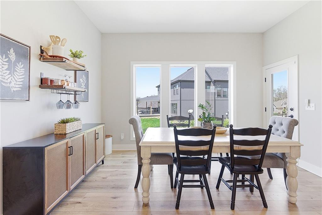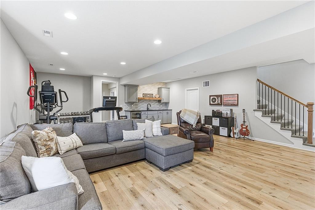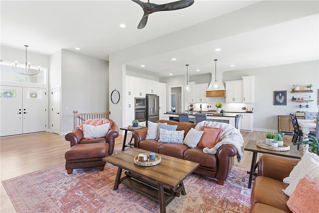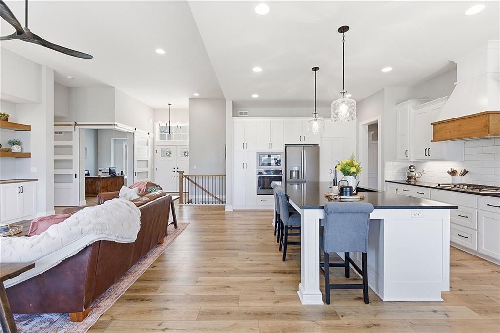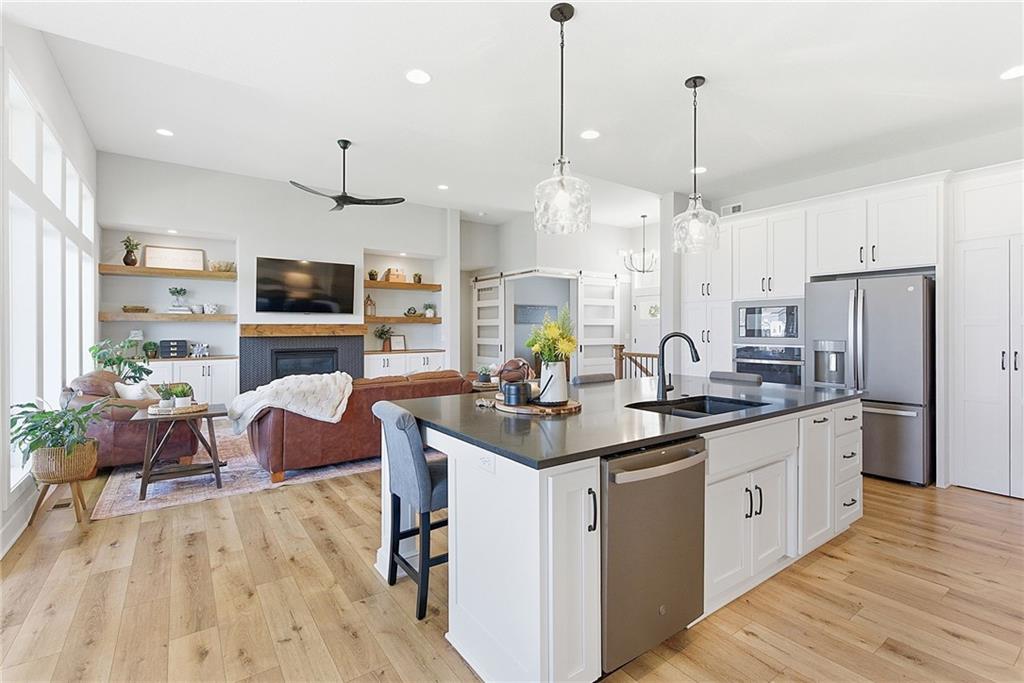 Bright and airy reverse 1.5 story designed for easy living and effortless entertaining. Luxury vinyl plank flooring runs throughout the main level, complementing the open floorplan and creating a seamless flow from room to room. A stunning wall of windows along the back of the home fills the space with natural light, making every area feel warm and inviting. The kitchen is both functional and beautiful, featuring abundant cabinetry and a large center island that’s perfect for gathering. The spacious primary suite offers a private retreat with a custom feature wall, direct access to the deck, dual vanities, a relaxing soaker tub, and a generous walk-in closet. A dedicated office on the main level provides the perfect work-from-home setup or quiet flex space. The walk-out lower level expands your living area with a large family room, wet bar, three additional bedrooms, and a second laundry room, ideal for convenience and hosting. Step outside to enjoy the large yard from either the covered deck or patio, perfect for relaxing or entertaining in any season.