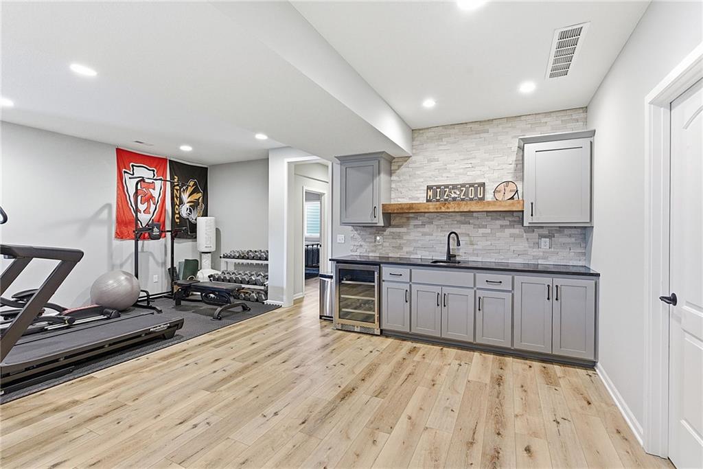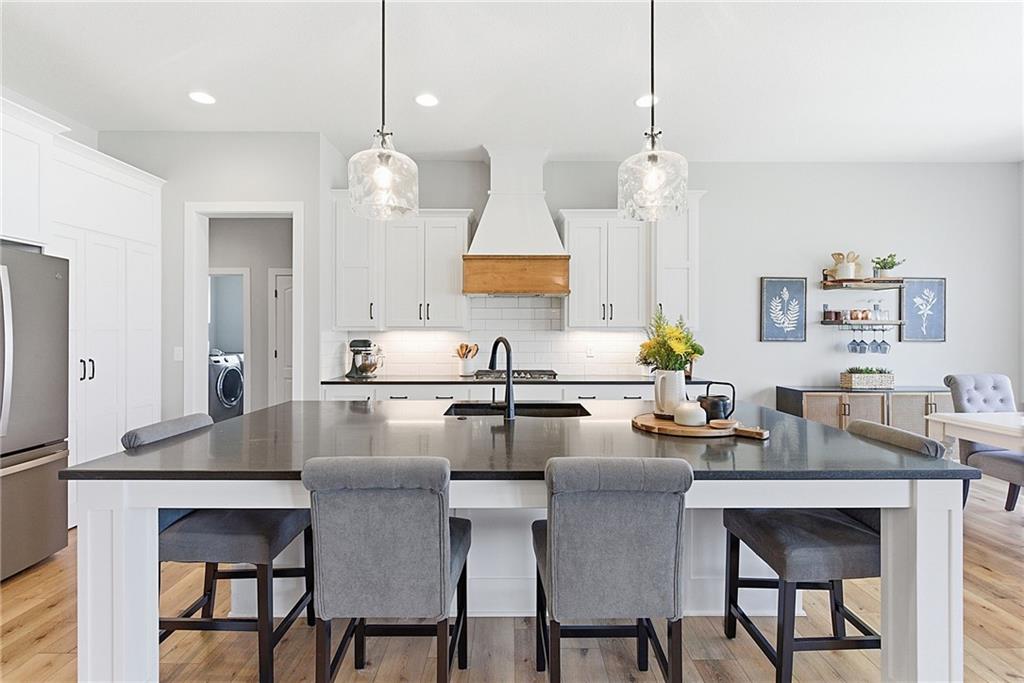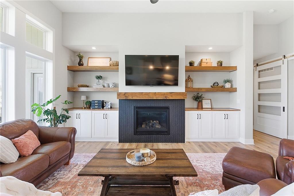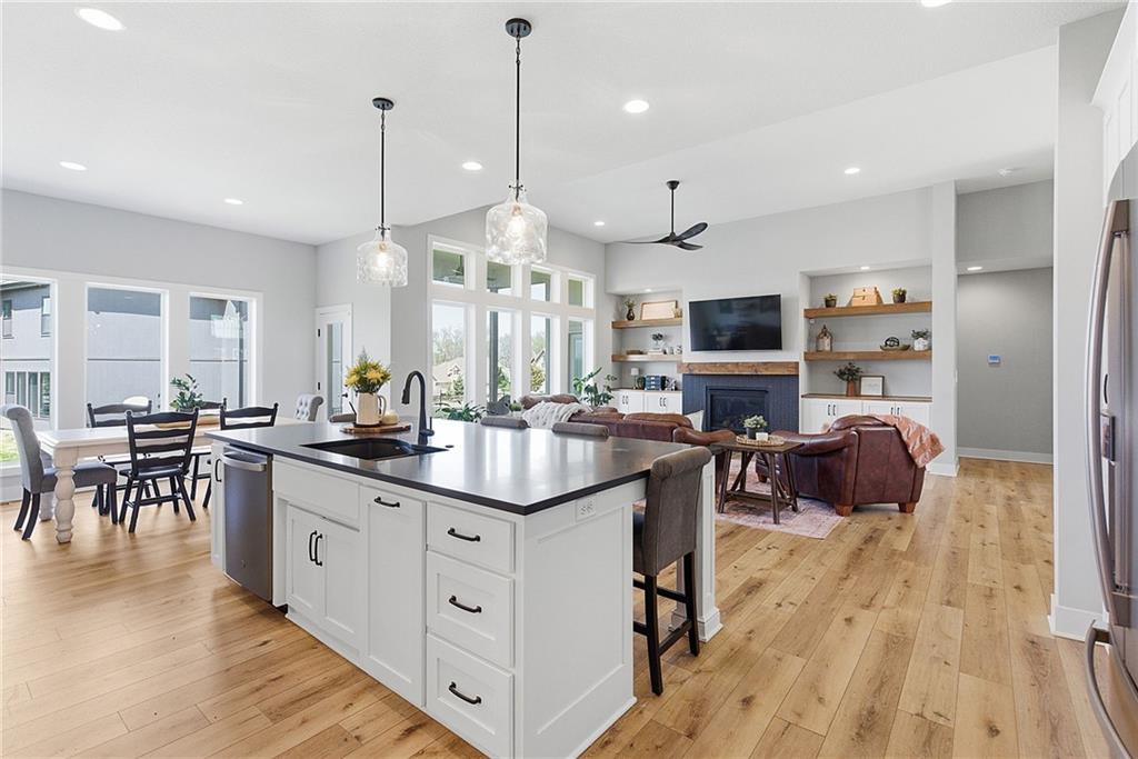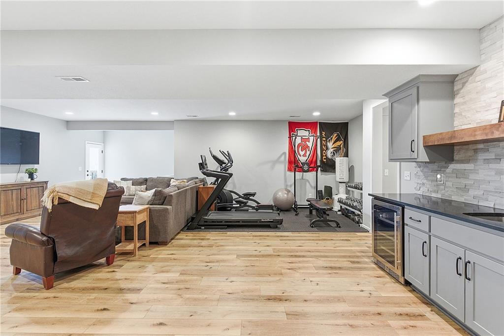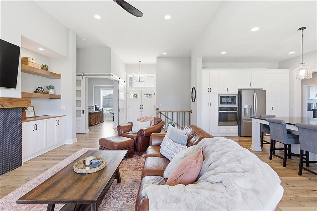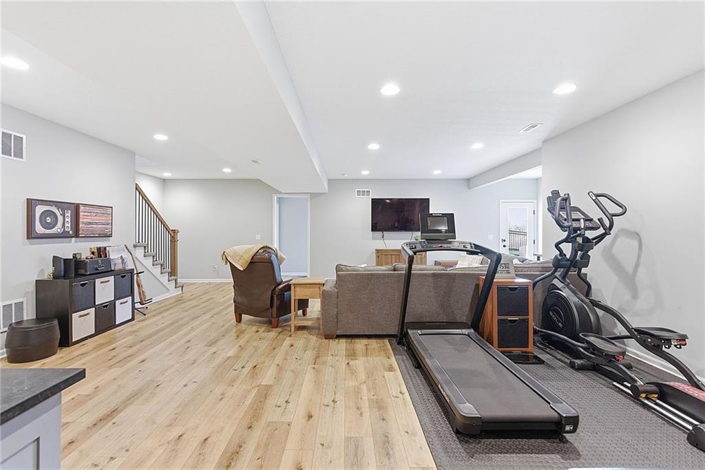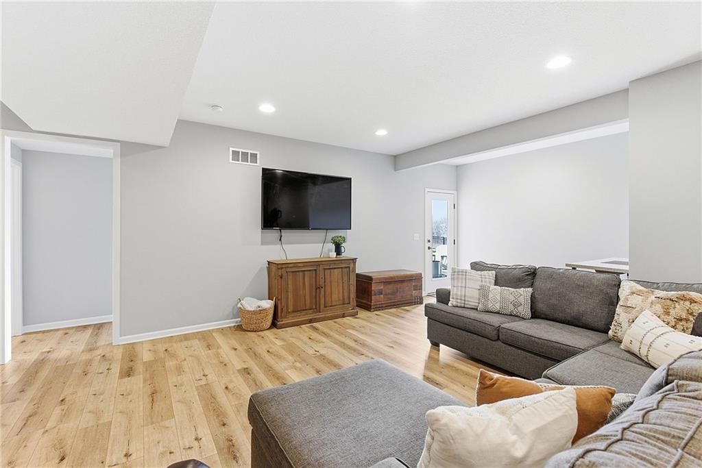 Bright and airy reverse 1.5 story designed for easy living and effortless entertaining. Luxury vinyl plank flooring runs throughout the main level, complementing the open floorplan and creating a seamless flow from room to room. A stunning wall of windows along the back of the home fills the space with natural light, making every area feel warm and inviting. The kitchen is both functional and beautiful, featuring abundant cabinetry and a large center island that’s perfect for gathering. The spacious primary suite offers a private retreat with a custom feature wall, direct access to the deck, dual vanities, a relaxing soaker tub, and a generous walk-in closet. A dedicated office on the main level provides the perfect work-from-home setup or quiet flex space. The walk-out lower level expands your living area with a large family room, wet bar, three additional bedrooms, and a second laundry room, ideal for convenience and hosting. Step outside to enjoy the large yard from either the covered deck or patio, perfect for relaxing or entertaining in any season.