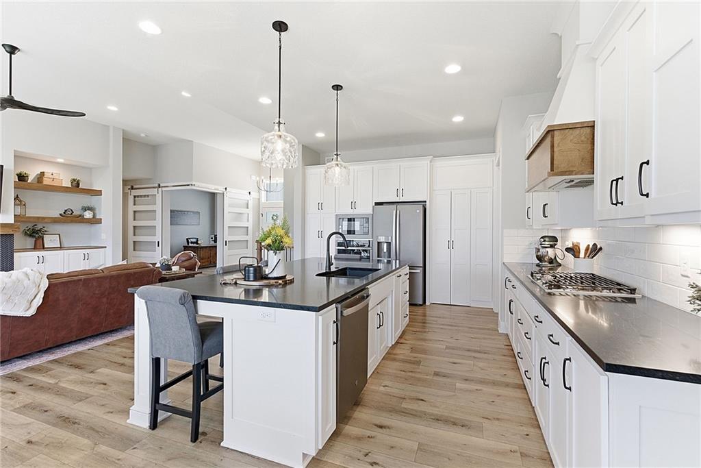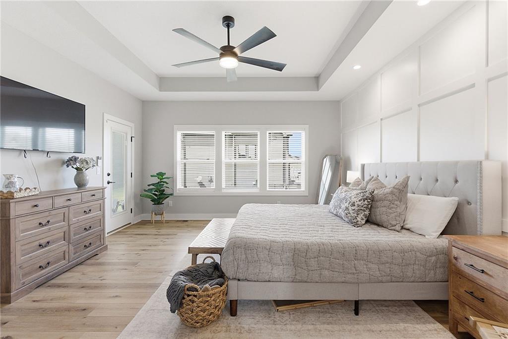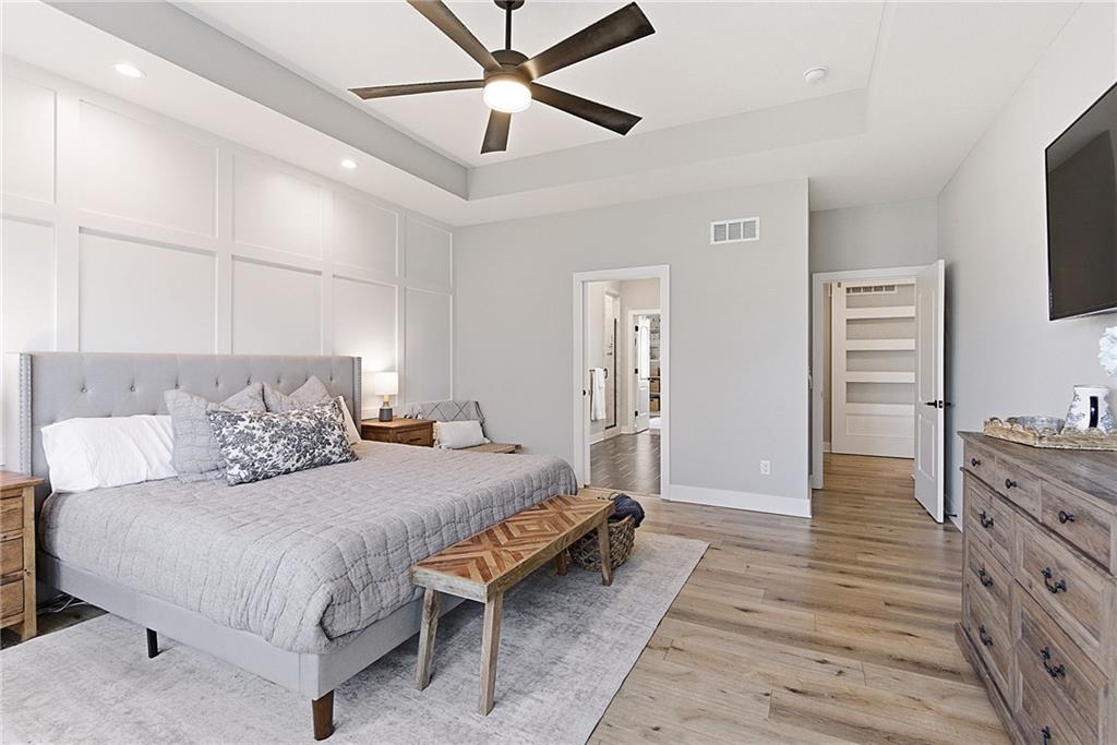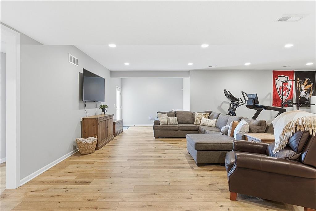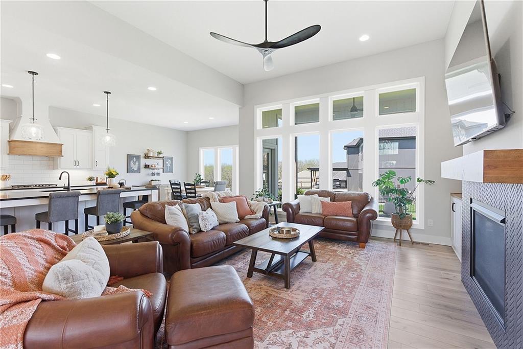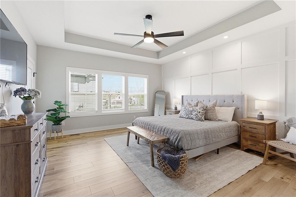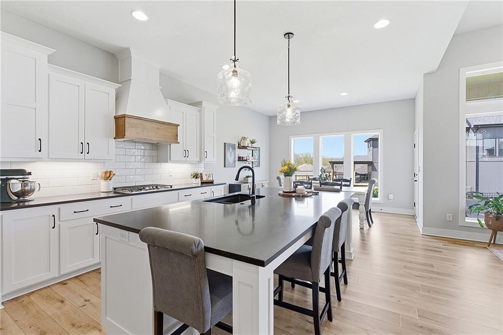 Bright and airy reverse 1.5 story designed for easy living and effortless entertaining. Luxury vinyl plank flooring runs throughout the main level, complementing the open floorplan and creating a seamless flow from room to room. A stunning wall of windows along the back of the home fills the space with natural light, making every area feel warm and inviting. The kitchen is both functional and beautiful, featuring abundant cabinetry and a large center island that’s perfect for gathering. The spacious primary suite offers a private retreat with a custom feature wall, direct access to the deck, dual vanities, a relaxing soaker tub, and a generous walk-in closet. A dedicated office on the main level provides the perfect work-from-home setup or quiet flex space. The walk-out lower level expands your living area with a large family room, wet bar, three additional bedrooms, and a second laundry room, ideal for convenience and hosting. Step outside to enjoy the large yard from either the covered deck or patio, perfect for relaxing or entertaining in any season.