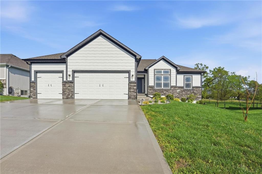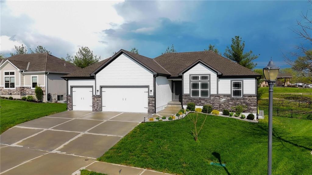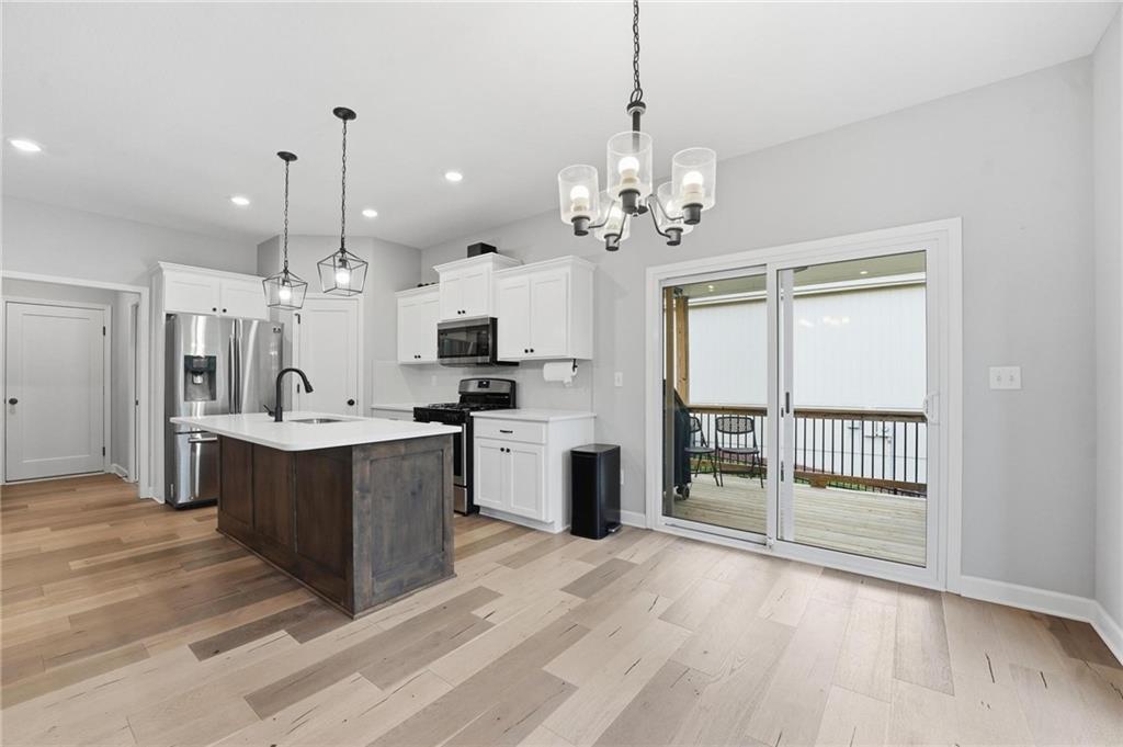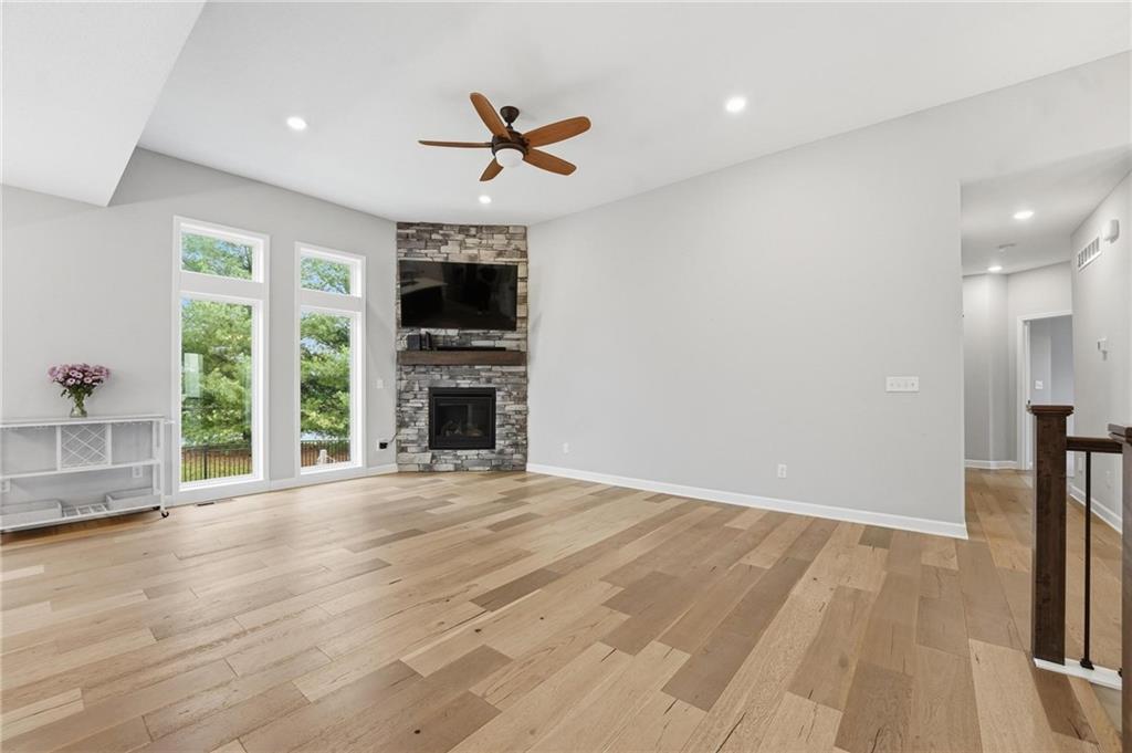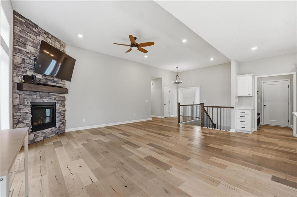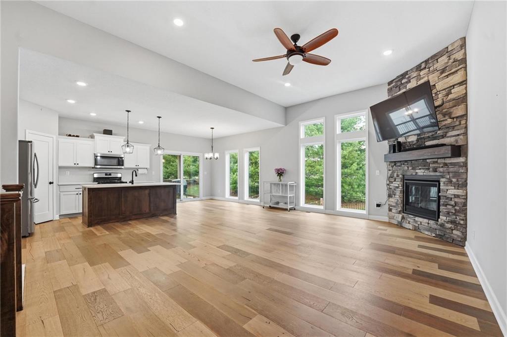 As you walk in, you are greeted by an open layout filled with natural light and clean, modern finishes. The living room centers around a stone fireplace and flows seamlessly into the kitchen with granite counters, an island, and pantry, giving you a space that works just as well for everyday living as it does for hosting.