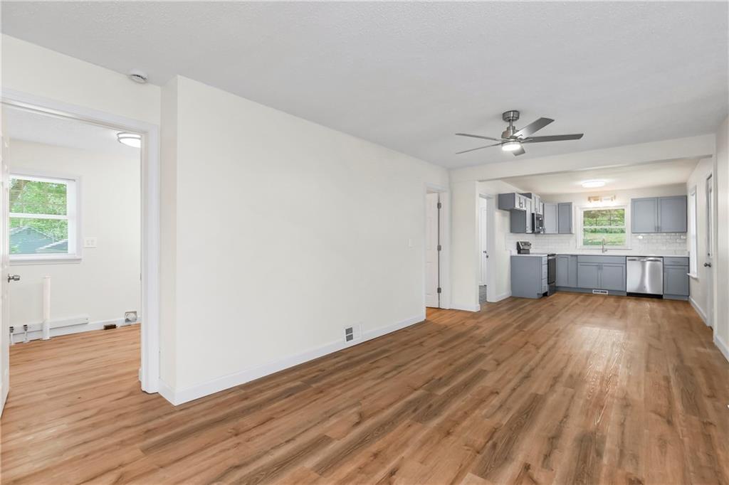 The bungalow home is a 902 sq ft ranch offering 2 bedrooms and 2 full baths with an open kitchen, dining and living area.