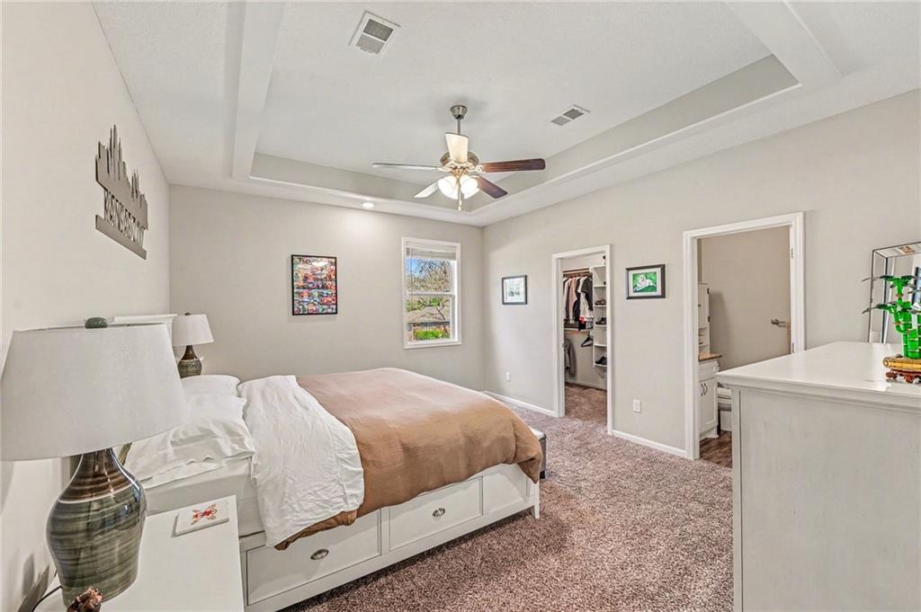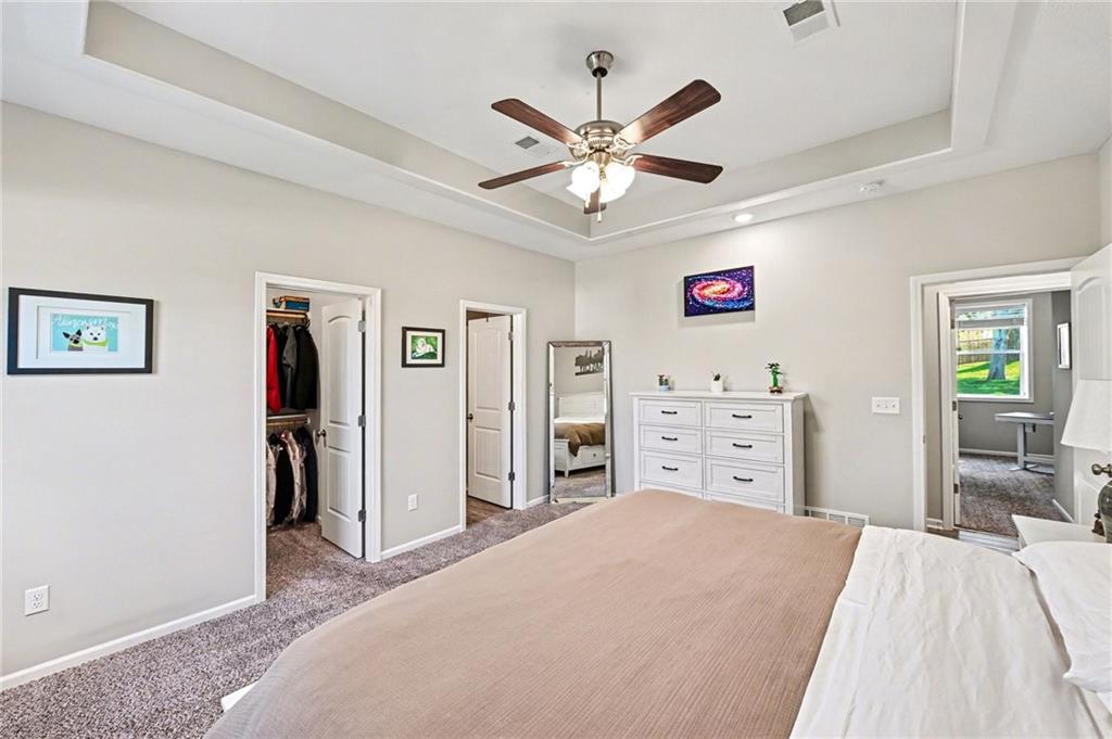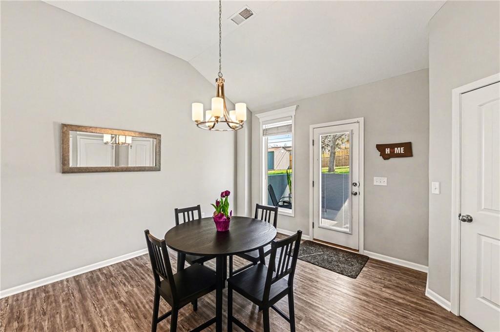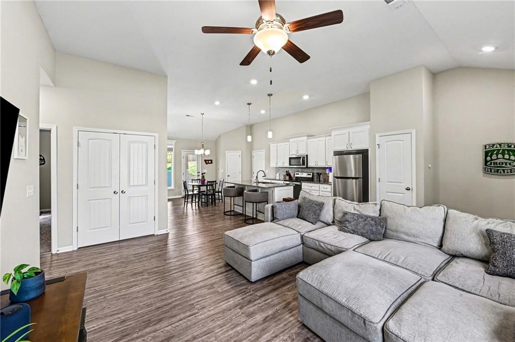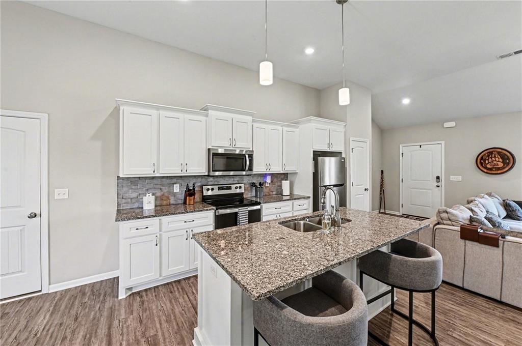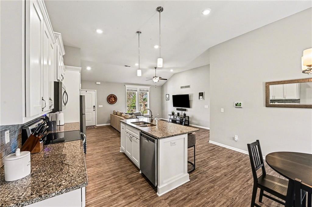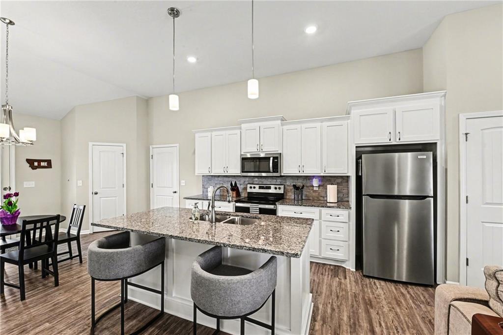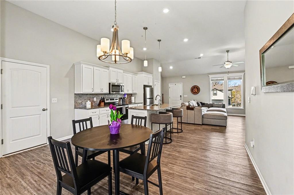 The kitchen boasts crisp white cabinetry, stainless steel appliances, a walk in pantry, and a dining area just off to the side. This open concept space flows nicely and provides plenty of room for everyday living and entertaining.