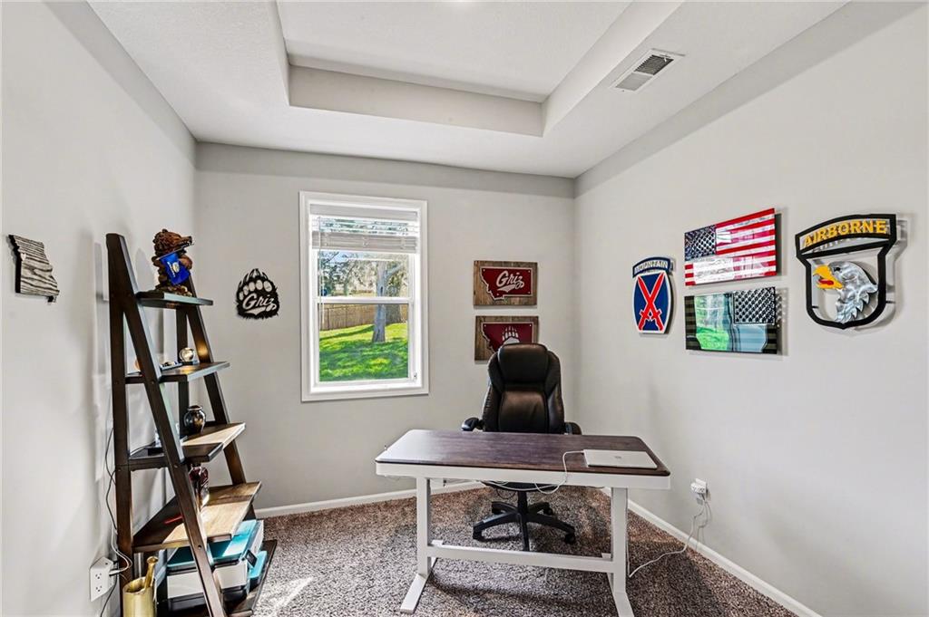 The primary bedroom features vaulted ceilings, a private full bathroom, and a walk in closet. Two additional bedrooms are located on the main floor, along with another full bathroom, a convenient laundry room, and a versatile bonus room that could be used as an office, playroom, or hobby space.