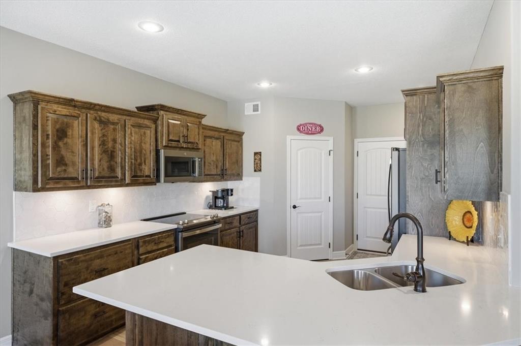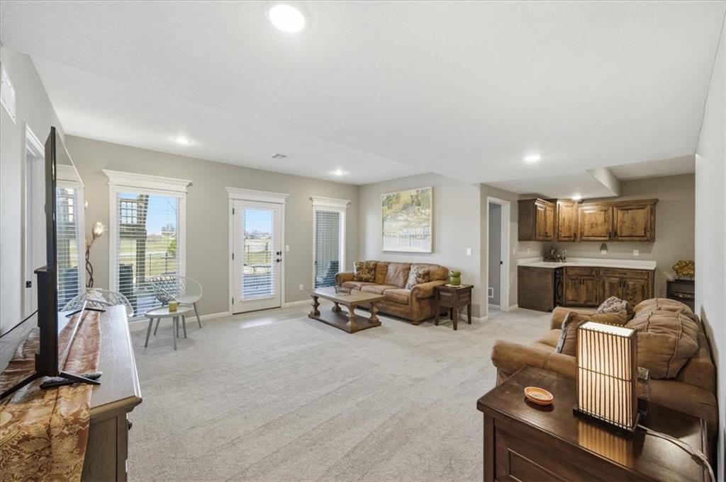 The kitchen includes a spacious walk-in pantry, and just beyond, an extended deck steps down to a patio and fenced backyard—perfect for entertaining. The finished lower level features two more bedrooms, a full bath, a large rec room with an entertainment bar, and abundant storage, including a seasonal closet. An in-ground sprinkler system completes the home’s convenience and curb appeal.