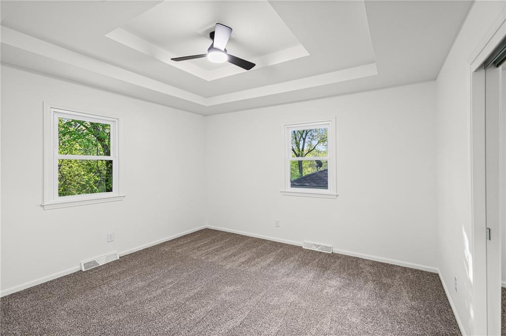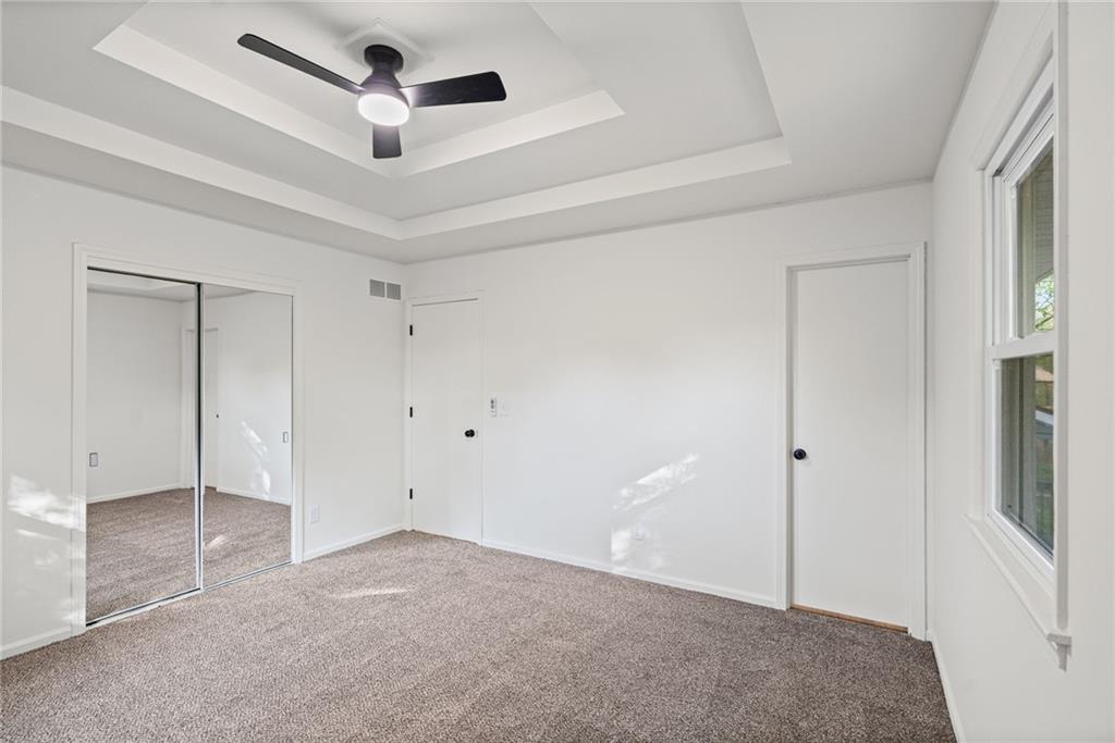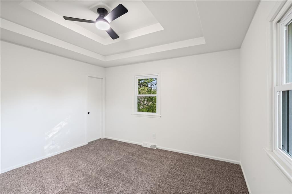 The living room is anchored by a stone fireplace with black mantel. Upstairs, three bedrooms with tray ceilings and fresh carpet. Primary suite has its own private bath.